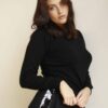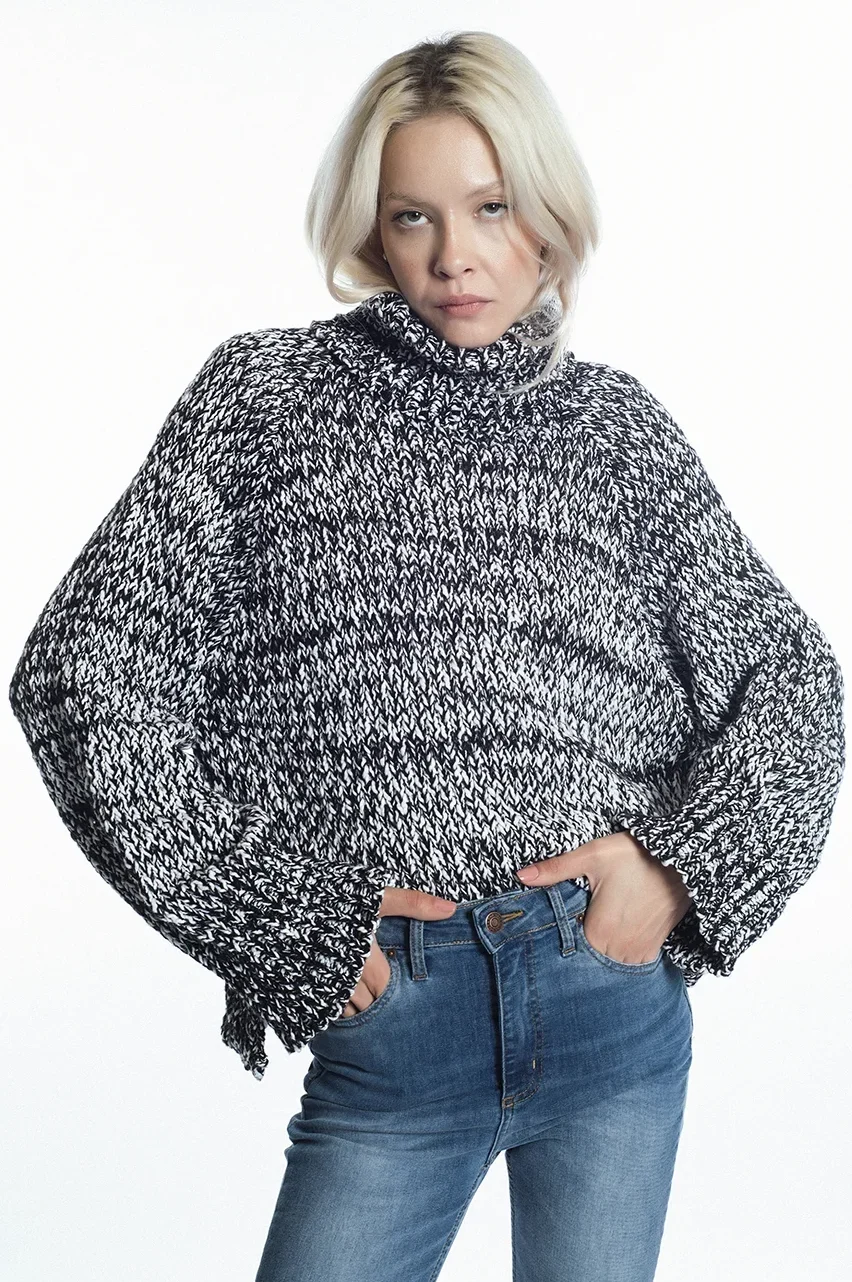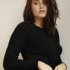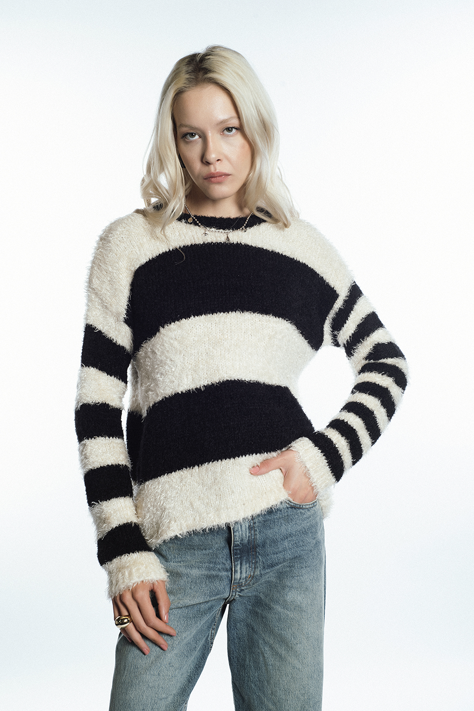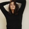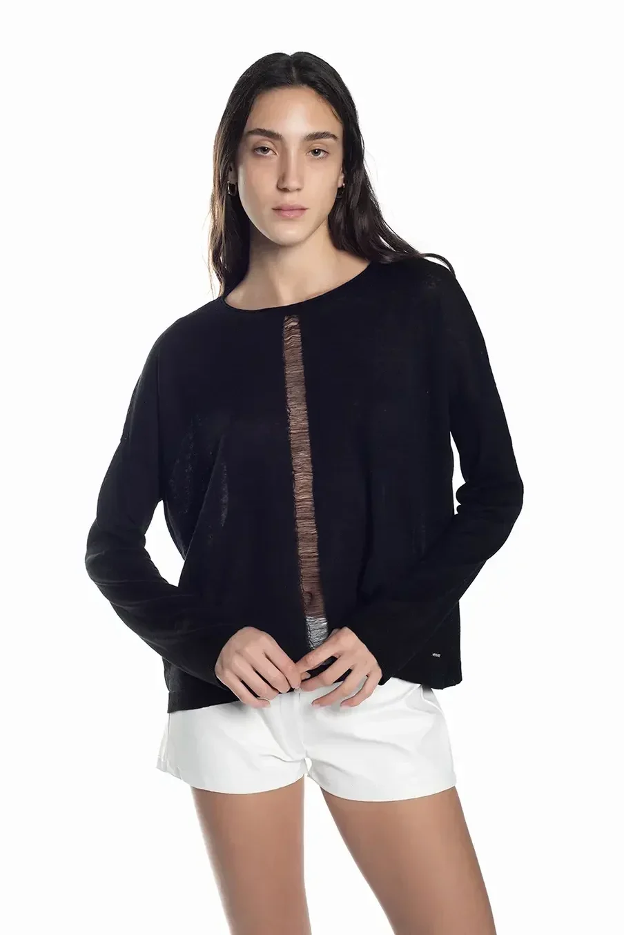 Sweater cuello redondo y manga larga de punto fino elastizado, confeccionado en lurex color negro.