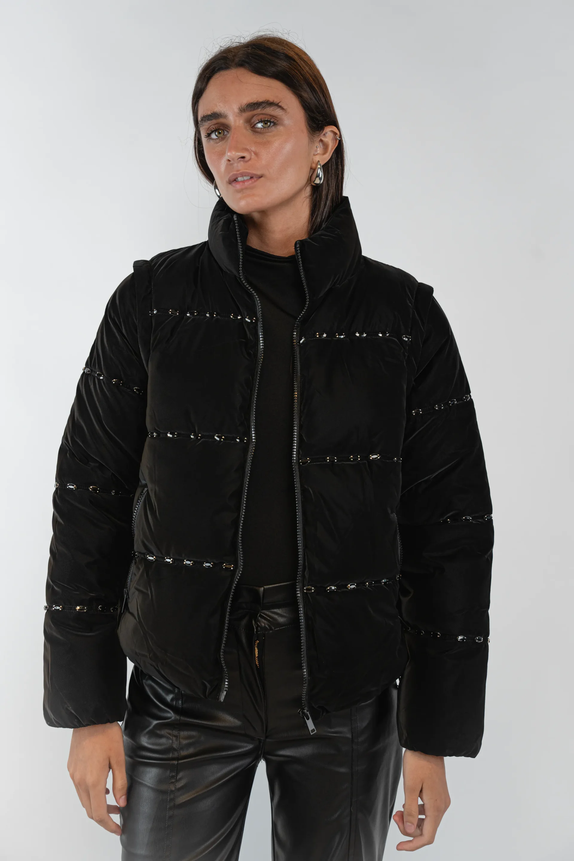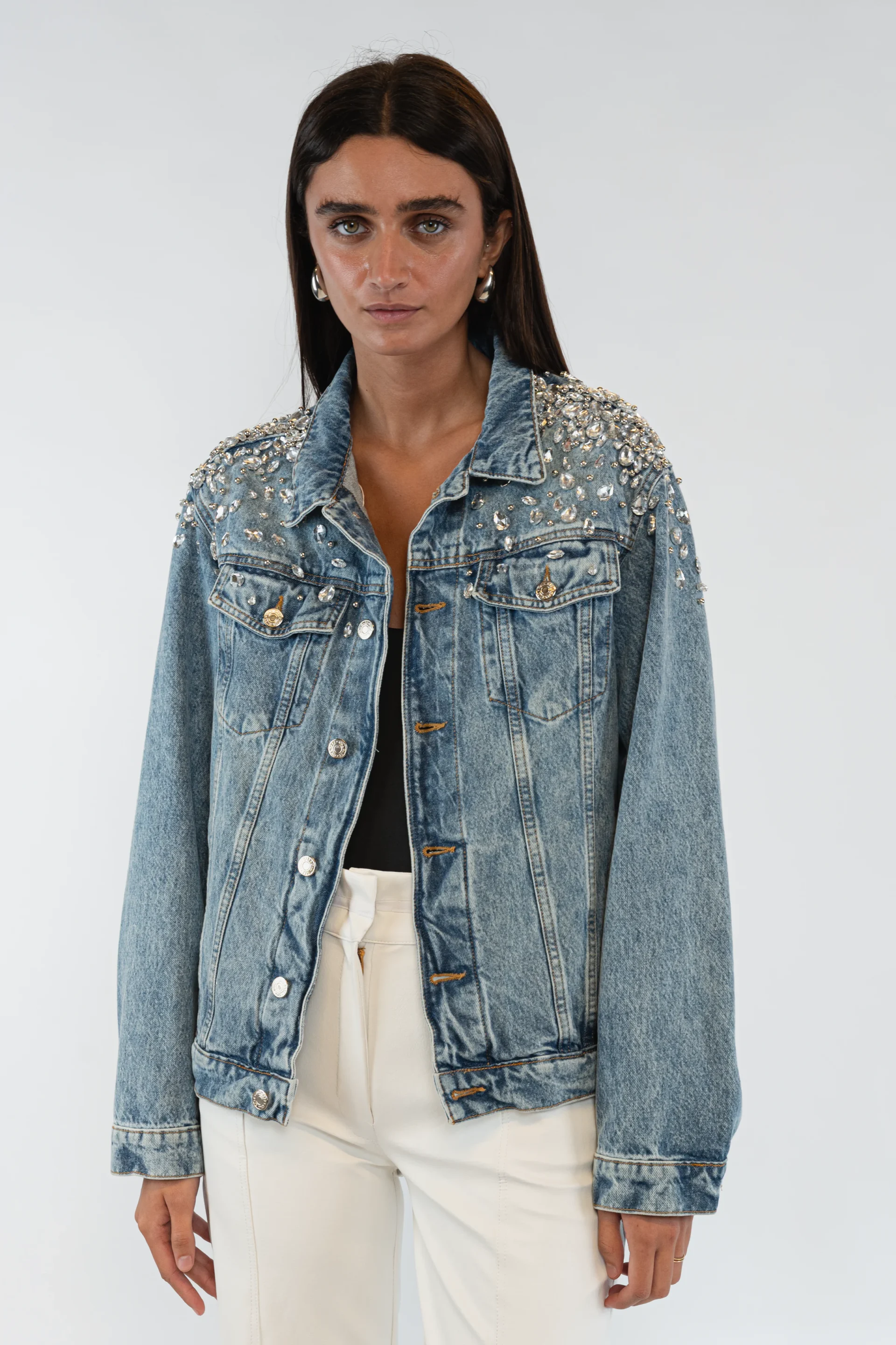 Las camperas de nuestra línea Embellished combinan el arte del bordado manual con un meticuloso trabajo artesanal. Cada piedra es aplicada individualmente para formar patrones que juegan con la luz y resaltan la textura del diseño.