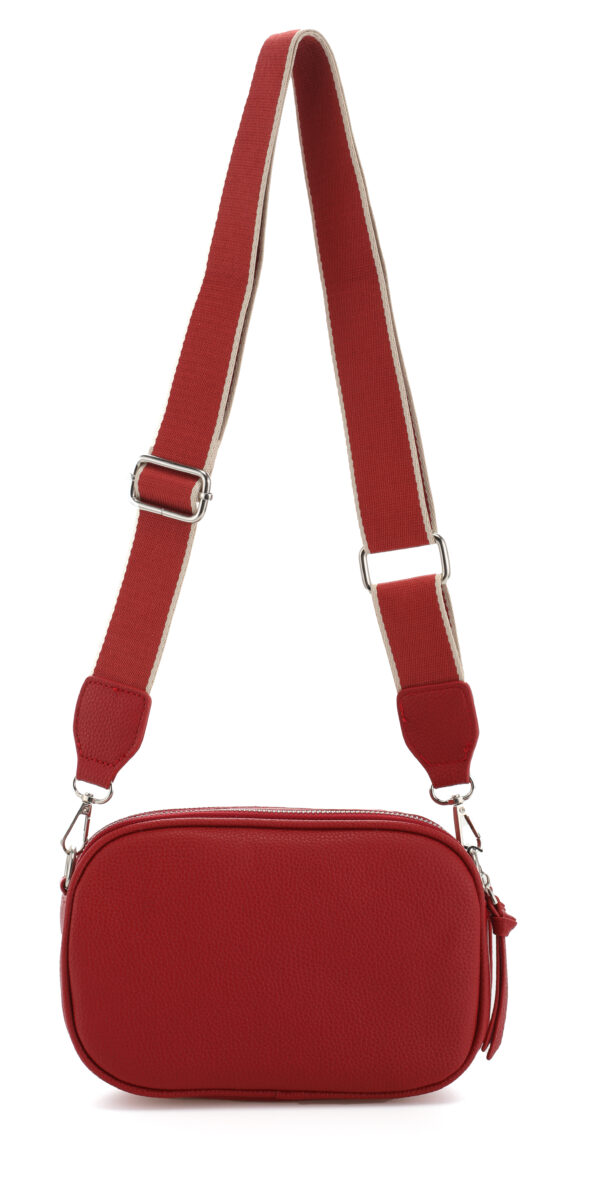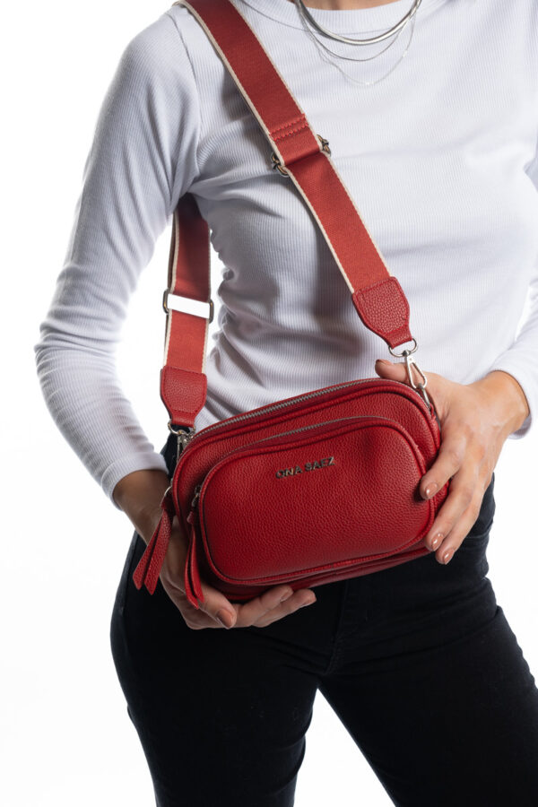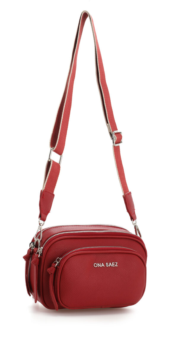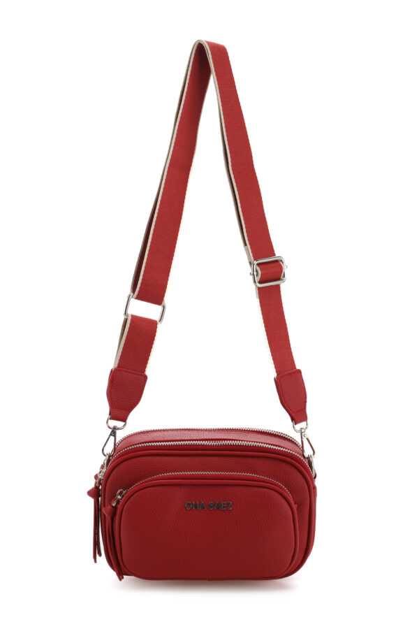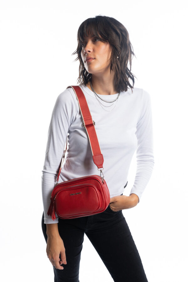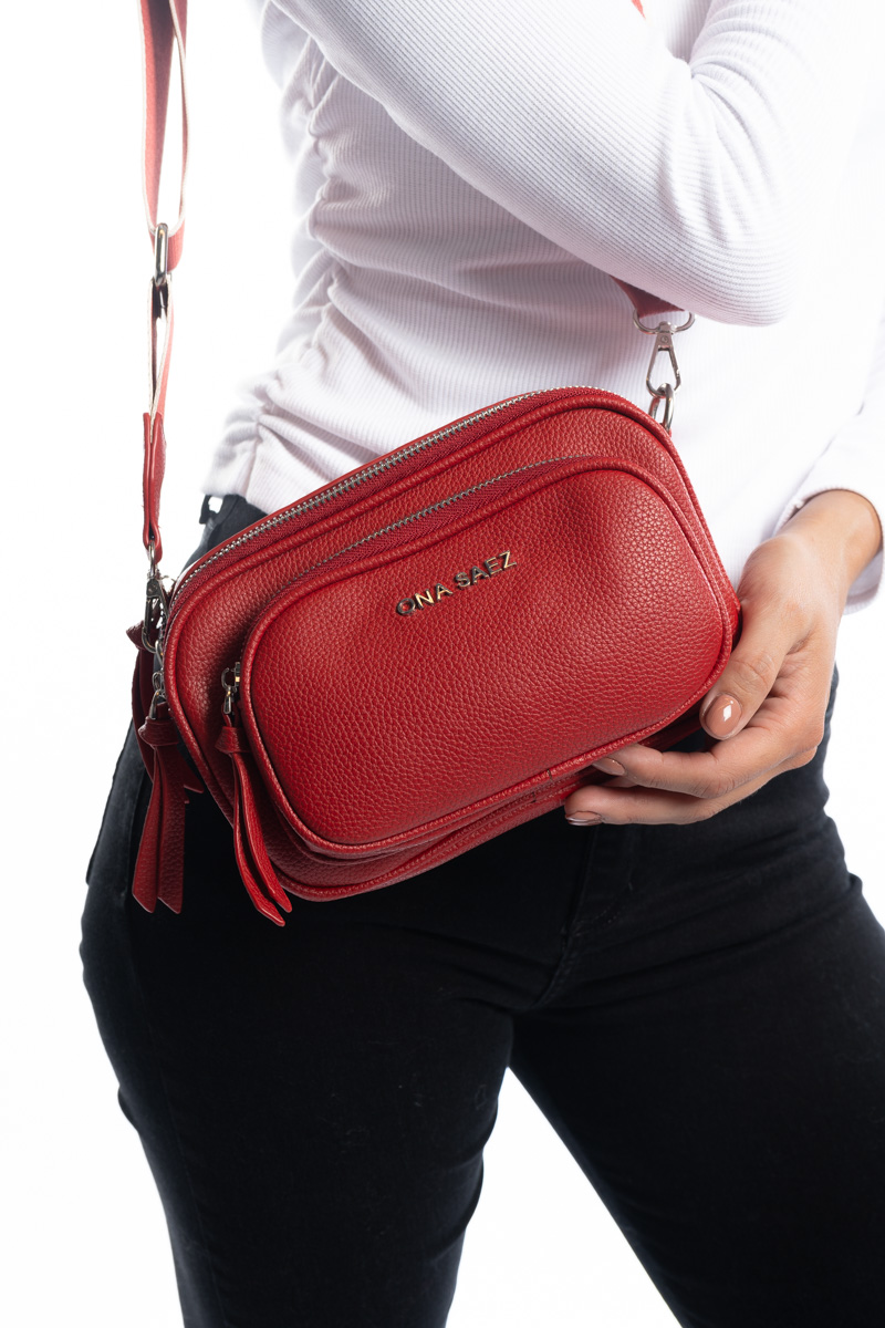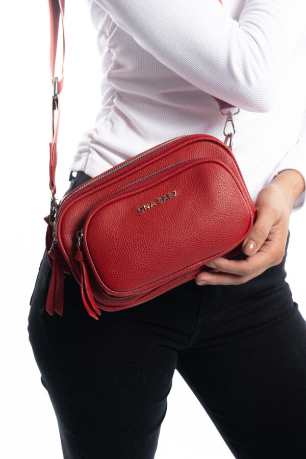 Bandolera confeccionada en P U (simil cuero) color roja. Tiene un diseño moderno y funcional con múltiples compartimentos con cierre de cremallera, lo que permite una mejor organización.