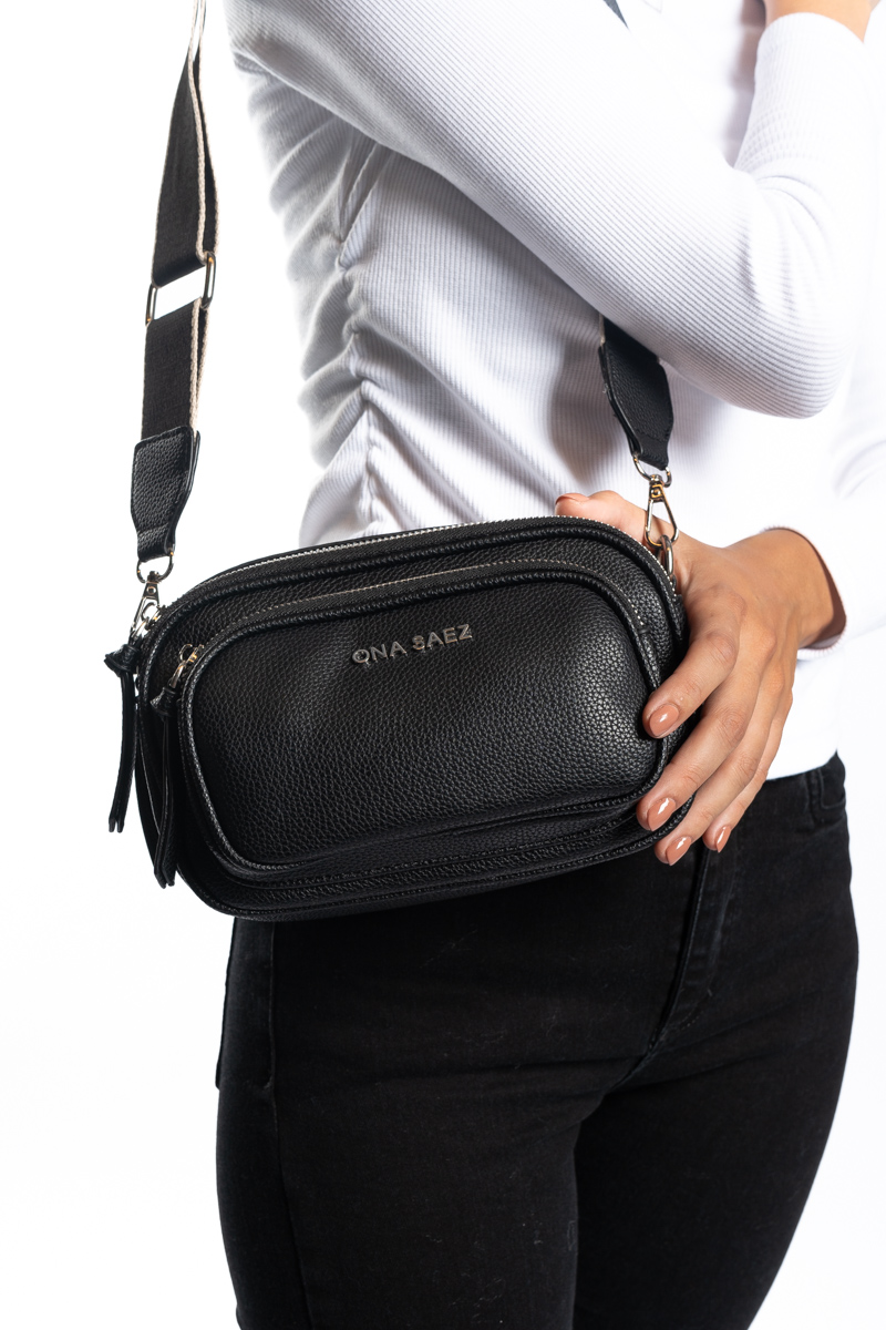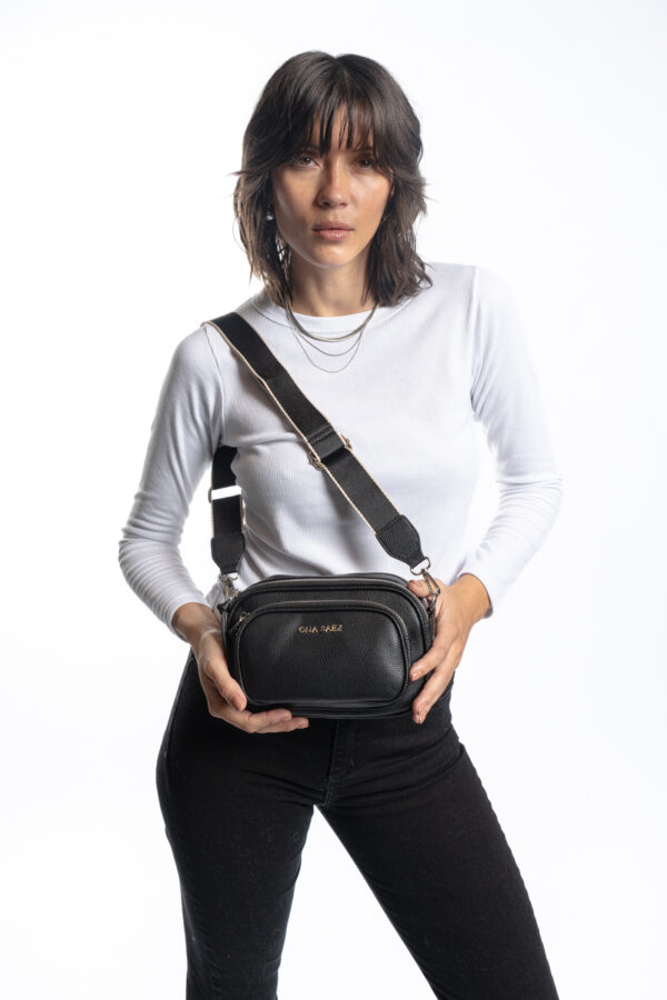 Bandolera confeccionada en P U (simil cuero) color negra. Tiene un diseño moderno y funcional con múltiples compartimentos con cierre de cremallera, lo que permite una mejor organización.
