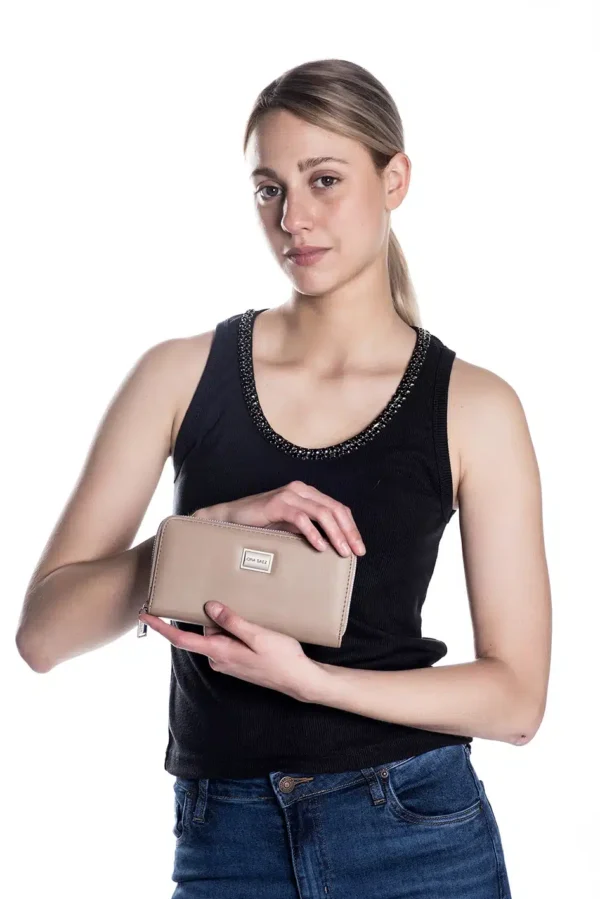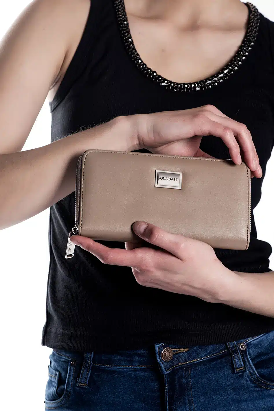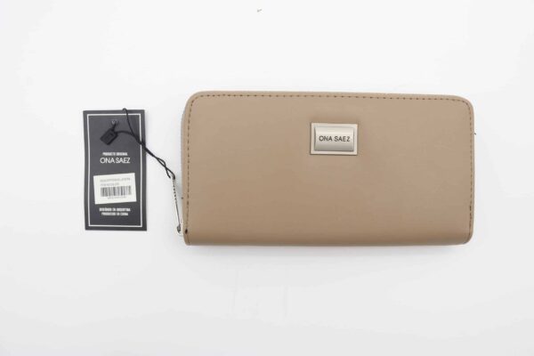 Billetera confeccionada en pu (simil cuero) color vison, con chapa de logo de marca en el frente.
