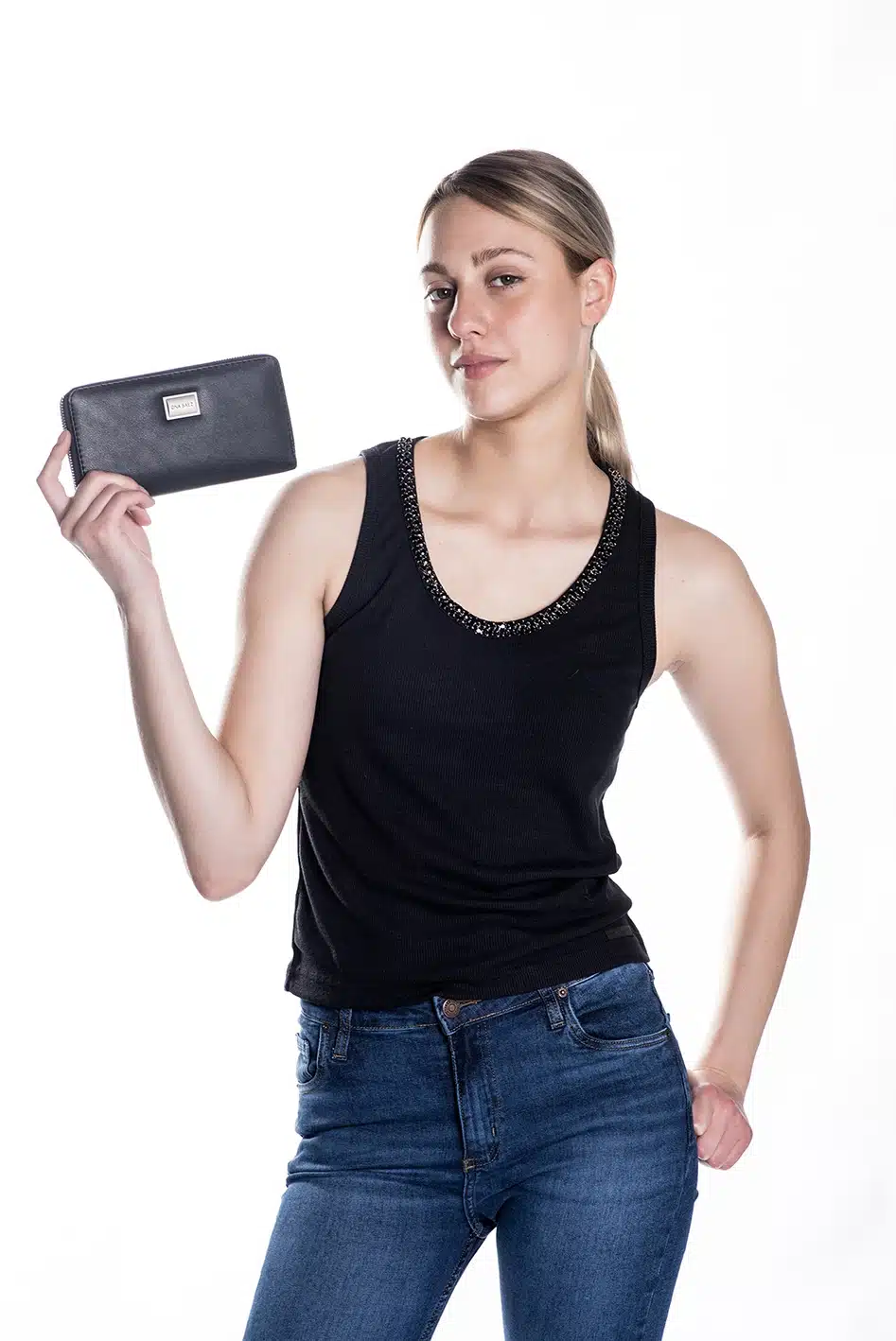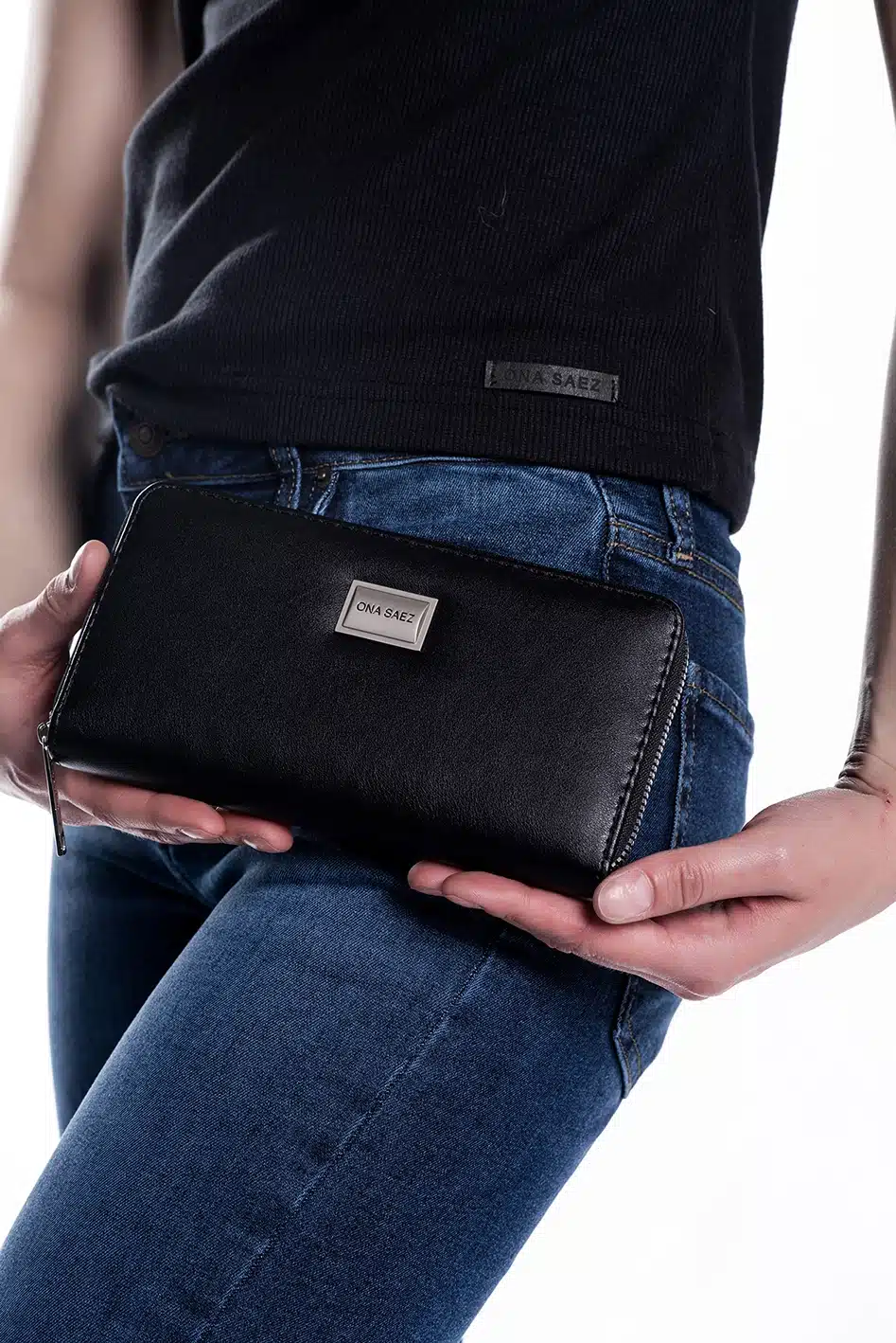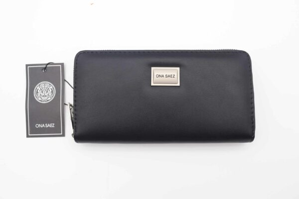Billetera confeccionada en pu (simil cuero) color negra, con chapa de logo de marca en el frente.