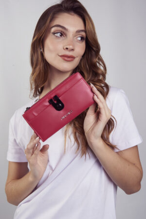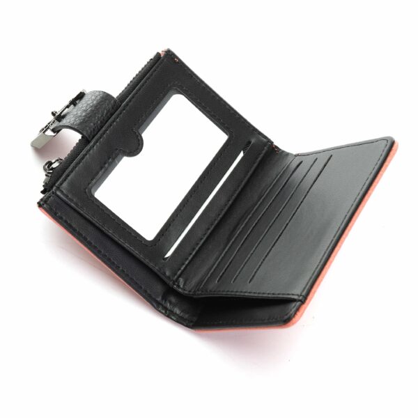 Sistema de apertura con broche frontal y cierre y múltiples ranuras para tarjetas, espacio para billetes y monedas.
