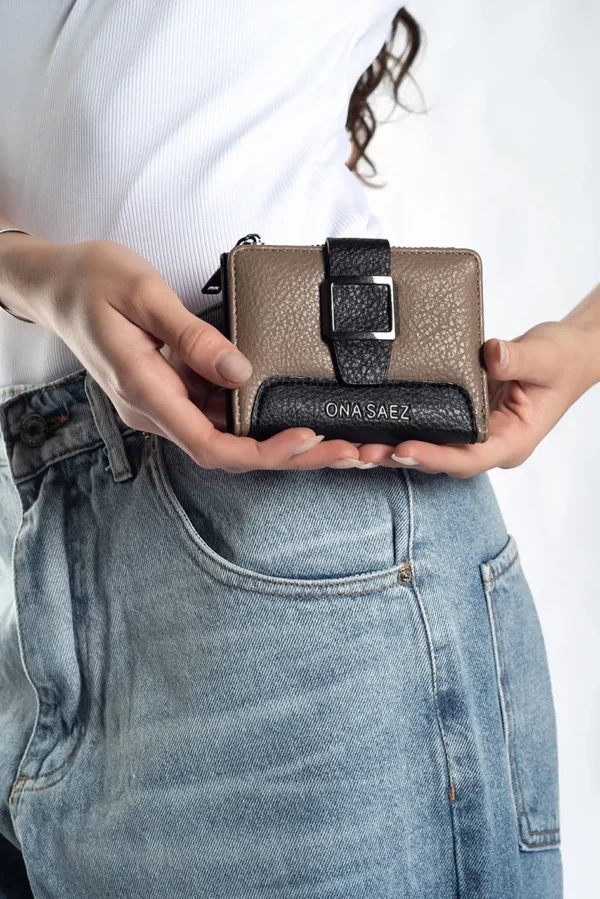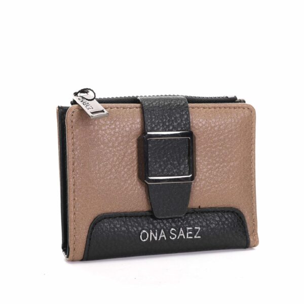 Billetera confeccionada en pu (simil cuero) color vison con negro, con logo de marca en el frente.