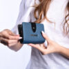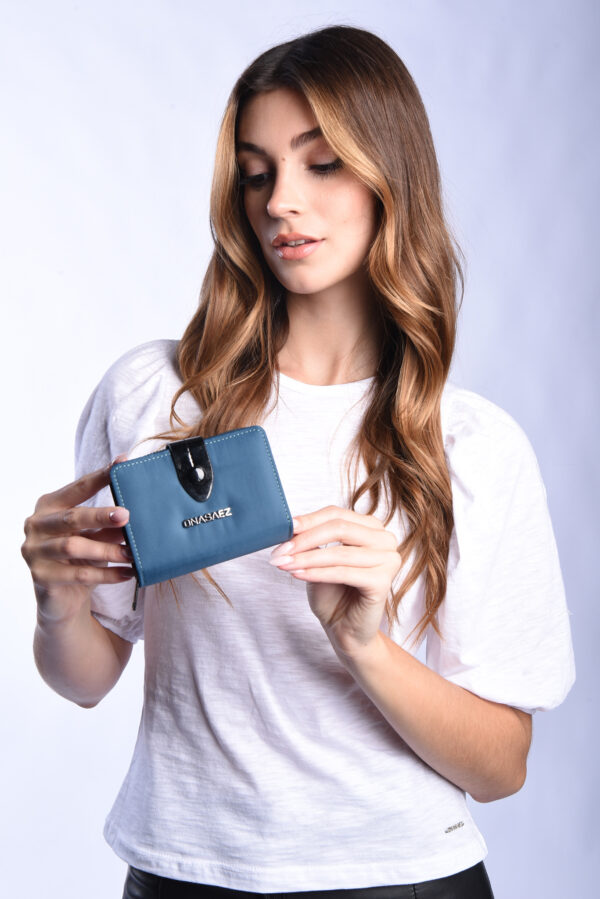 Billetera confeccionada nylon 100% color azul, con logo de marca en el frente.