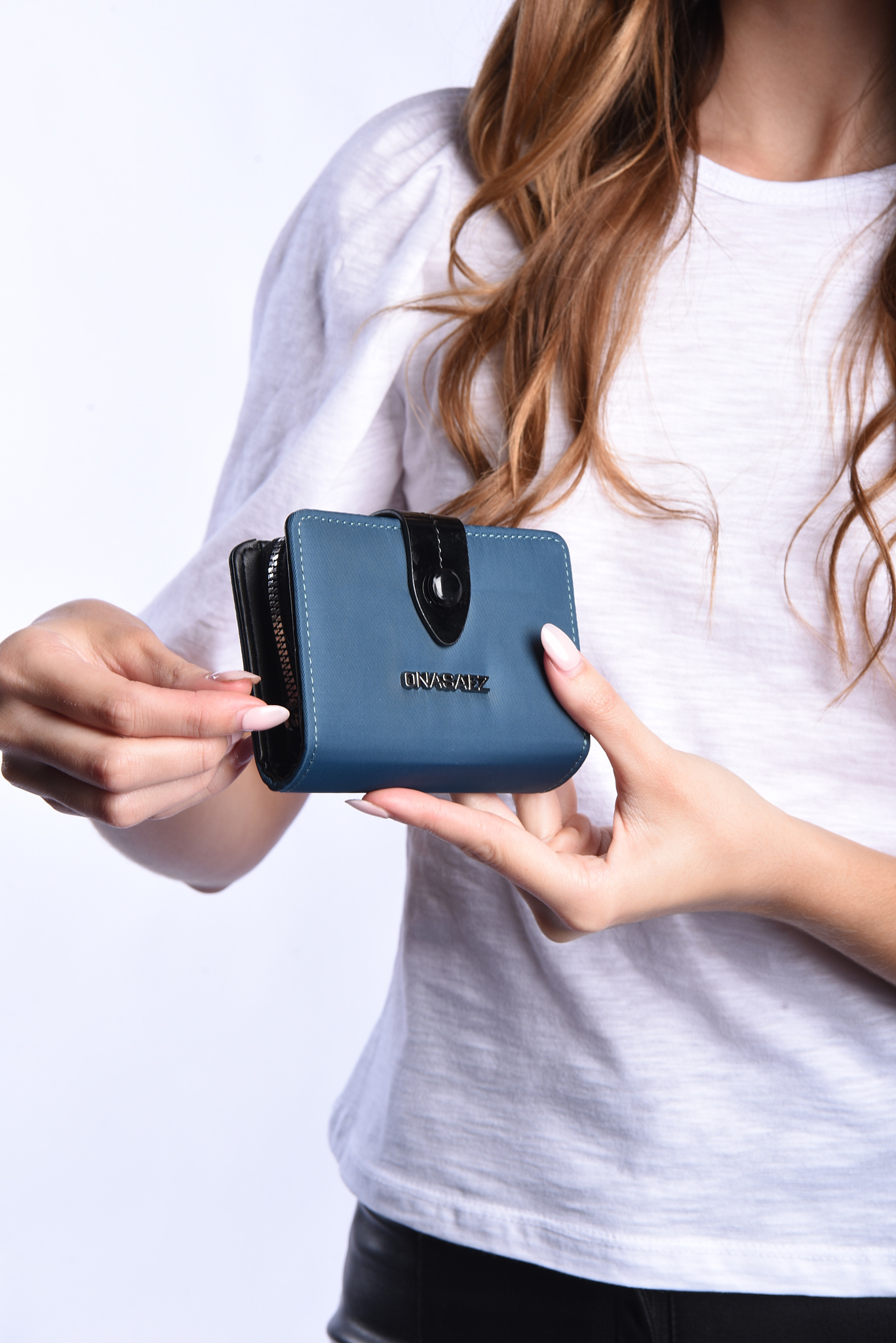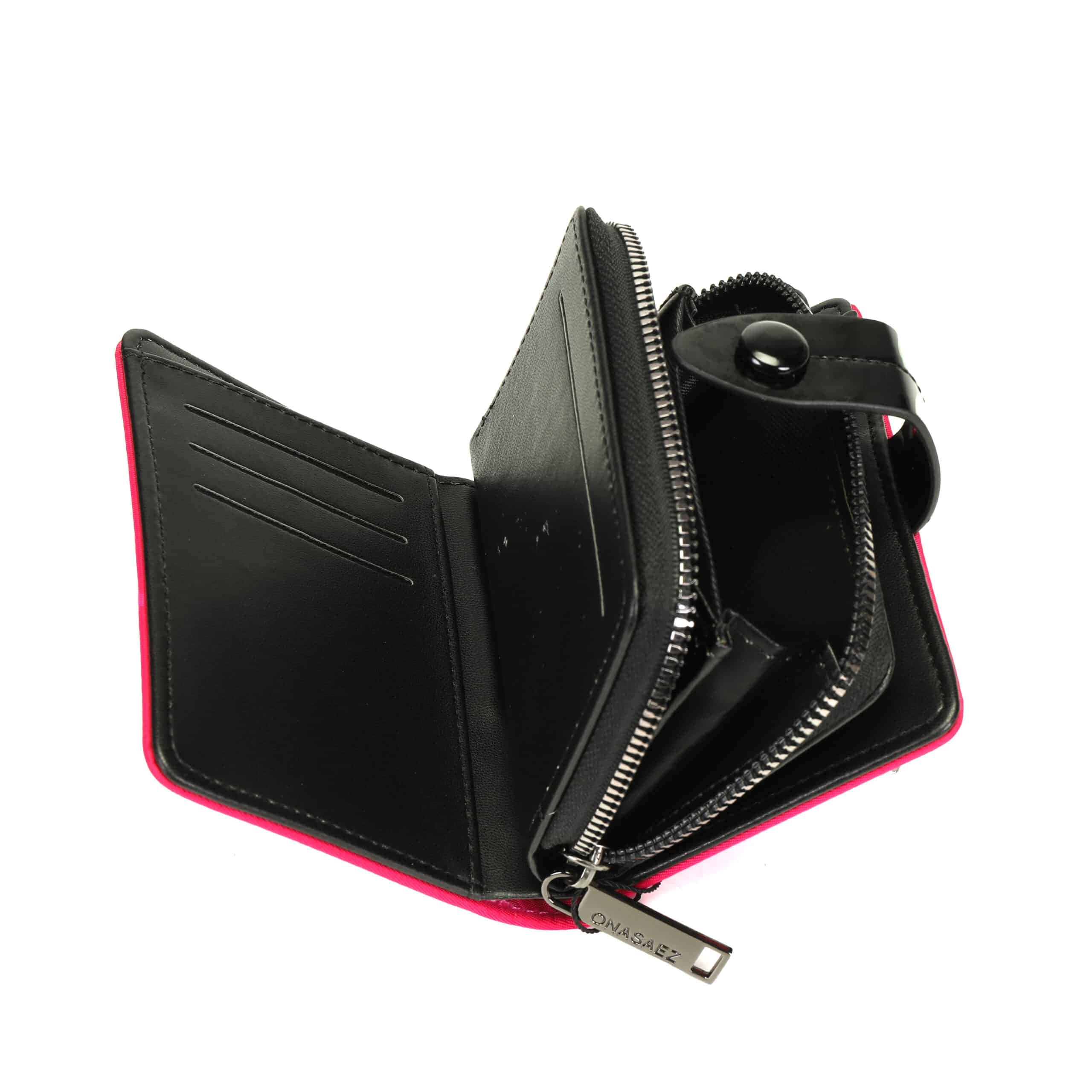 Sistema de apertura con broche frontal y cierre, y múltiples ranuras para tarjetas, espacio para billetes y monedas.