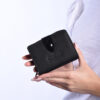Sistema de apertura con broche frontal y cierre, y múltiples ranuras para tarjetas, espacio para billetes y monedas.