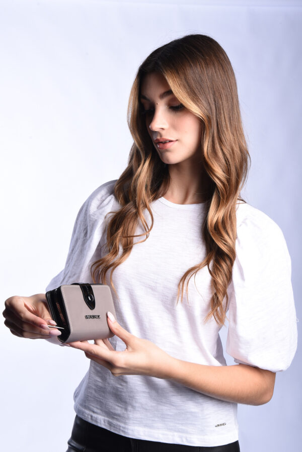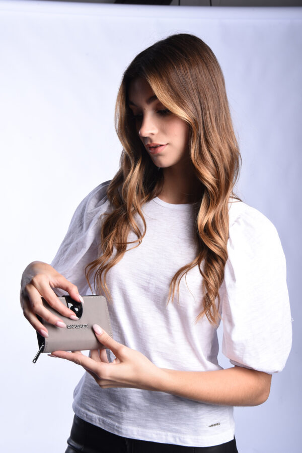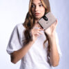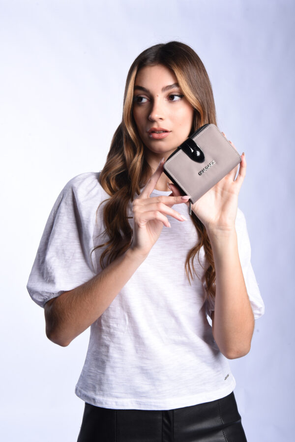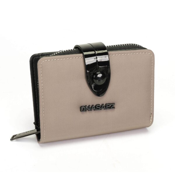 Billetera confeccionada nylon 100% color arena, con logo de marca en el frente.