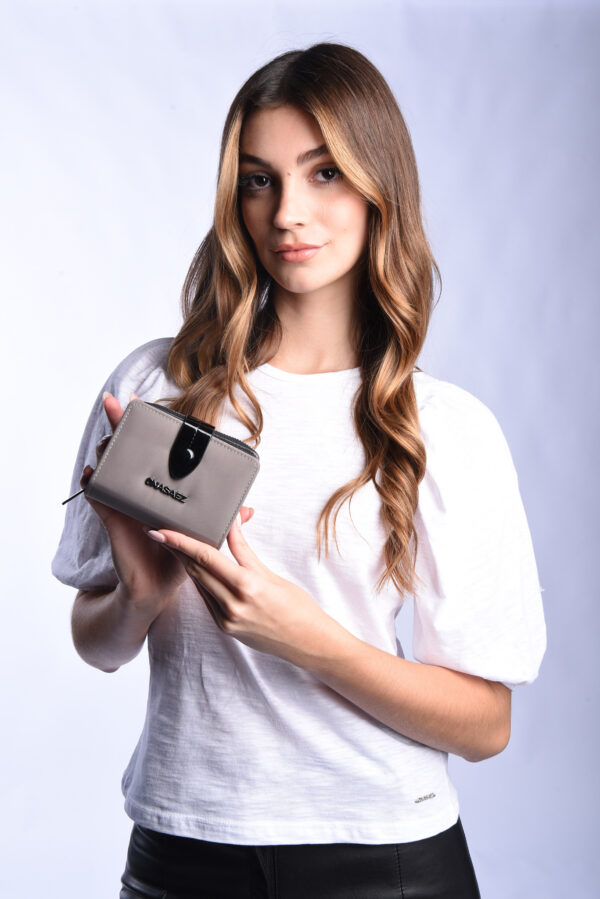 Sistema de apertura con broche frontal y cierre, y múltiples ranuras para tarjetas, espacio para billetes y monedas.