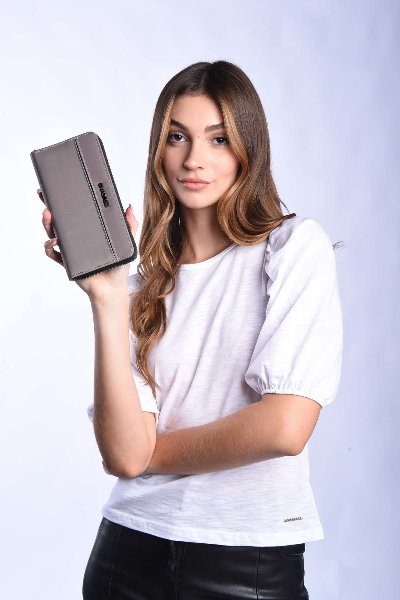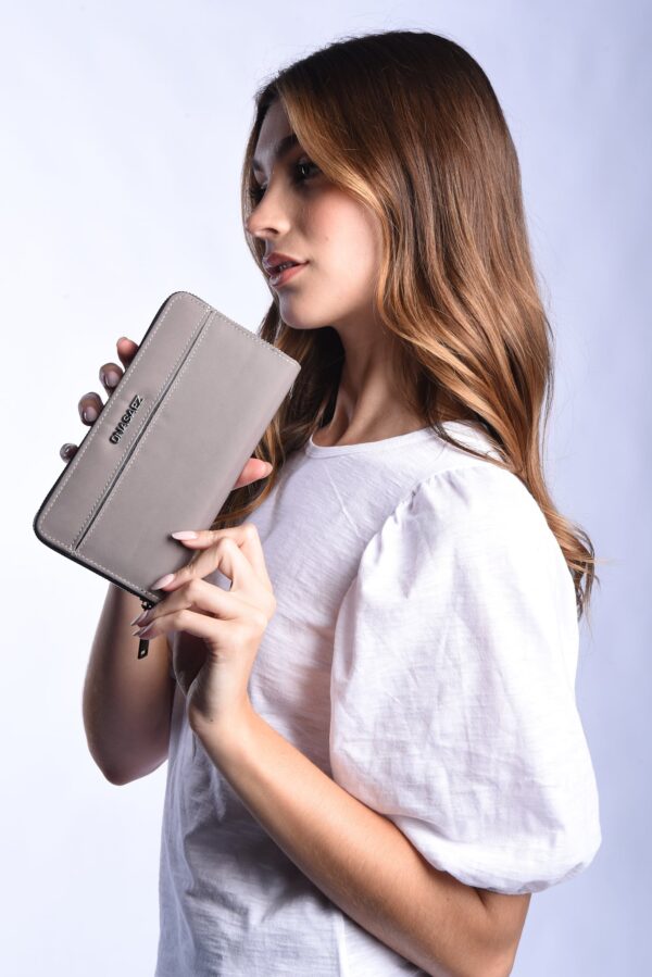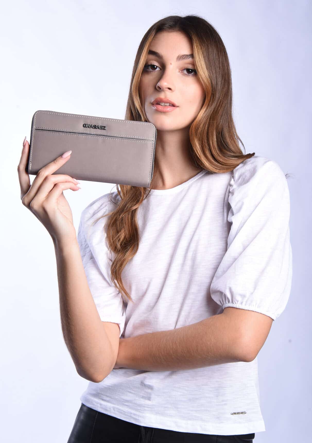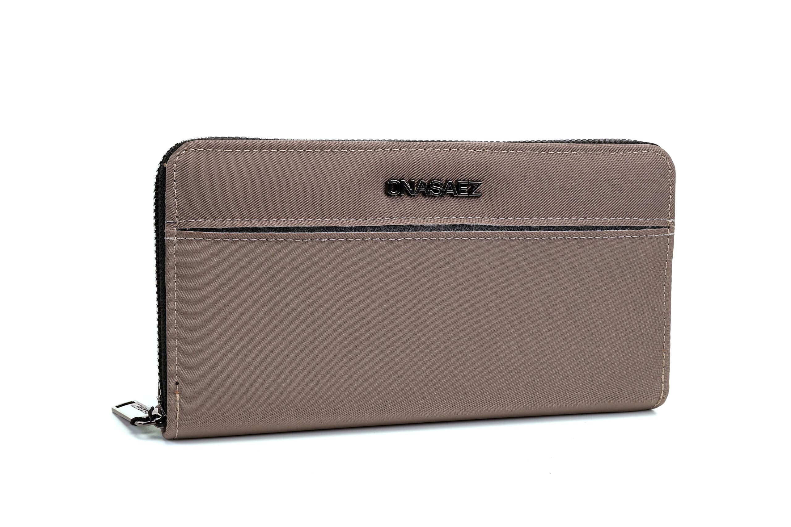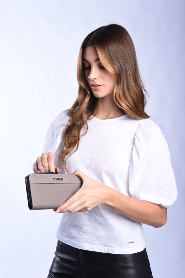 Billetera combinada en pu color beige, con chapa de logo de marca en el frente.