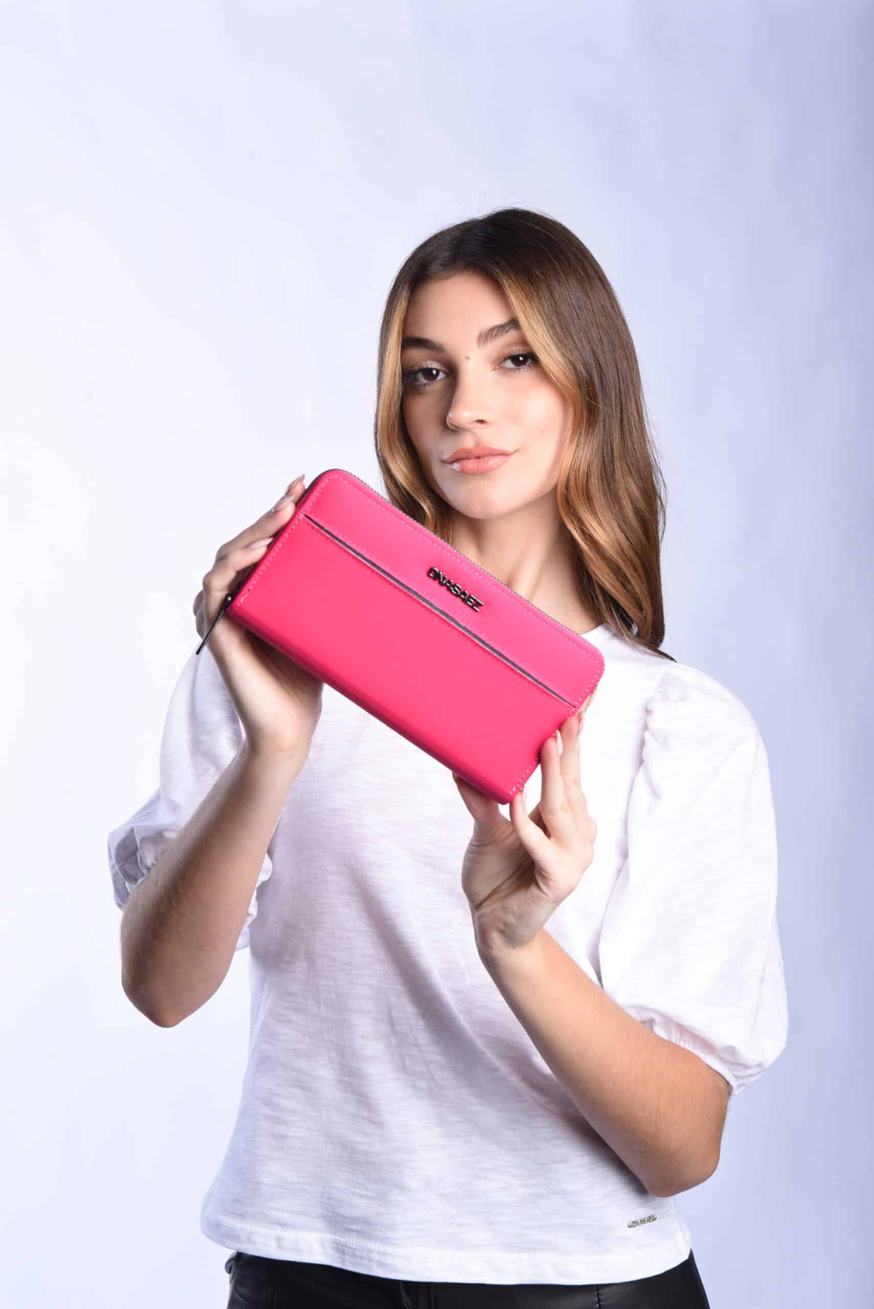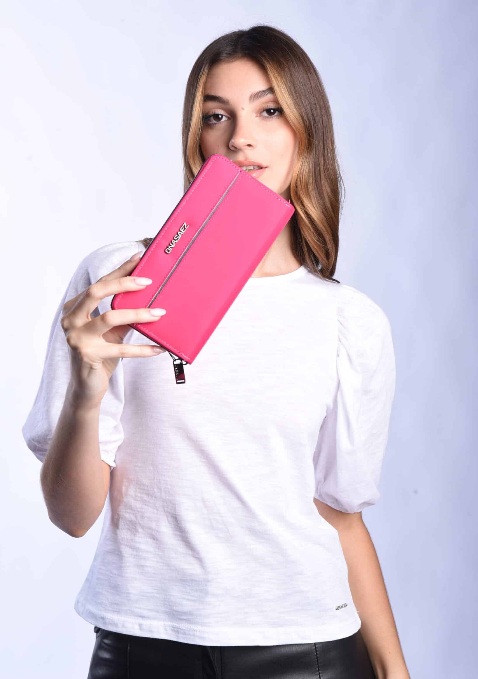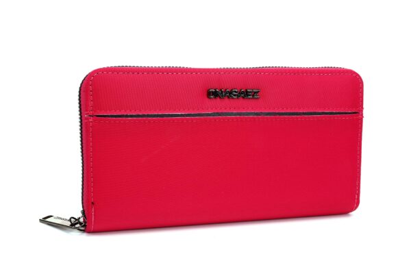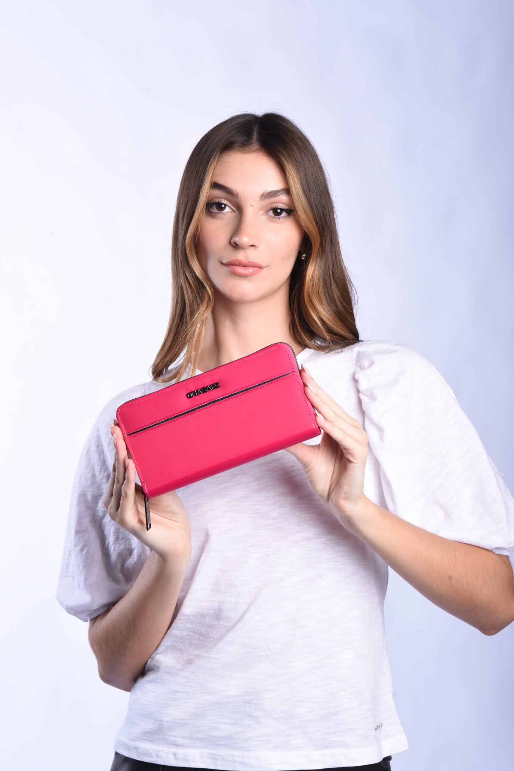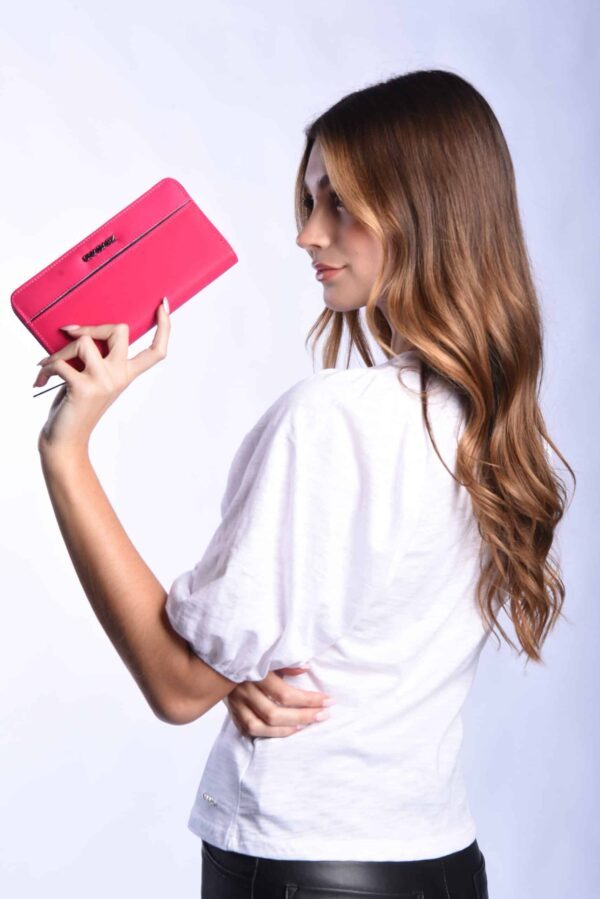 Billetera combinada en pu color fucsia, con chapa de logo de marca en el frente.