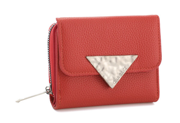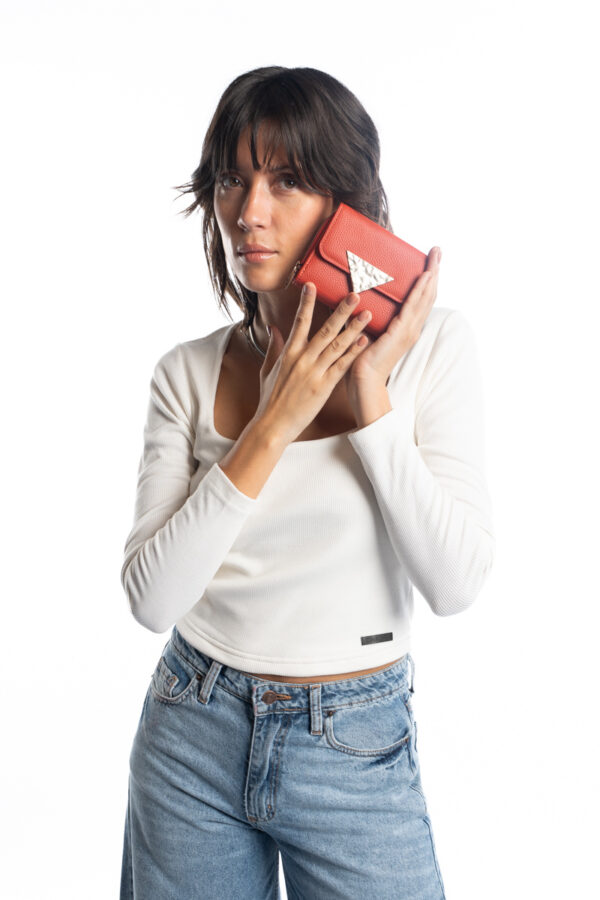 Billetera confeccionada en P U (simil cuero) color verde roja, con sistema de apertura con broche frontal y cierre, y múltiples ranuras para tarjetas, espacio para billetes y monedas.