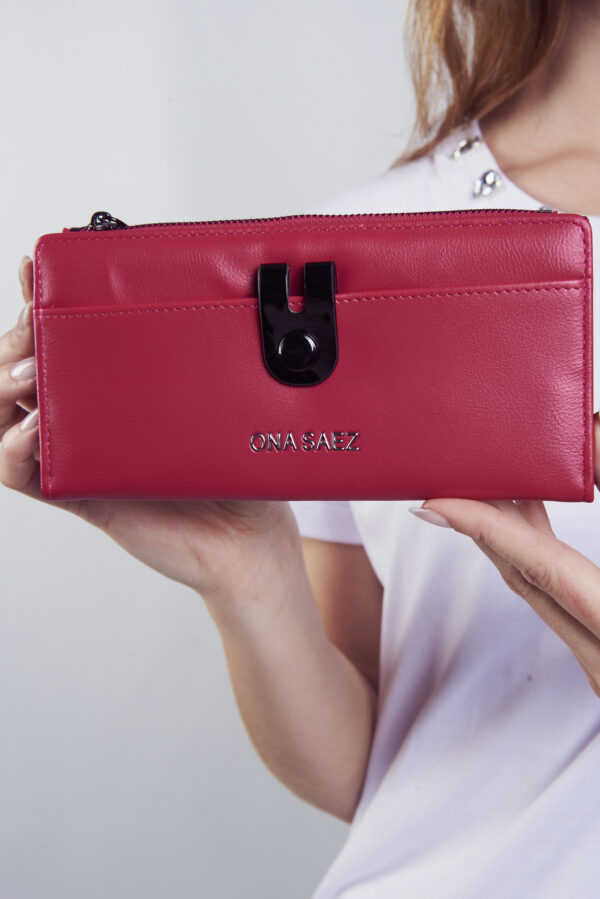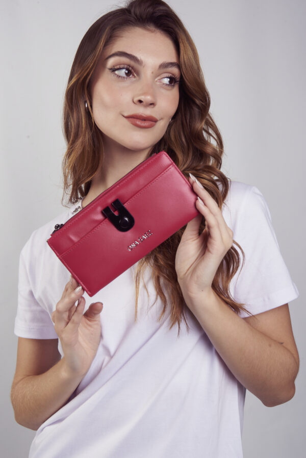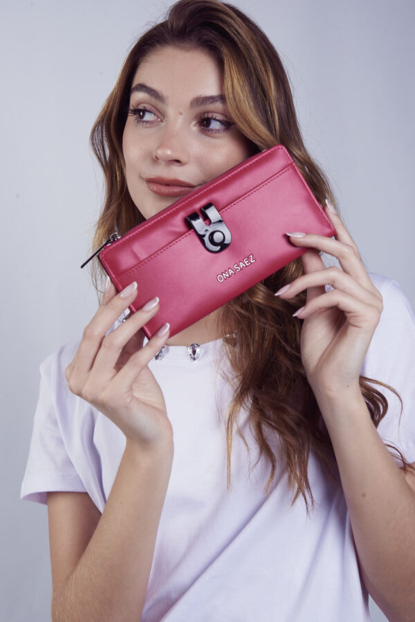 Billetera confeccionada en pu (simil cuero) color fucsia, con logo de marca grabado en el frente.