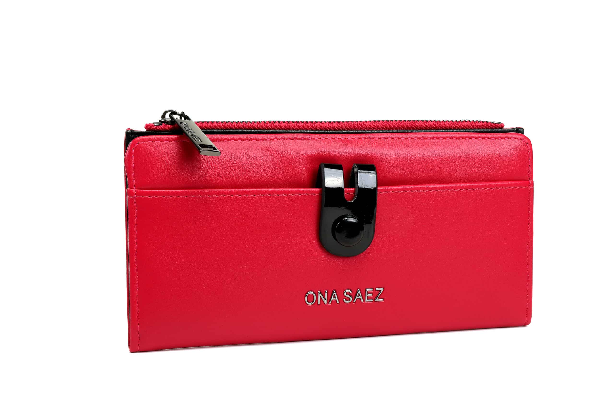 Sistema de apertura con broche frontal y cierre, y múltiples ranuras para tarjetas, espacio para billetes y monedas.