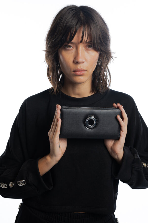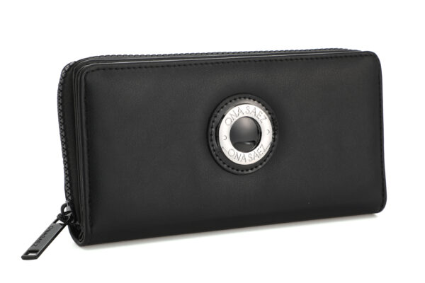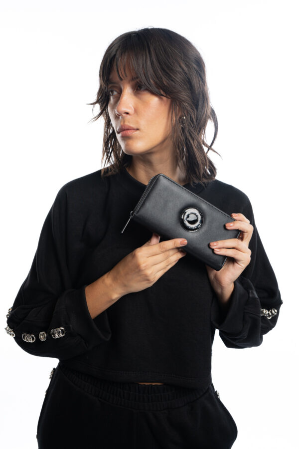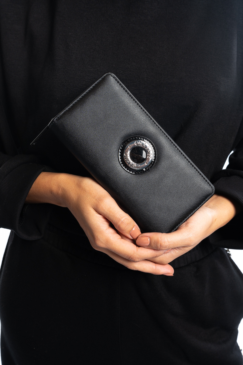 Billetera confeccionada en PU (símil cuero) color negra, con aplique de logo de marca en el frente.