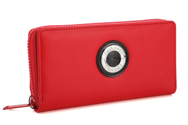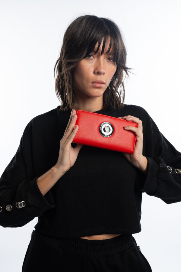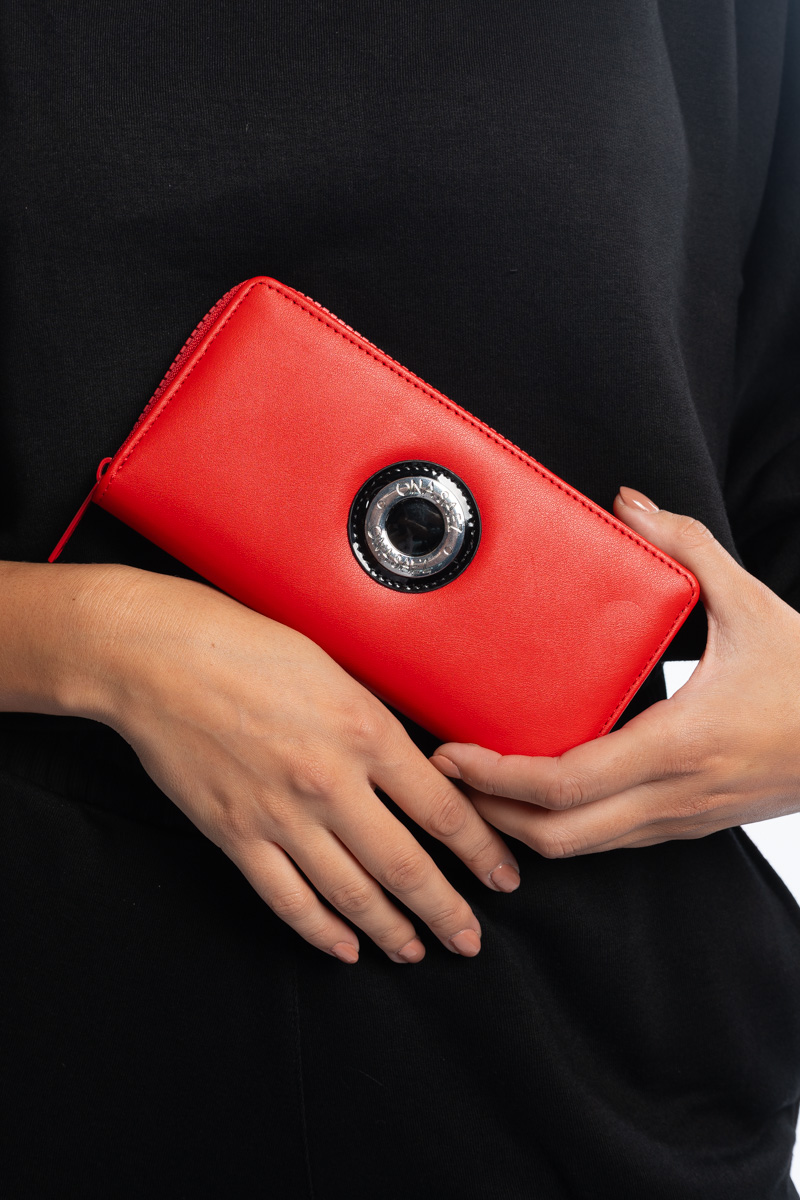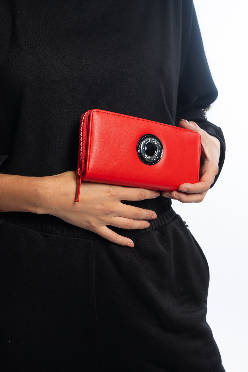 Billetera confeccionada en PU (símil cuero) color roja, con aplique de logo de marca en el frente.