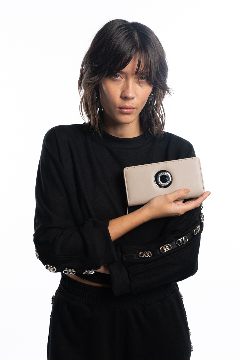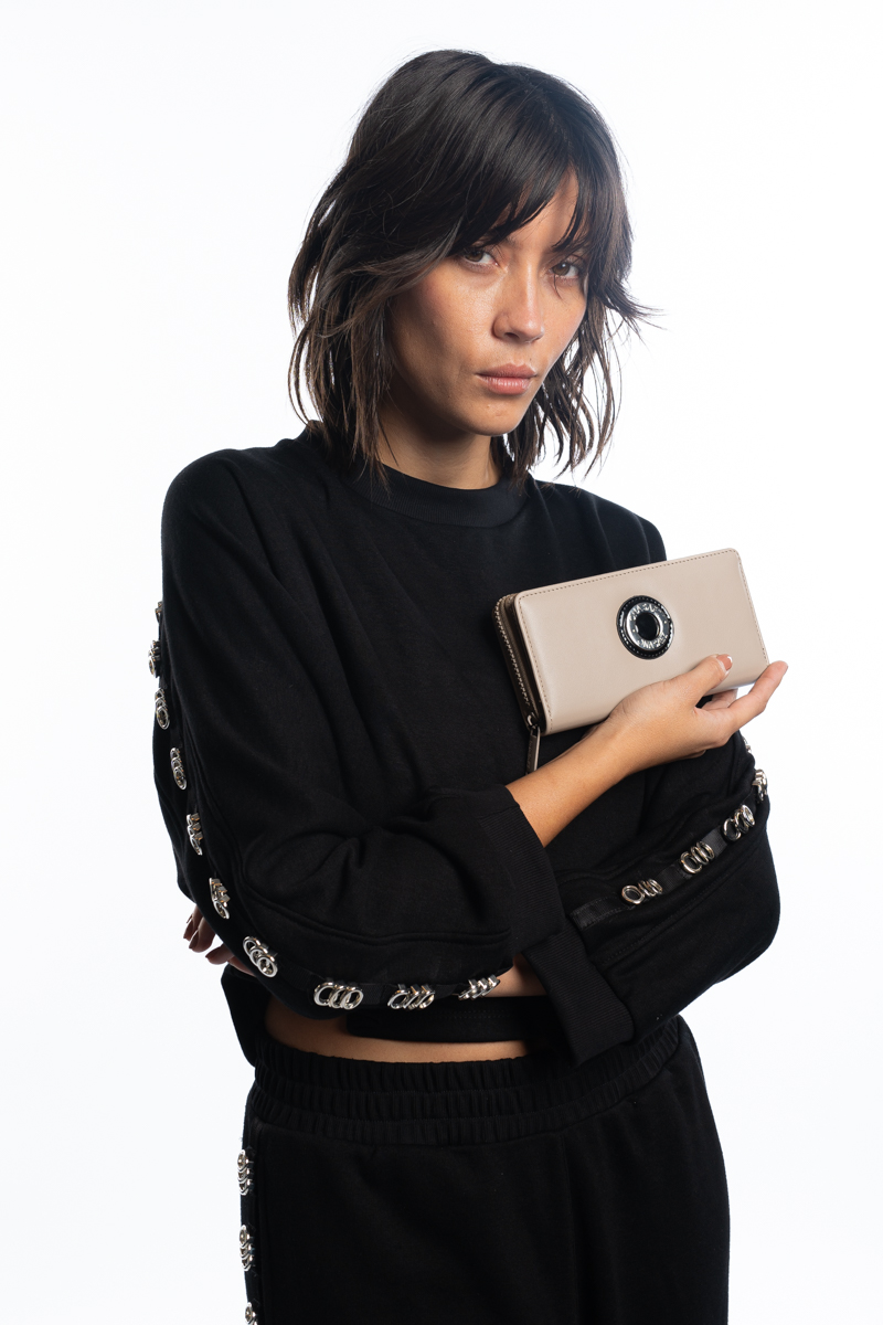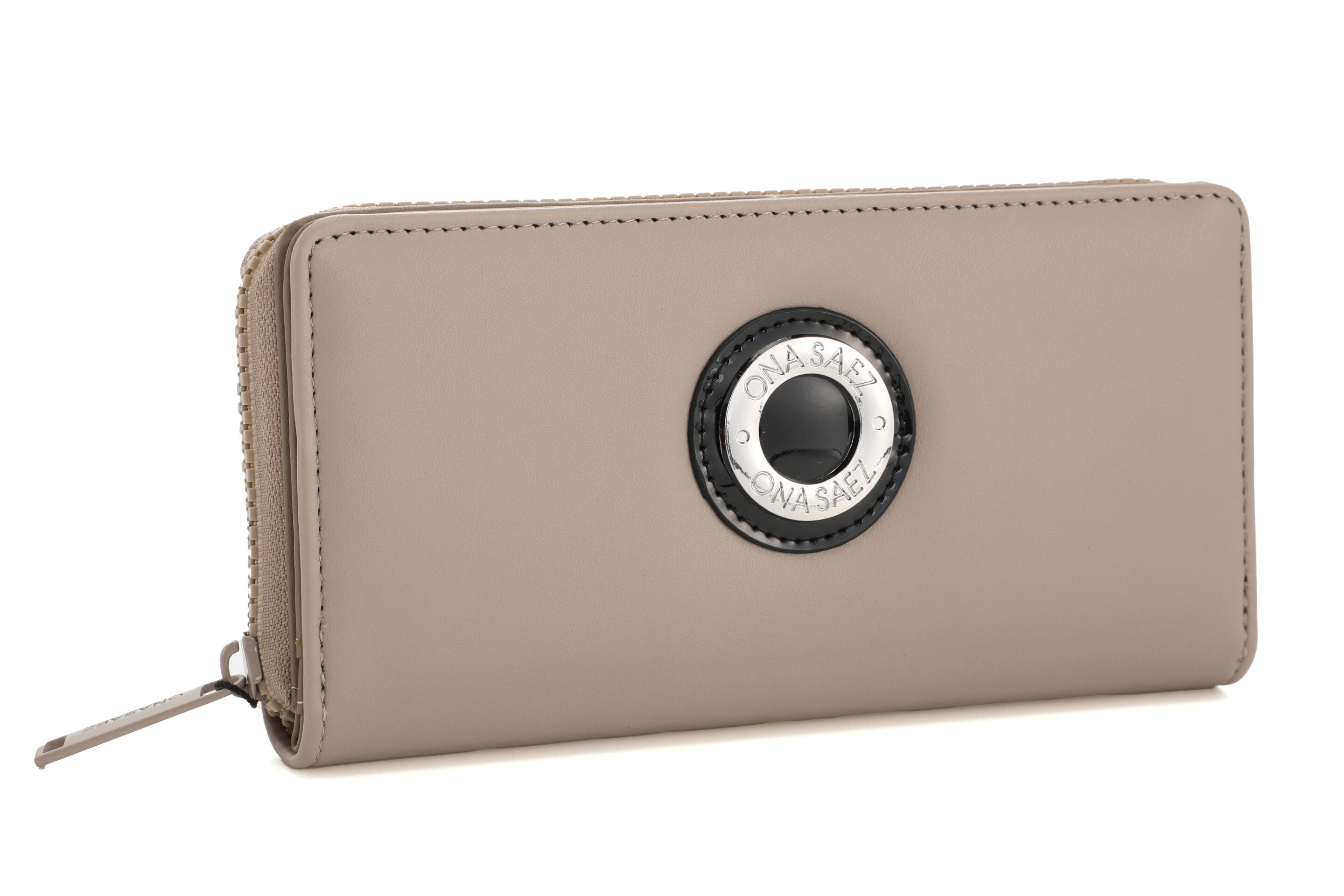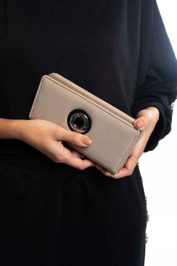 Billetera confeccionada en PU (símil cuero) color beige, con aplique de logo de marca en el frente.