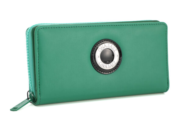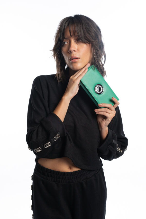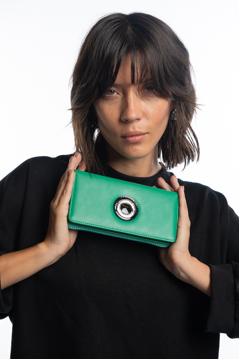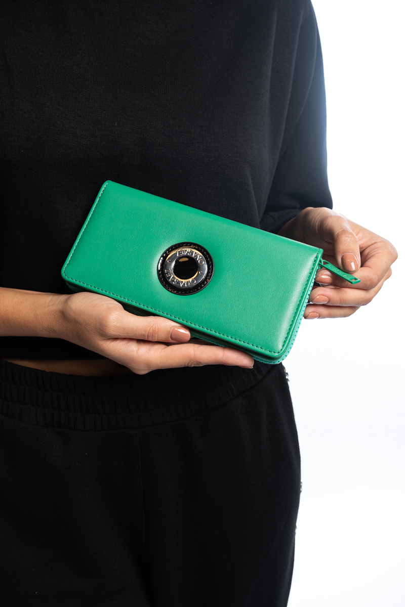 Billetera confeccionada en PU (símil cuero) color verde, con aplique de logo de marca en el frente.