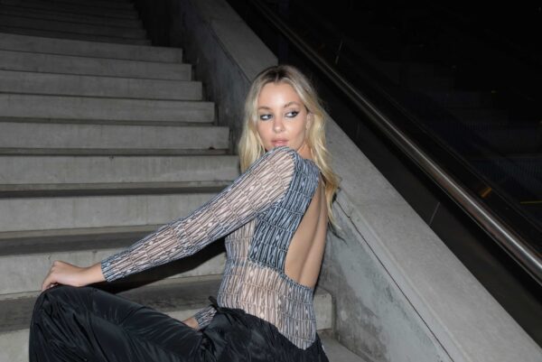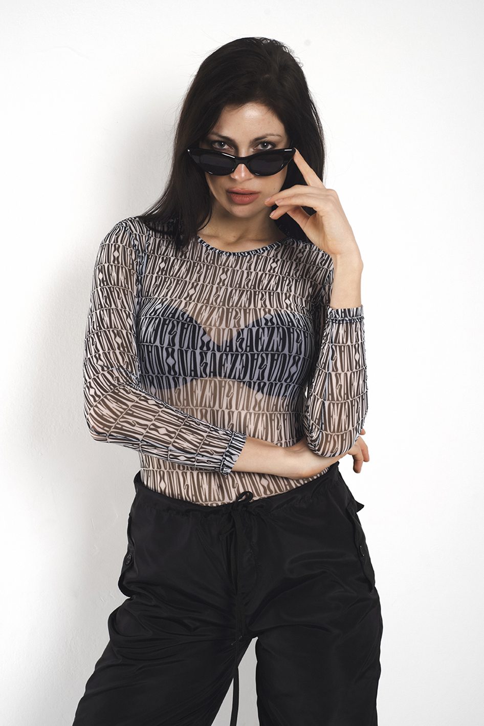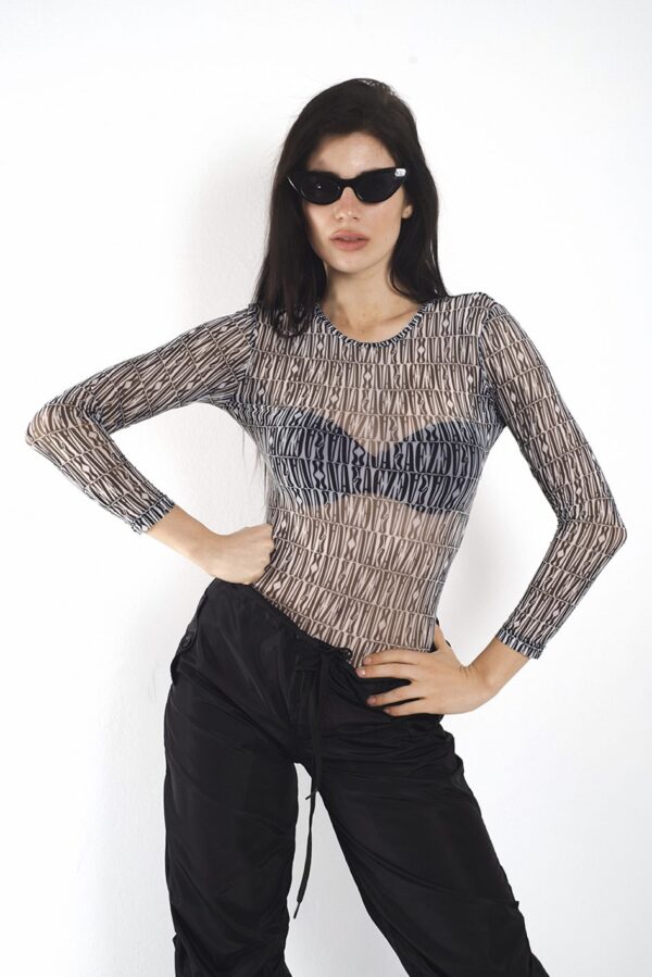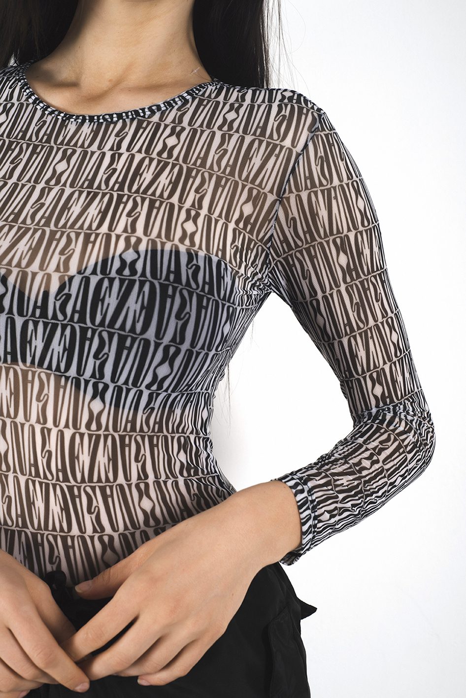 Body semitransparente manga larga, confeccionado en tul con lycra, estampado con un diseño exclusivo para ona saez.