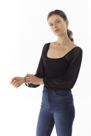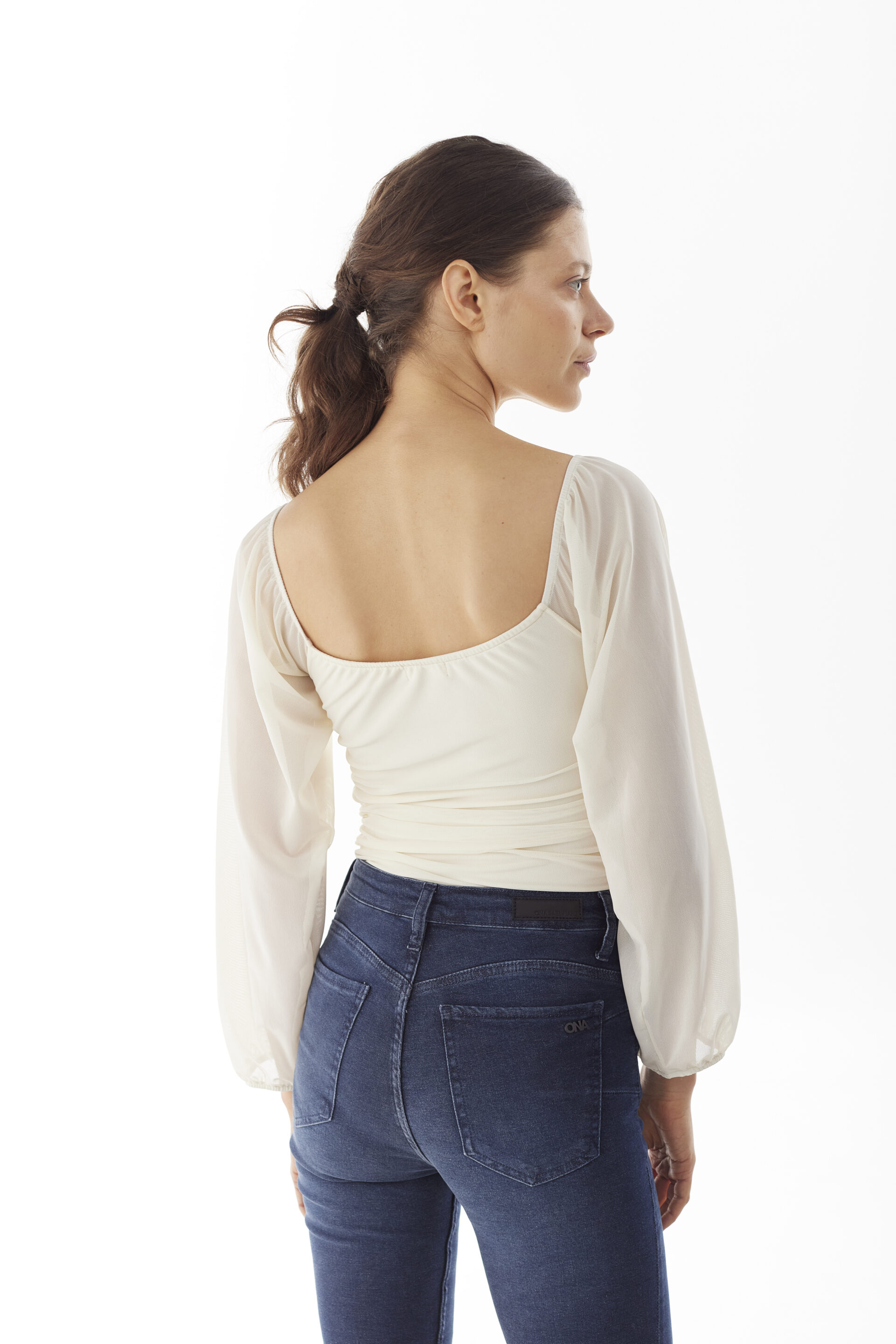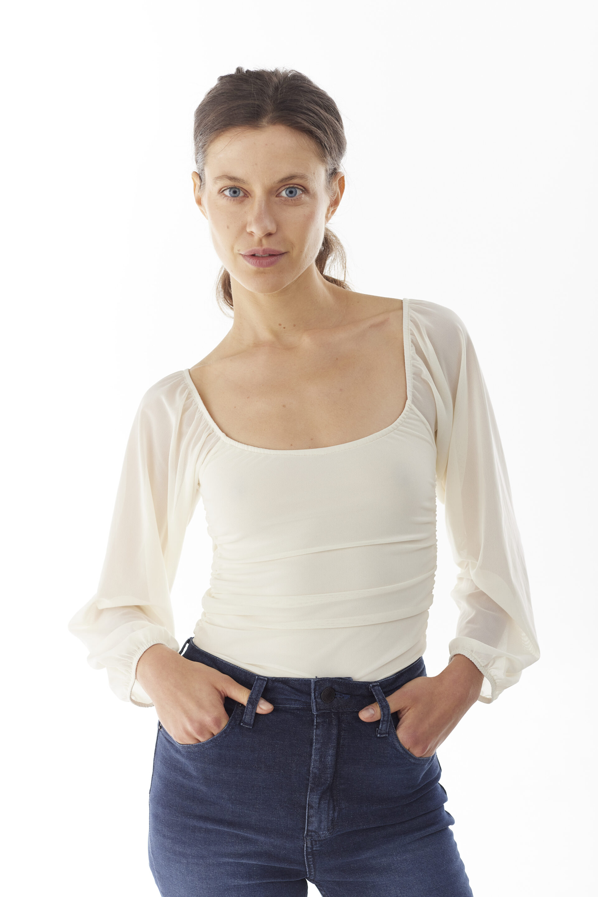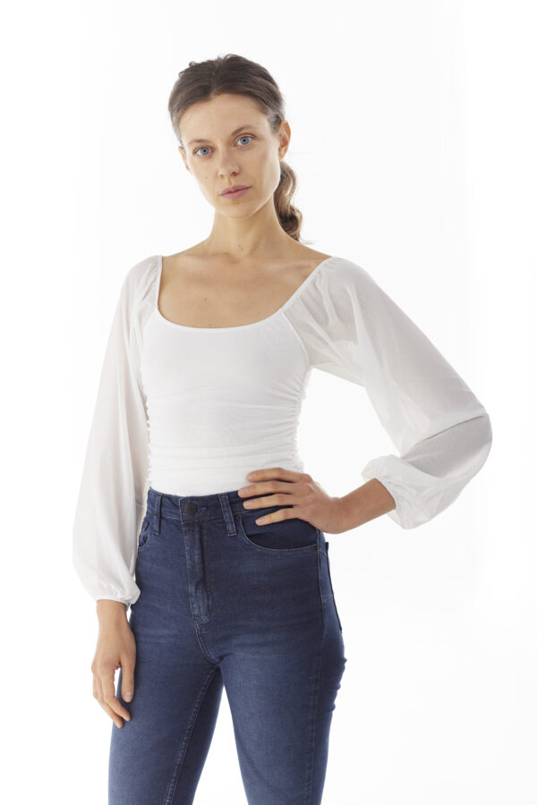 Body escote cuadrado y mangas abullonadas, confeccionado en tull con lycra, color blanco.