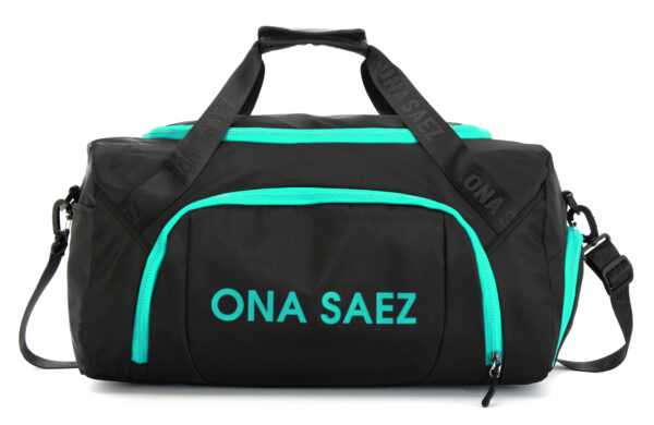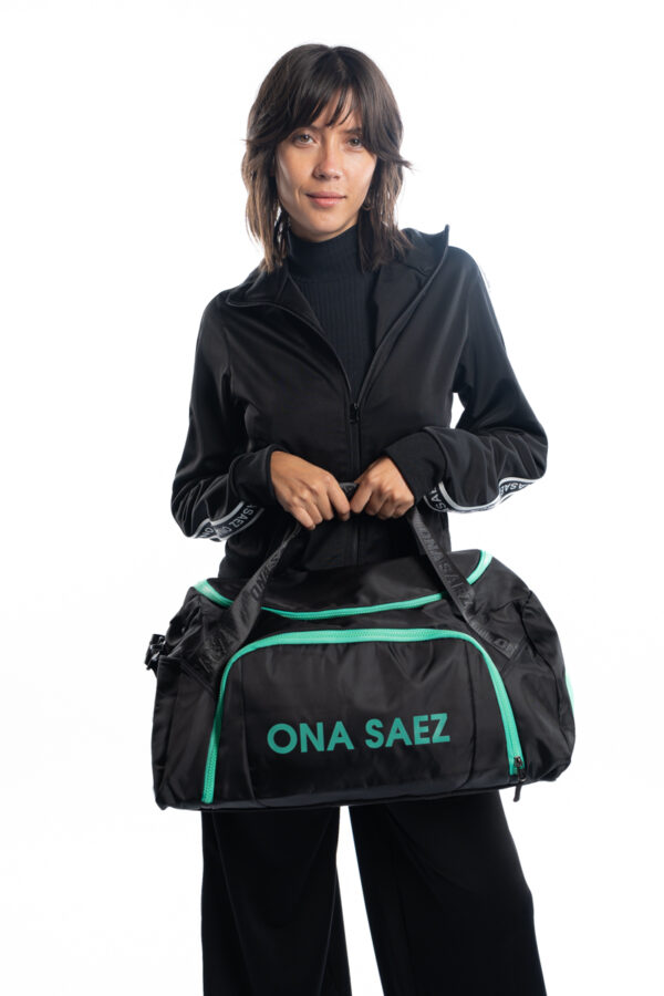 Bolso deportivo confeccionado en nylon 100% color negro con detalles en color verde, incluye múltiples bolsillos exteriores, uno con cierre frontal visible, y bolsillos laterales amplios para mayor capacidad de almacenamiento.