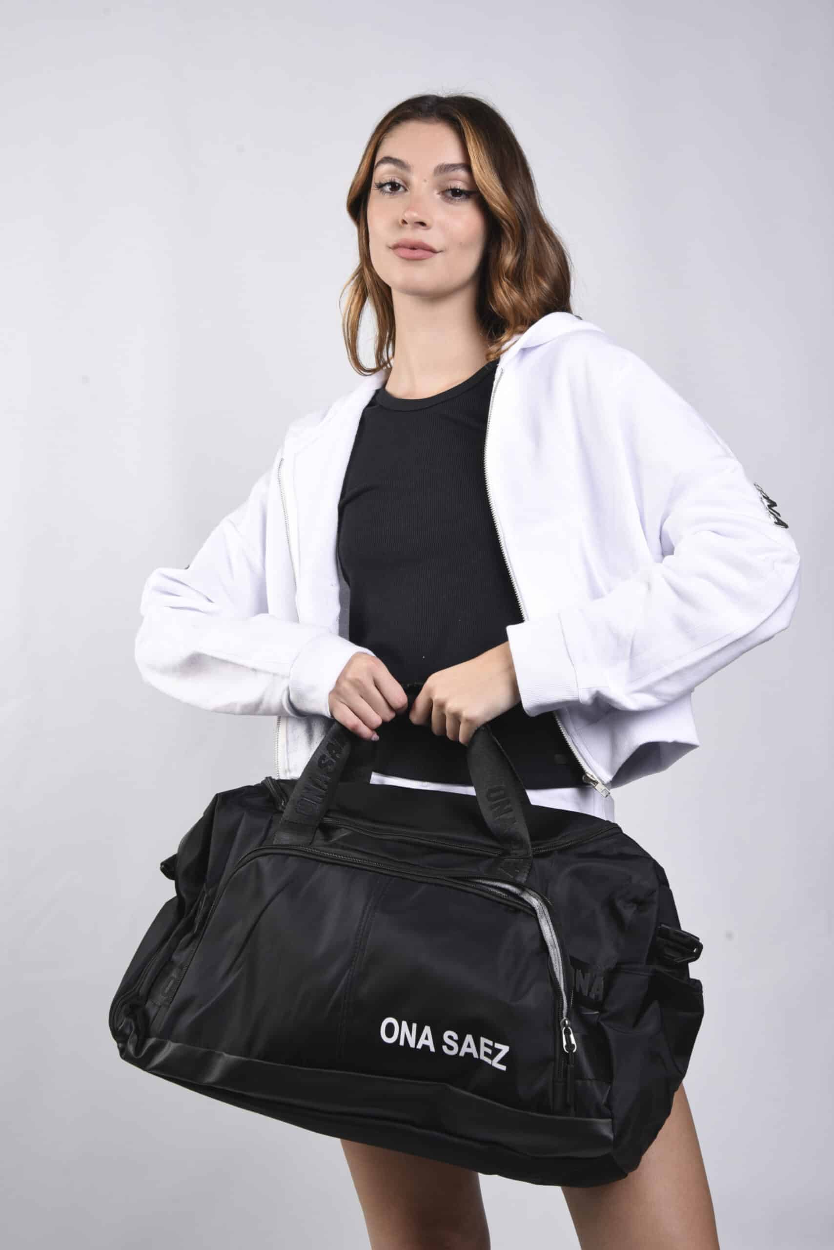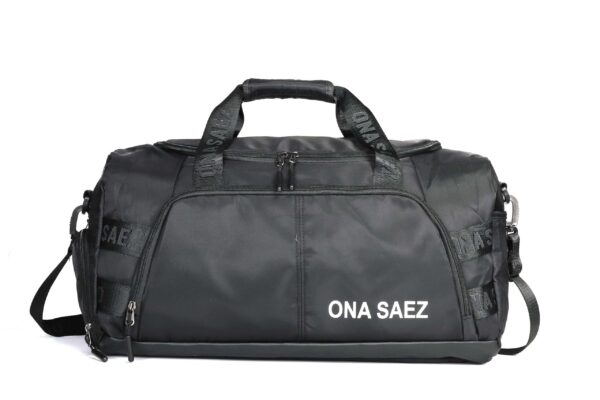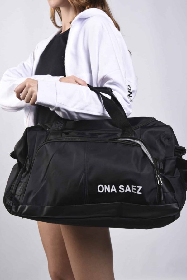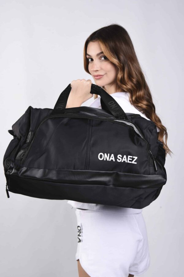 Bolso deportivo confeccionado en nylon 100% color negro, incluye múltiples bolsillos exteriores, uno con cierre frontal visible, y bolsillos laterales amplios para mayor capacidad de almacenamiento.