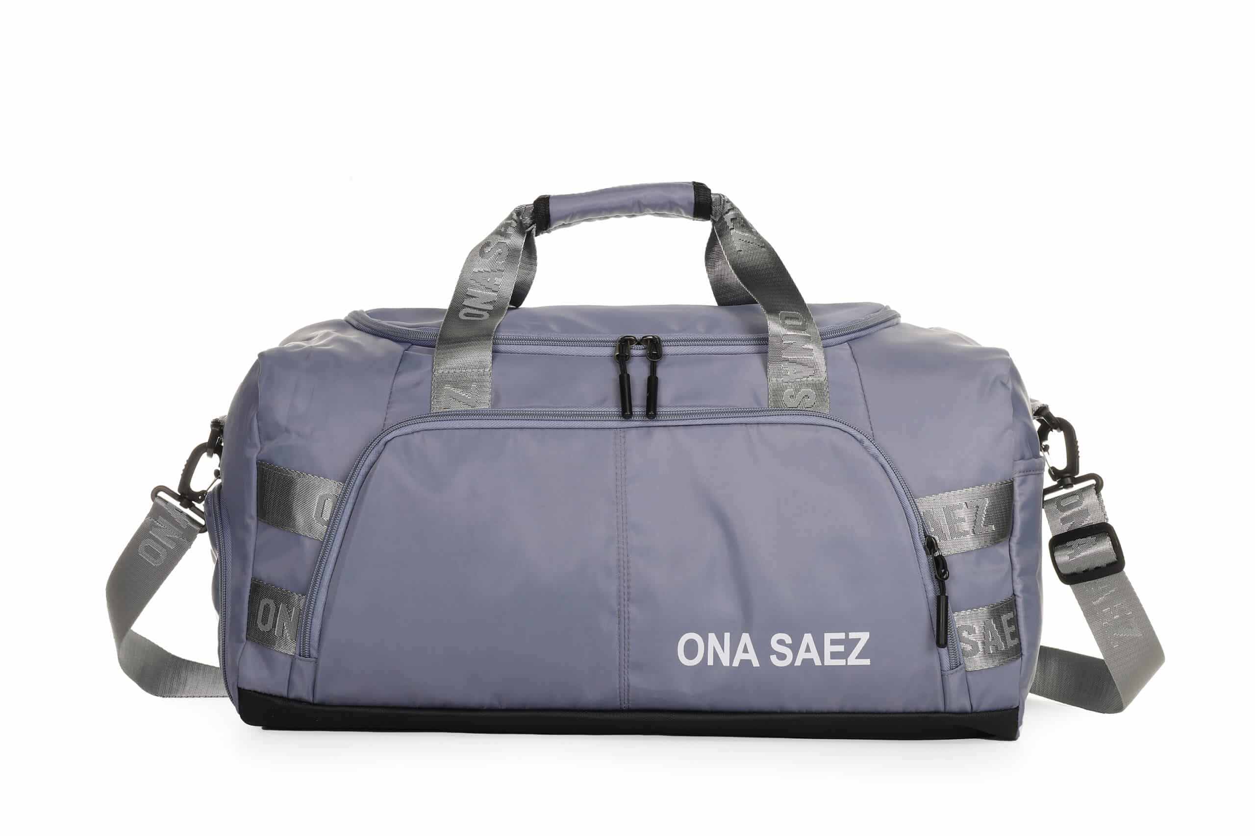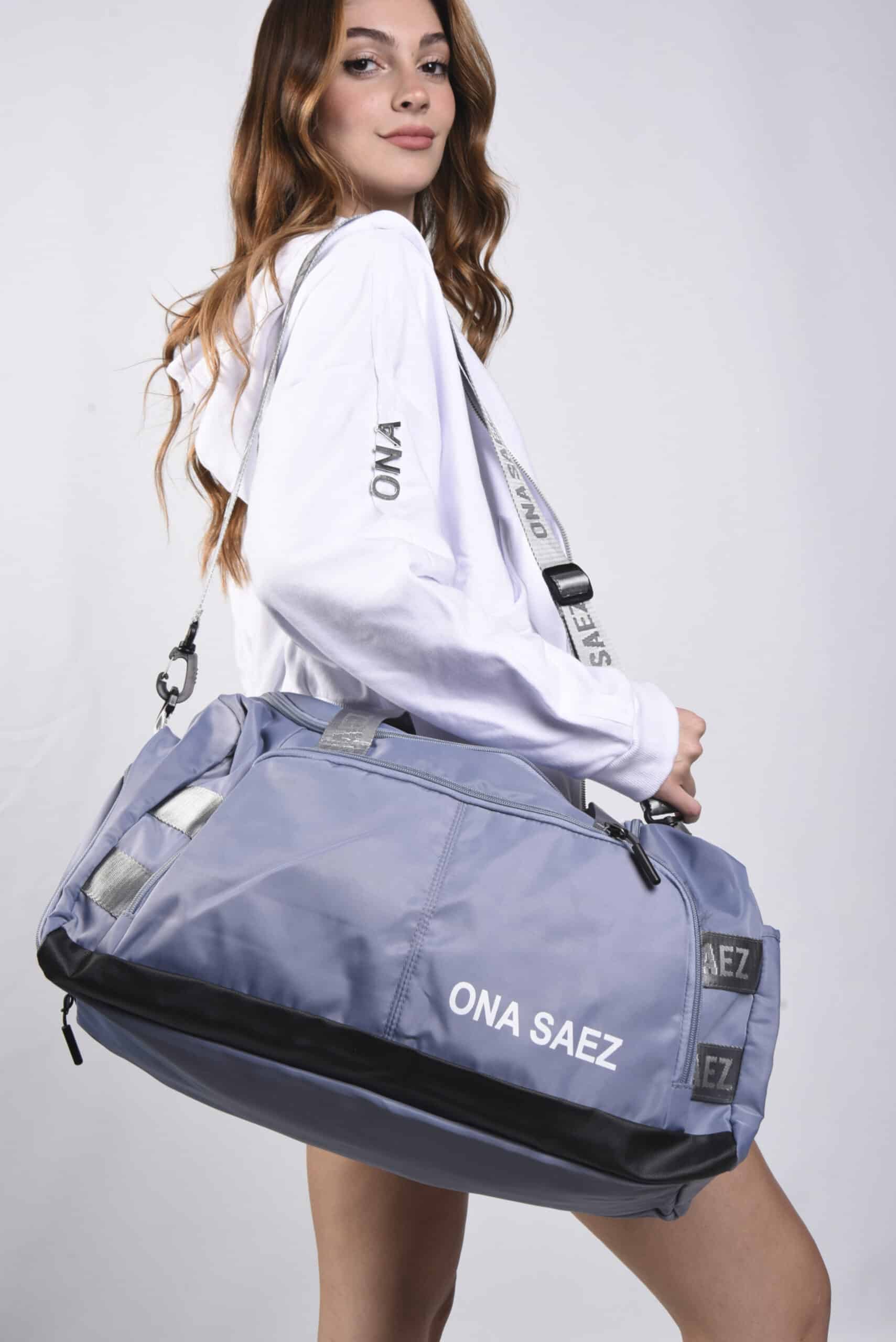 Bolso deportivo confeccionado en nylon 100% color azul, incluye múltiples bolsillos exteriores, uno con cierre frontal visible, y bolsillos laterales amplios para mayor capacidad de almacenamiento.