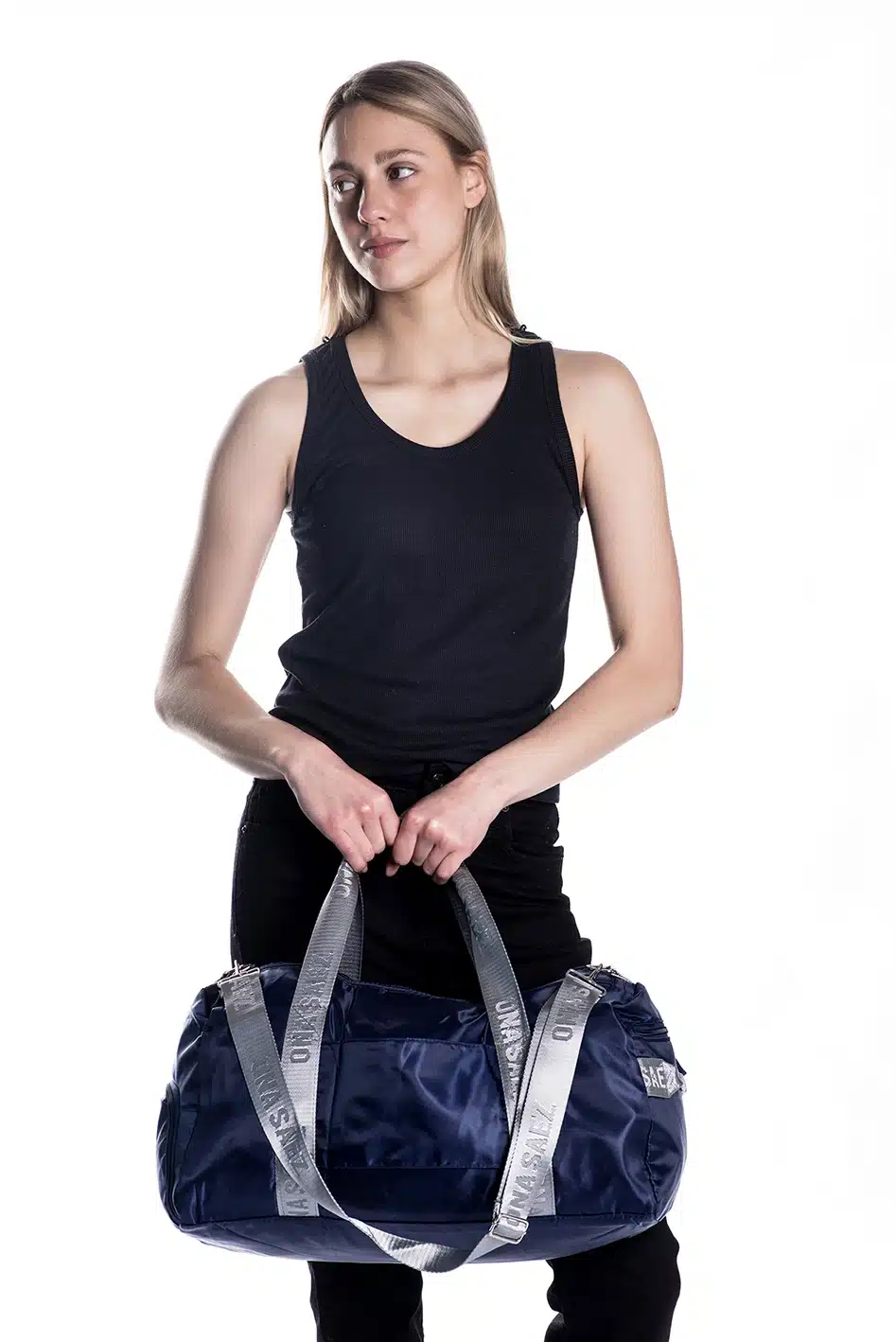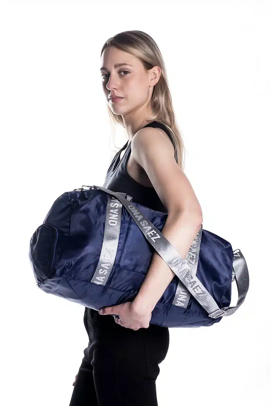 Bolso deportivo confeccionado en nylon 100% color azul.
