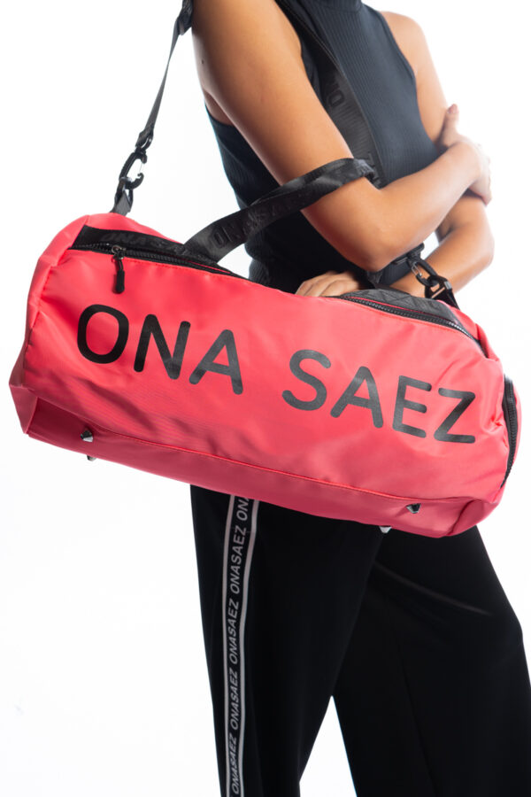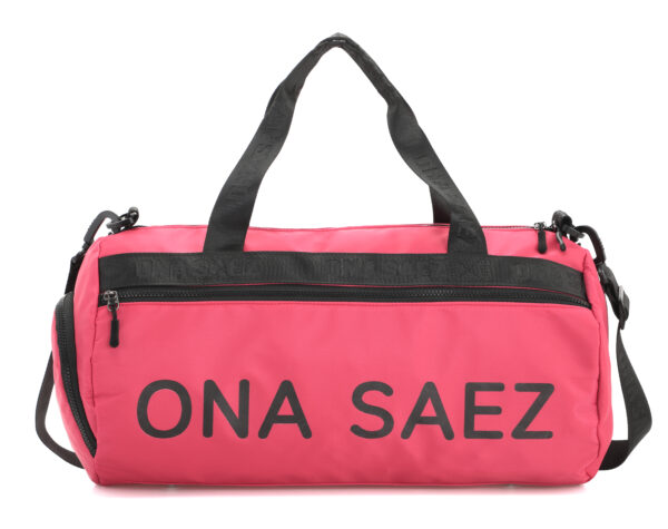 Bolso deportivo confeccionado en nylon 100% color Fucsia con detalles en color negro, incluye múltiples bolsillos exteriores, uno con cierre frontal visible, y bolsillos laterales amplios para mayor capacidad de almacenamiento.
