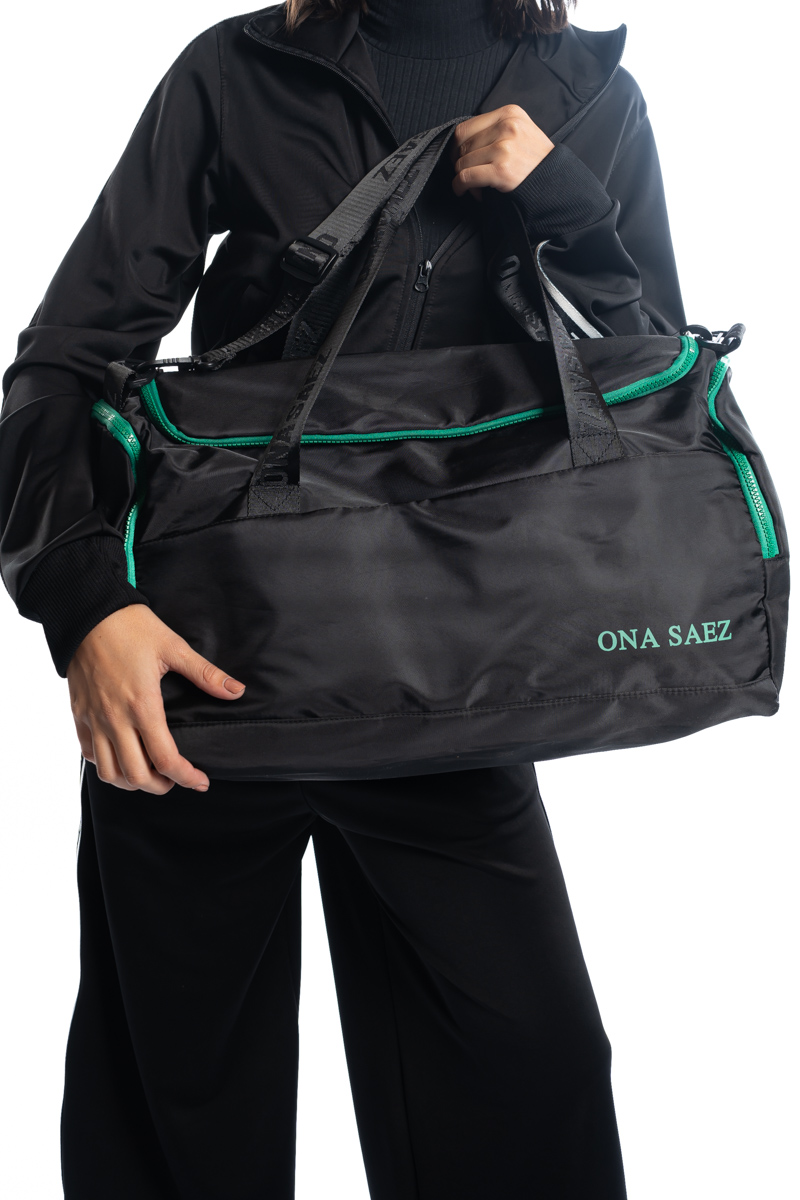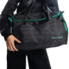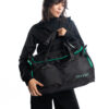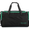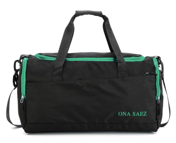 Bolso deportivo confeccionado en nylon 100% color negro con detalles en color verde, incluye múltiples bolsillos exteriores, uno con cierre frontal visible, y bolsillos laterales amplios para mayor capacidad de almacenamiento.