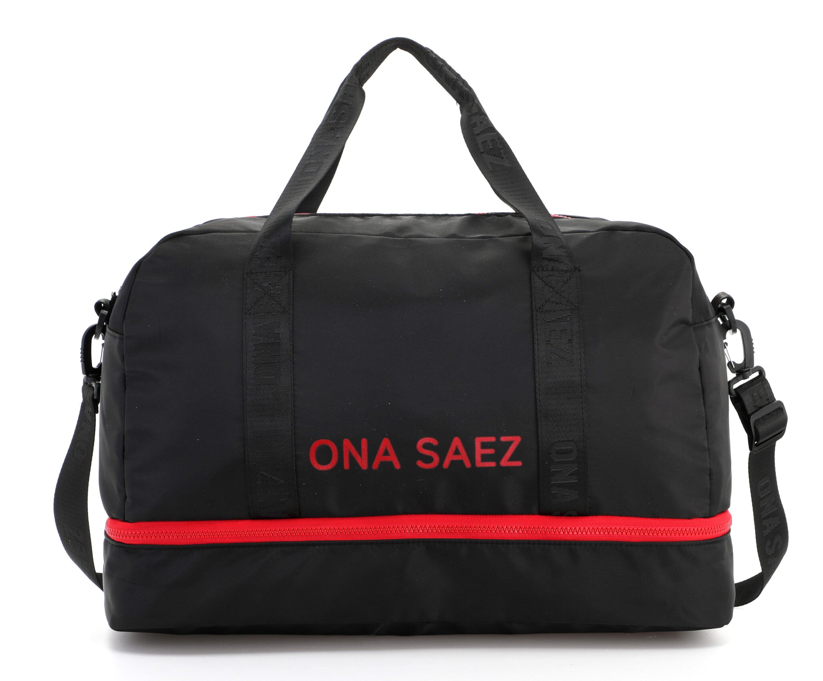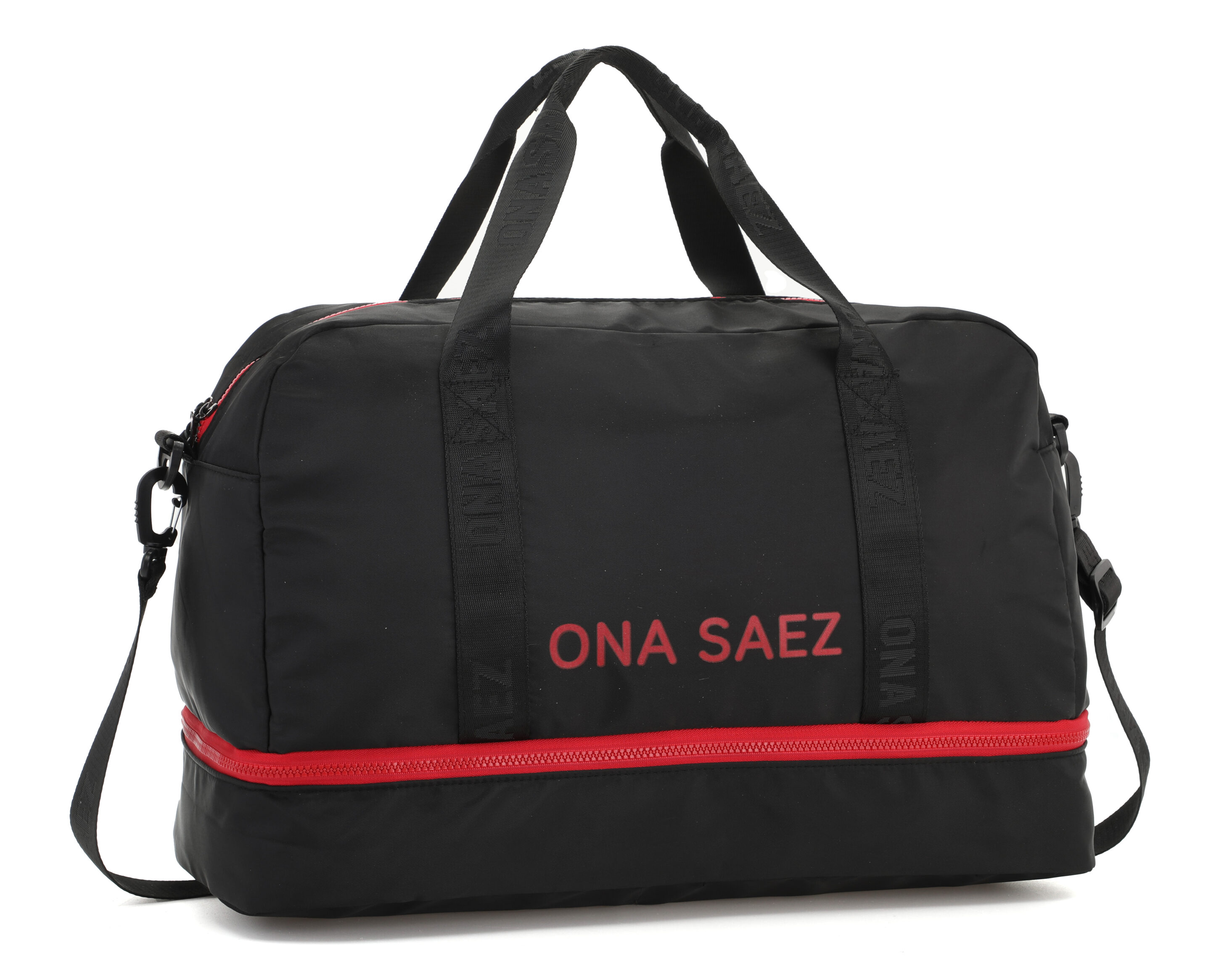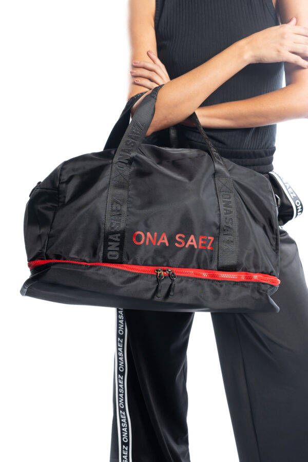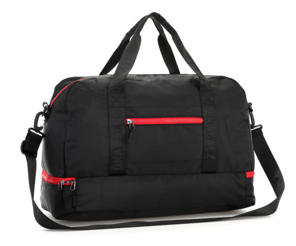 Bolso deportivo confeccionado en nylon 100% color negro con detalles en color rojo, incluye múltiples bolsillos exteriores, uno con cierre frontal visible, y bolsillos laterales amplios para mayor capacidad de almacenamiento.