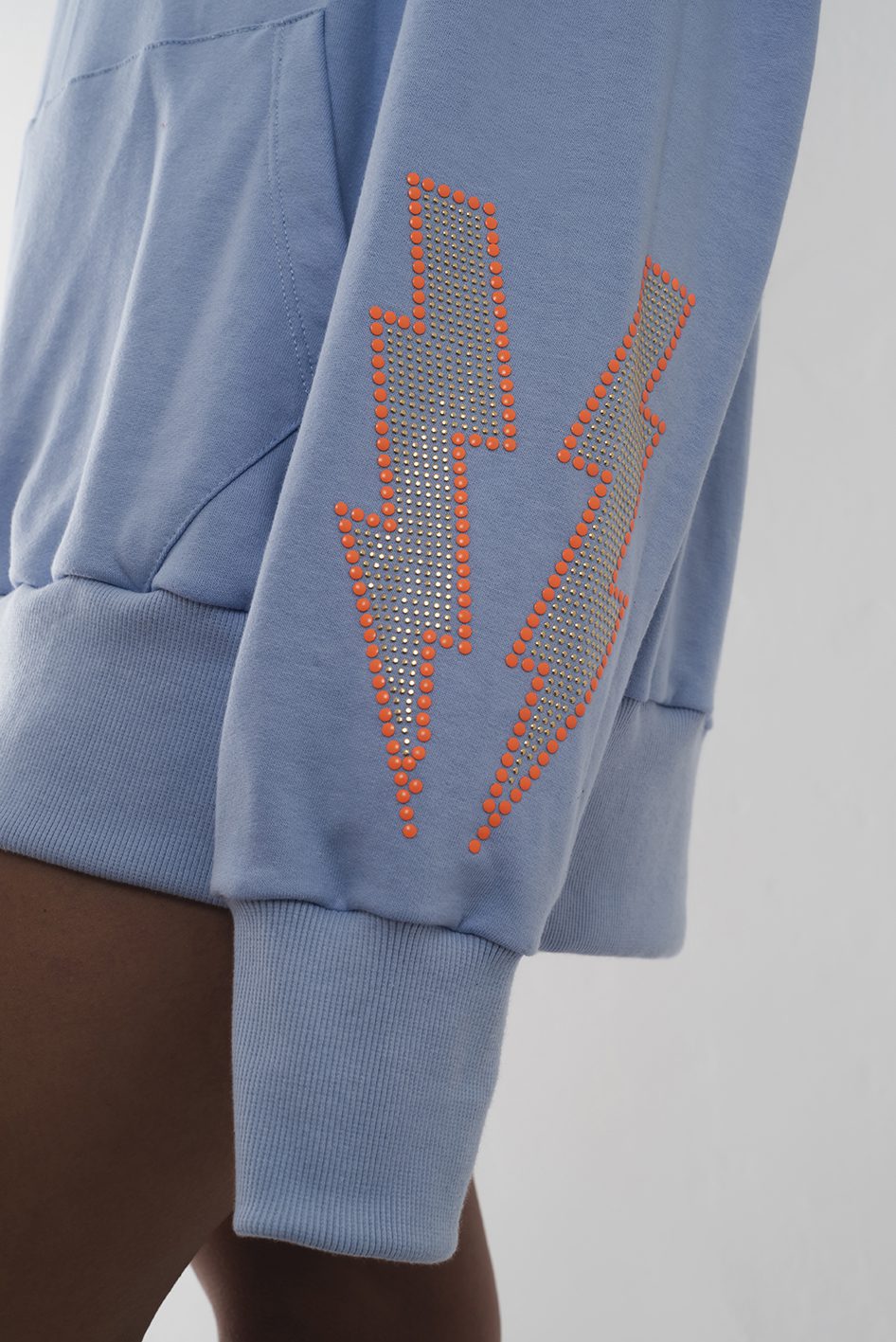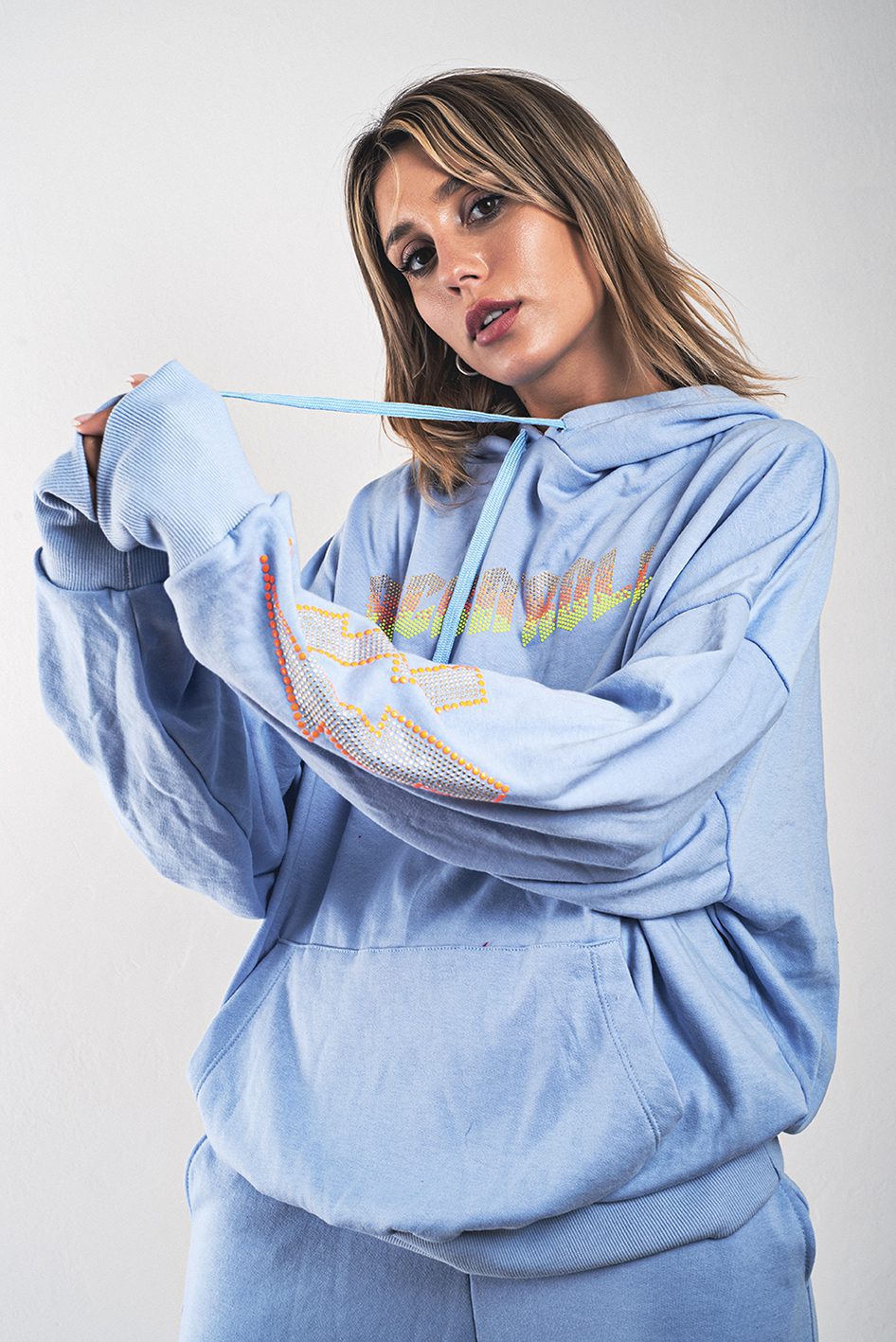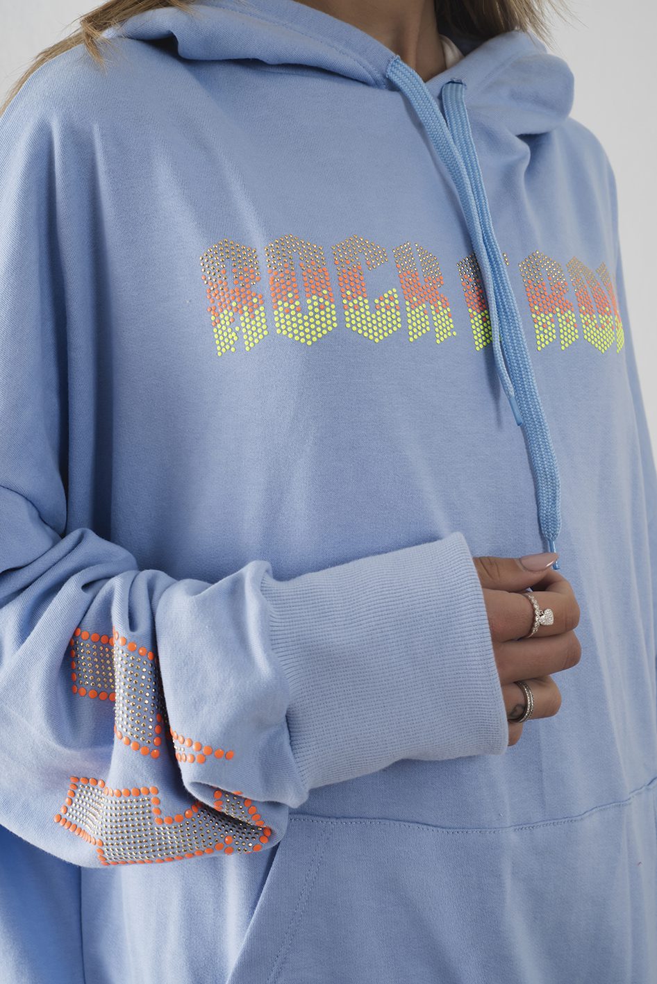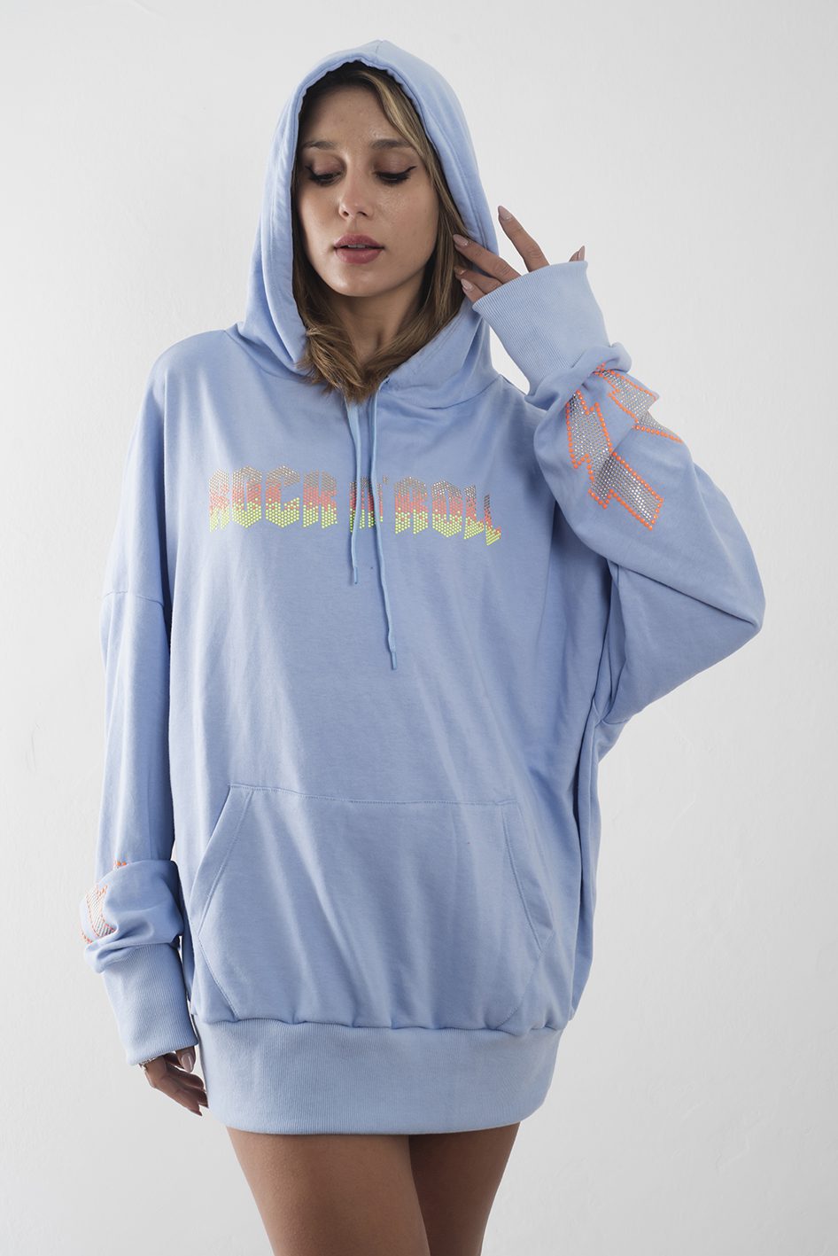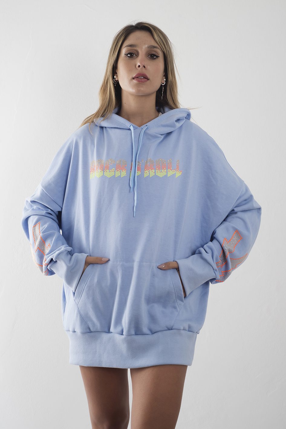 Diseño de transfers de strass repartidos en el frente y en las mangas. leyenda “rock and roll”