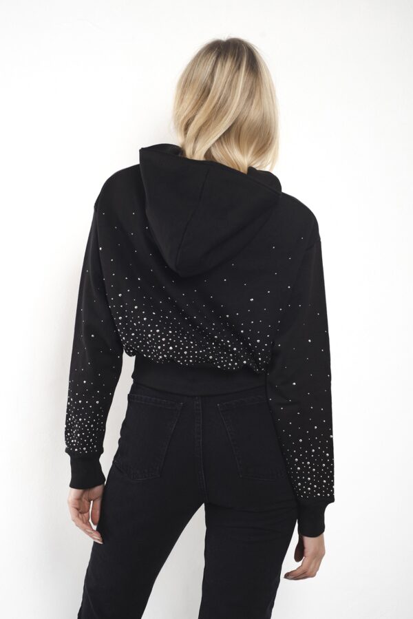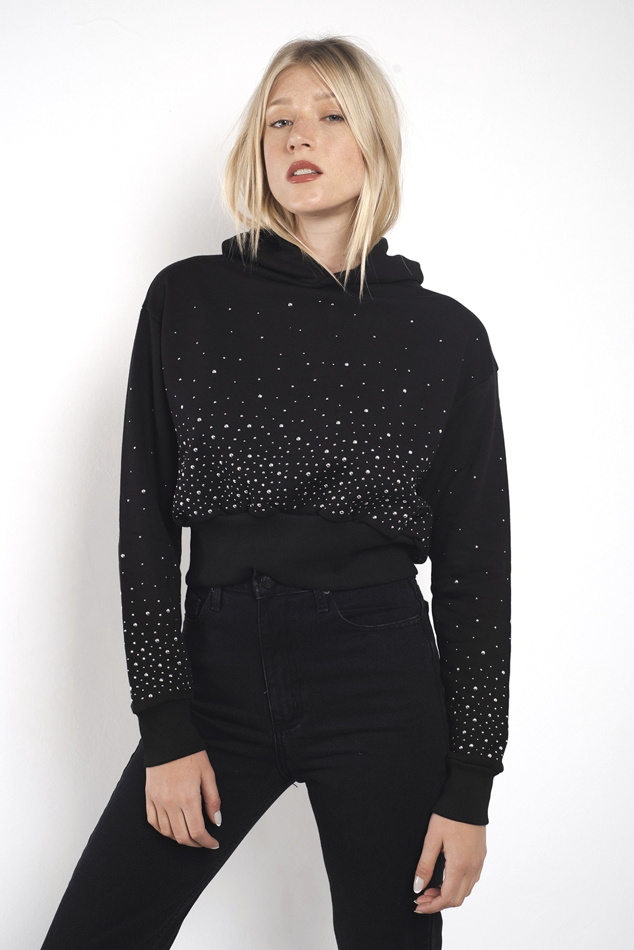 El detalle protagonista en el transfer de tachas color plata que tiene a los largo de ambas mangas, en el frente y en la espalda.