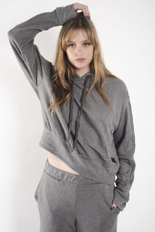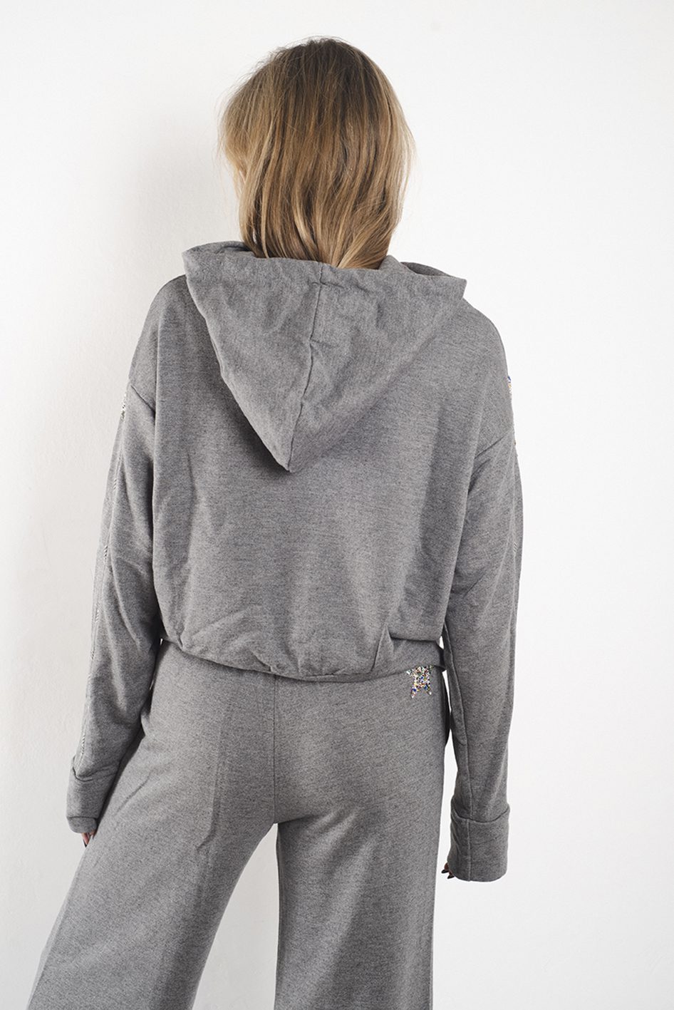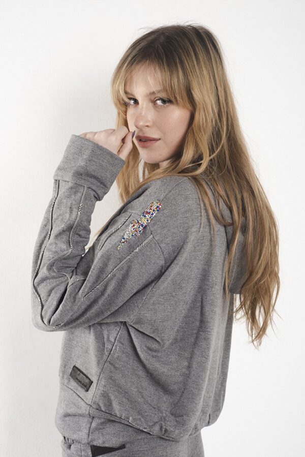 Buzo corto de calce recto, confeccionado en rustico 100% algodón sin friza, con detalles de apliques de rayos en canutillos multicolor