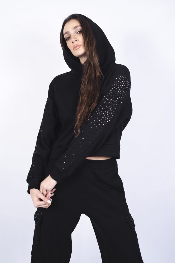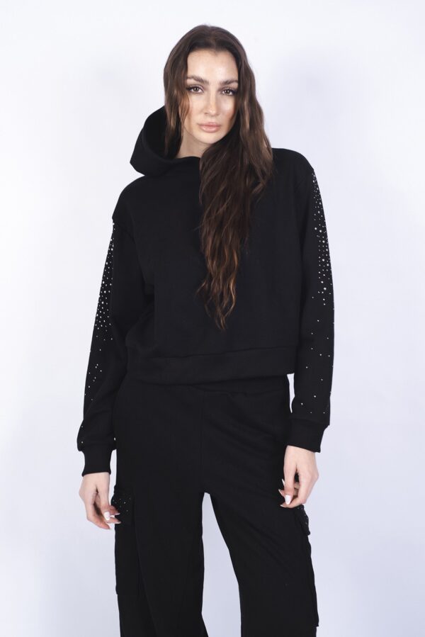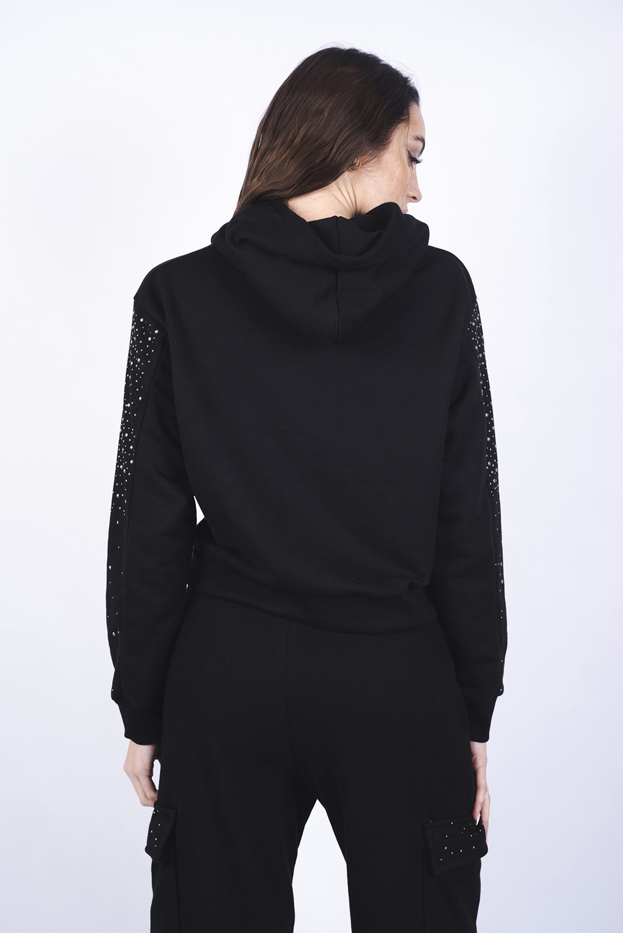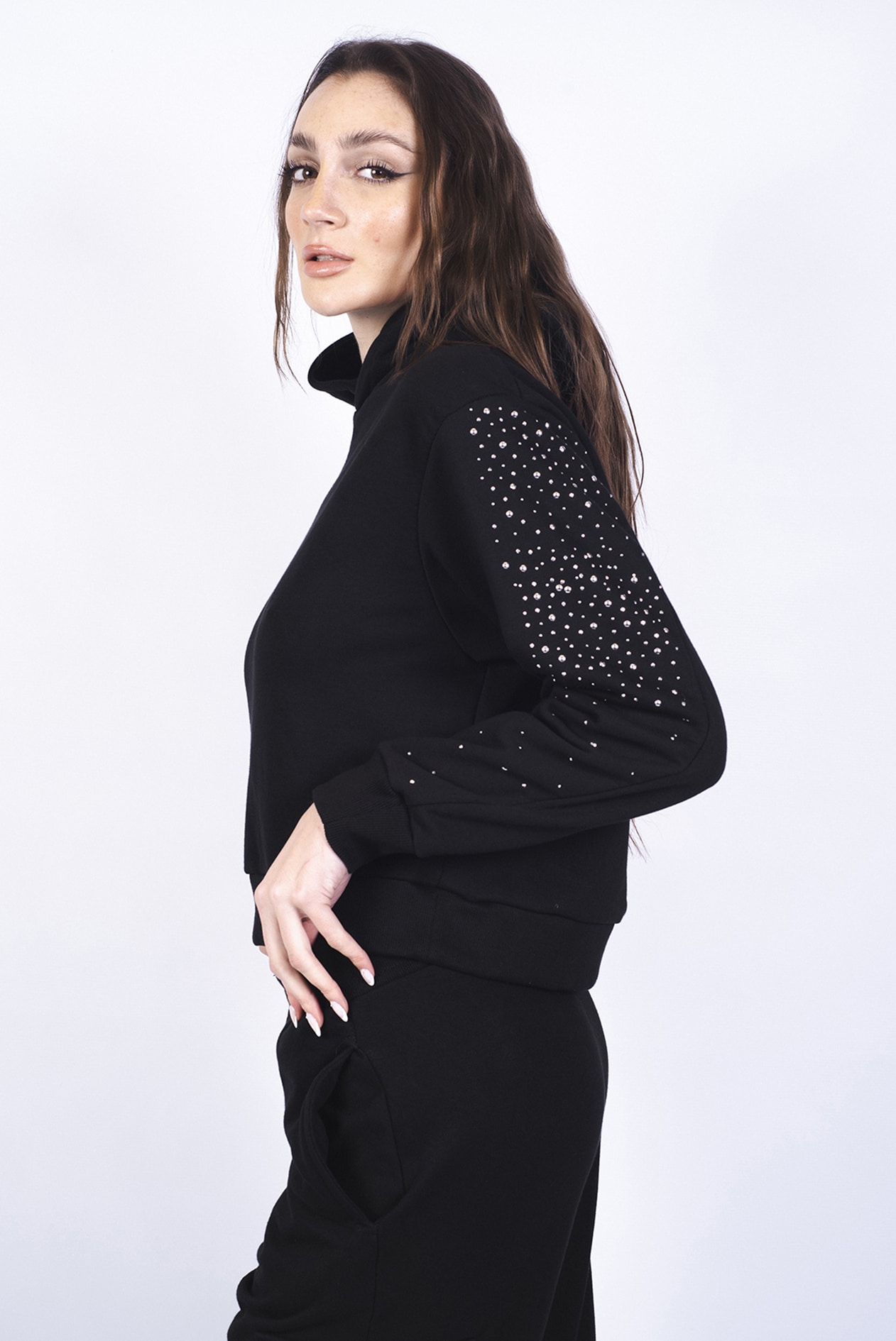 El detalle protagonista en el transfer de tachas color plata que tiene a los largo de ambas mangas.