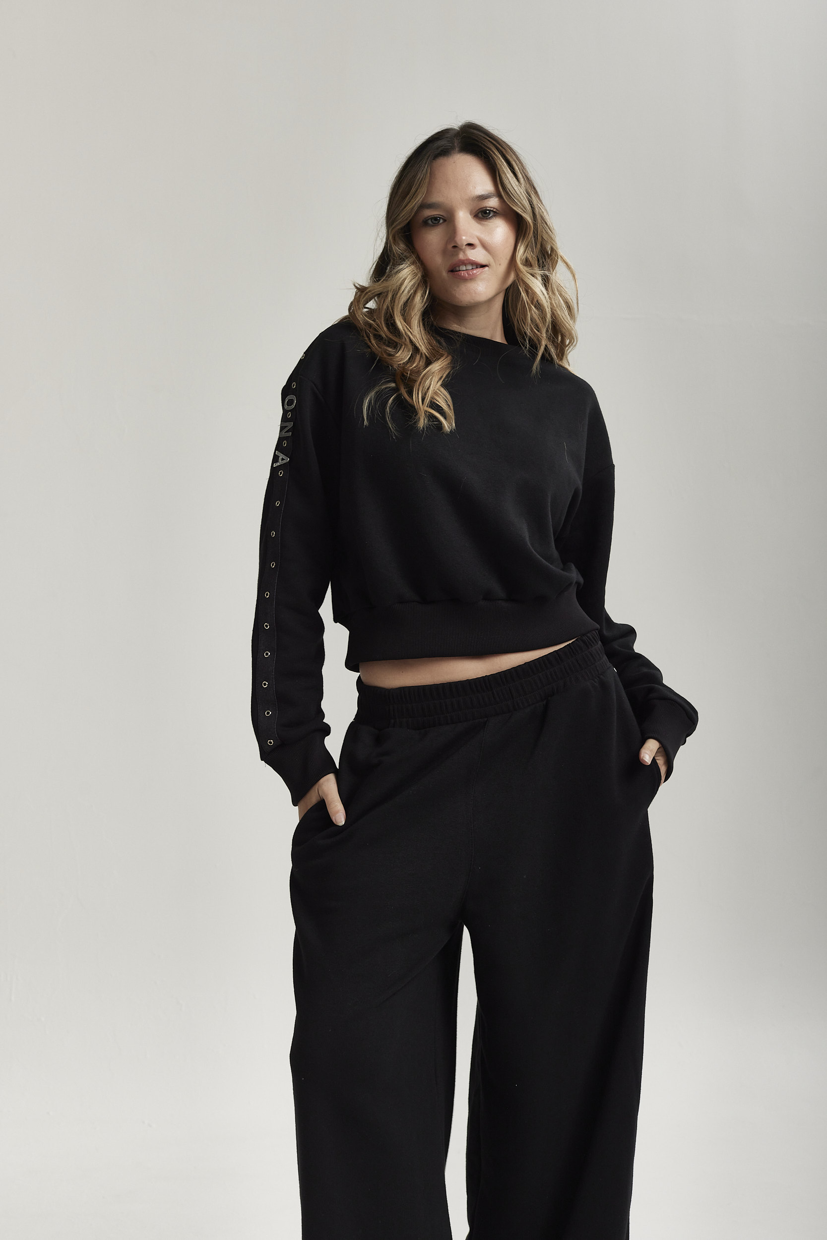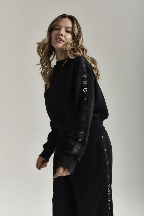 El detalle protagonista sin duda son los galones de símil denim, con ojalillos metálicos y letras Ona en fundición color plata, colocados en ambas mangas.
