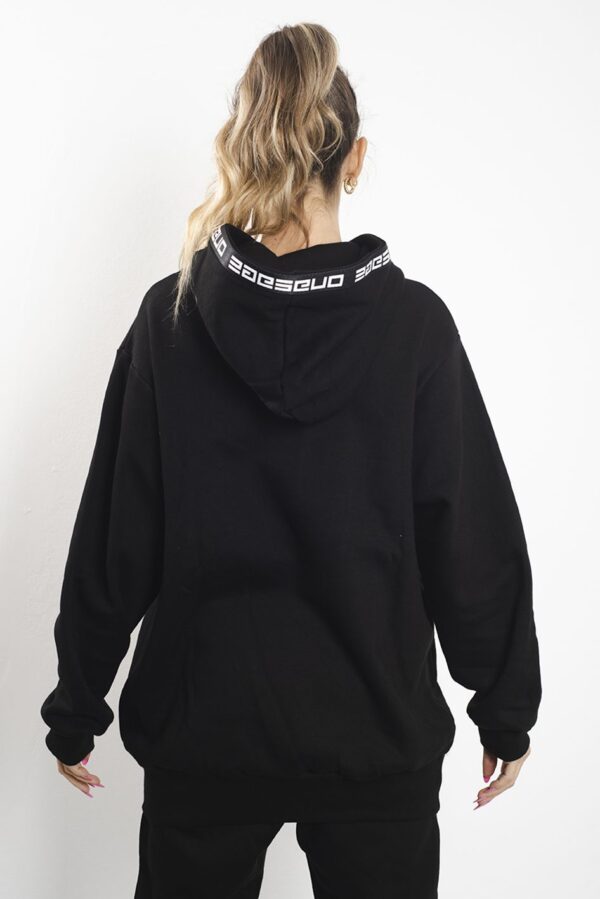 Detalle de cinta de marca bordada contratono alrededor de la capucha