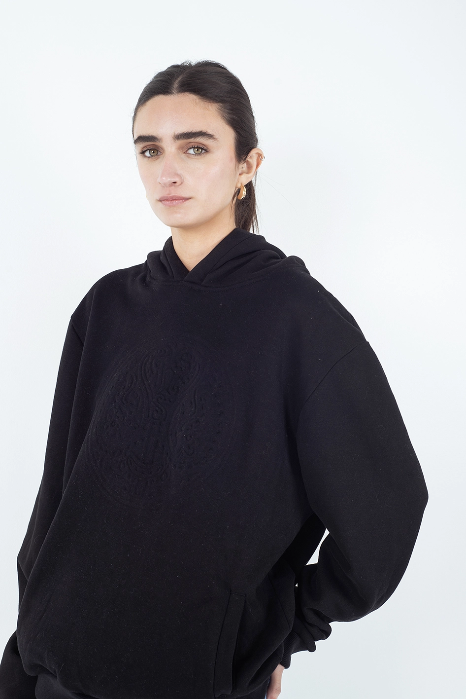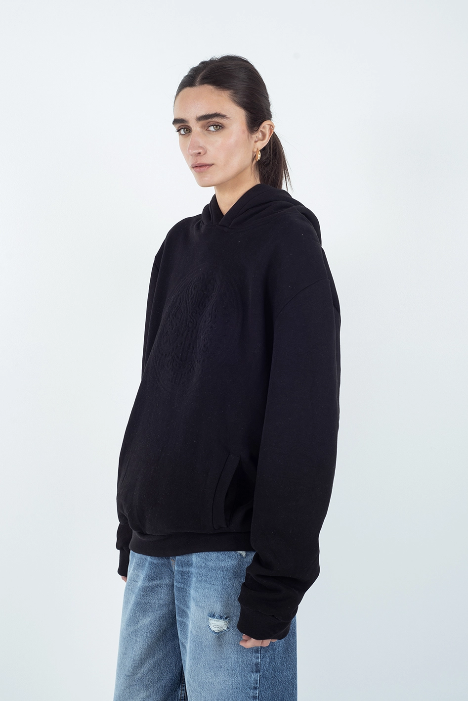 Hoodie de frisa premium 100% algodón, color negro, con calce relajado y diseño urbano. La protagonista de esta prenda es la estampa gofrada al frente, con el tribal característico de la marca, logrando un efecto en relieve tono sobre tono que aporta textura y personalidad sin perder la sobriedad del diseño.