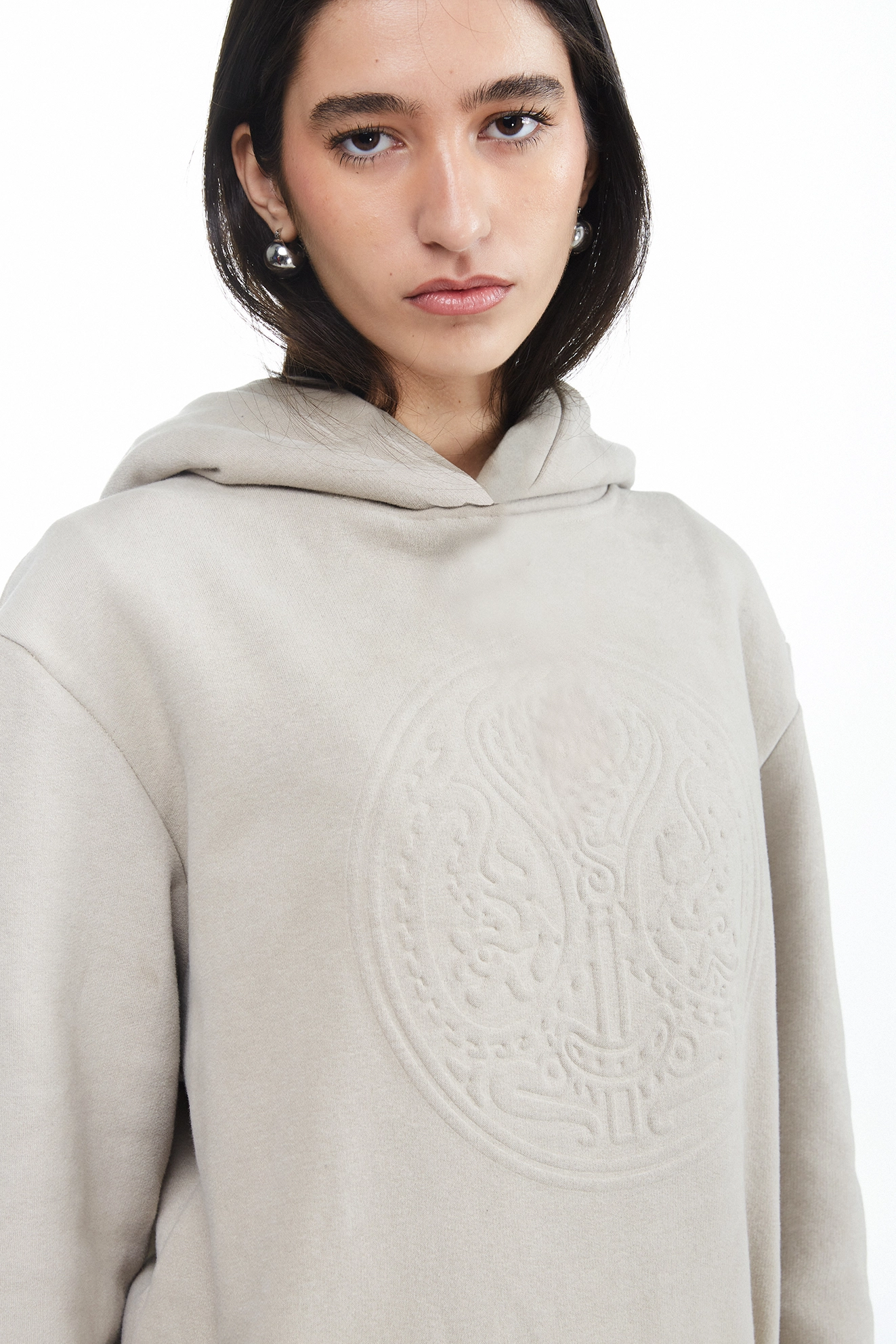 Hoodie de frisa premium 100% algodón, color arena, con calce relajado y diseño urbano. La protagonista de esta prenda es la estampa gofrada al frente, con el tribal característico de la marca, logrando un efecto en relieve tono sobre tono que aporta textura y personalidad sin perder la sobriedad del diseño.