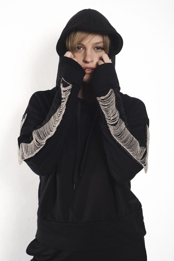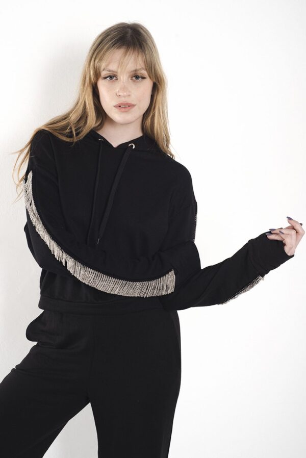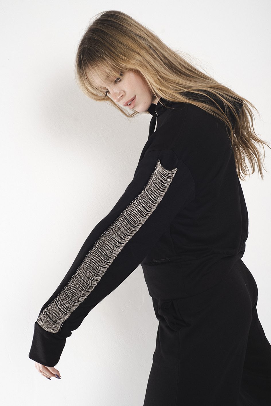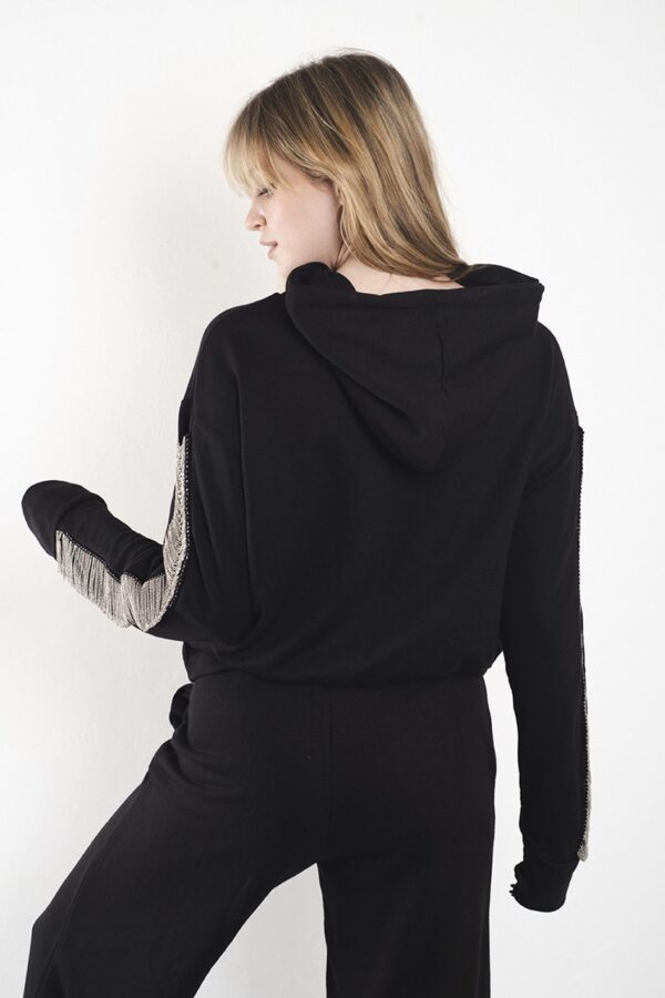 El detalle protagonista es el aplique de galón con micro-cadenas color plata que tiene a los largo de ambas mangas.