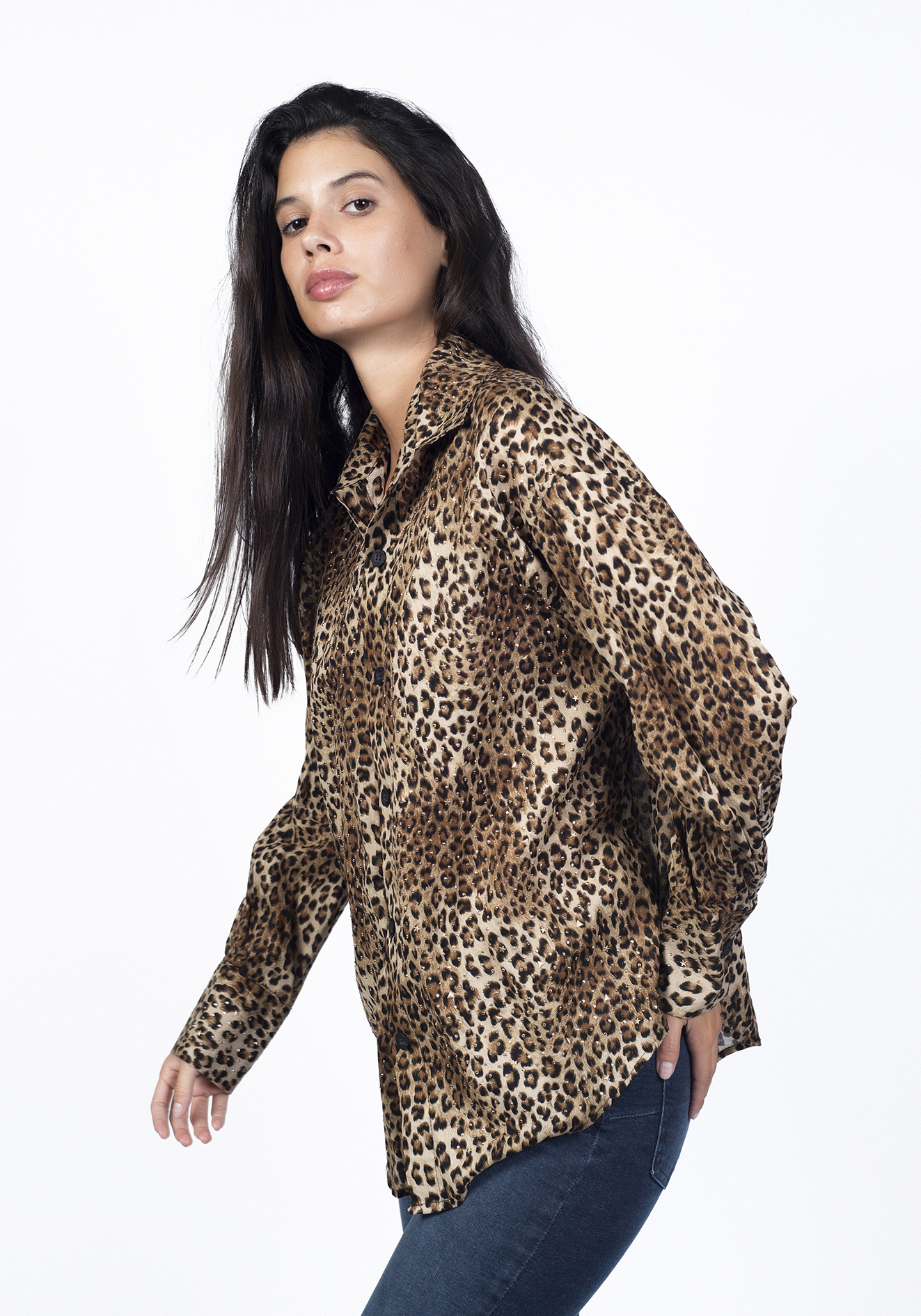Camisa regular fit, confeccionada en voile de algodón, con diseño con strass termoadheridos a contra tono en el frente.