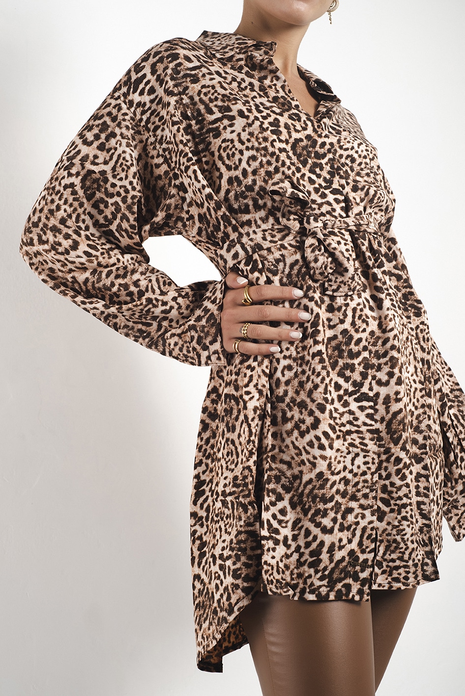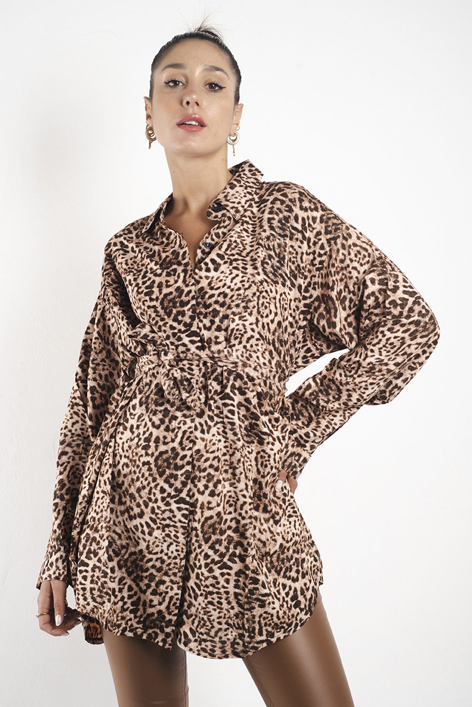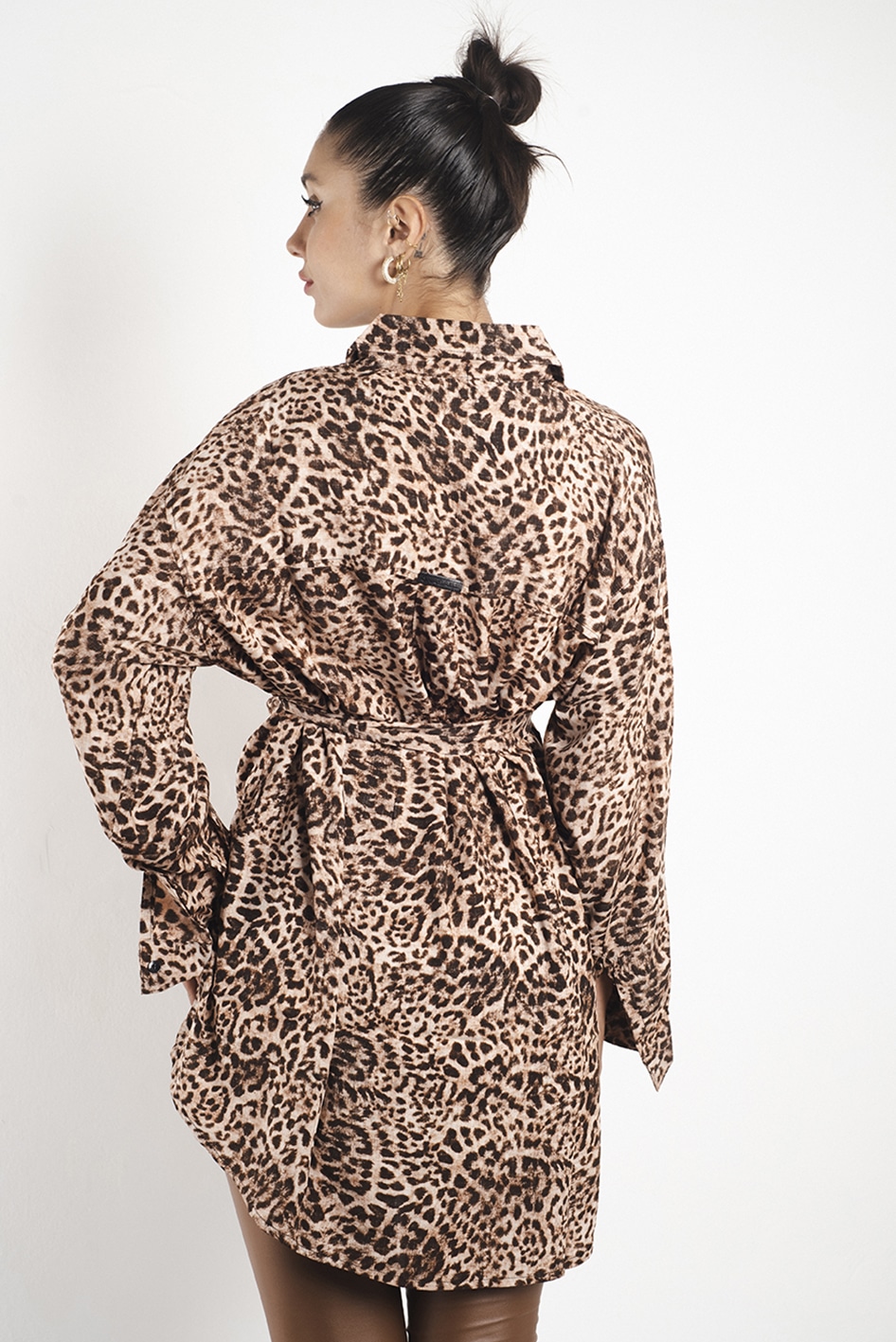 Con cinturón de la misma tela, que da la posibilidad de usar como kimono, vestido o camisa.
