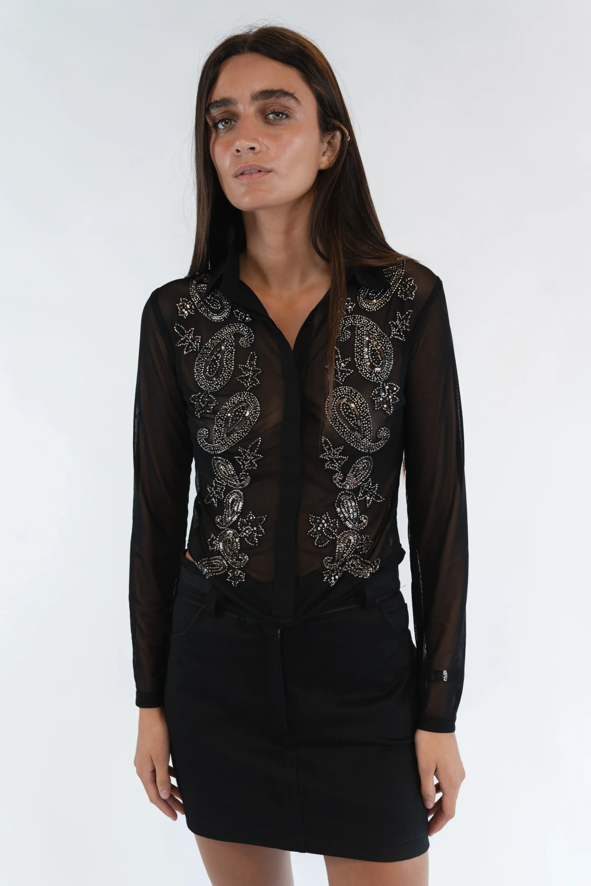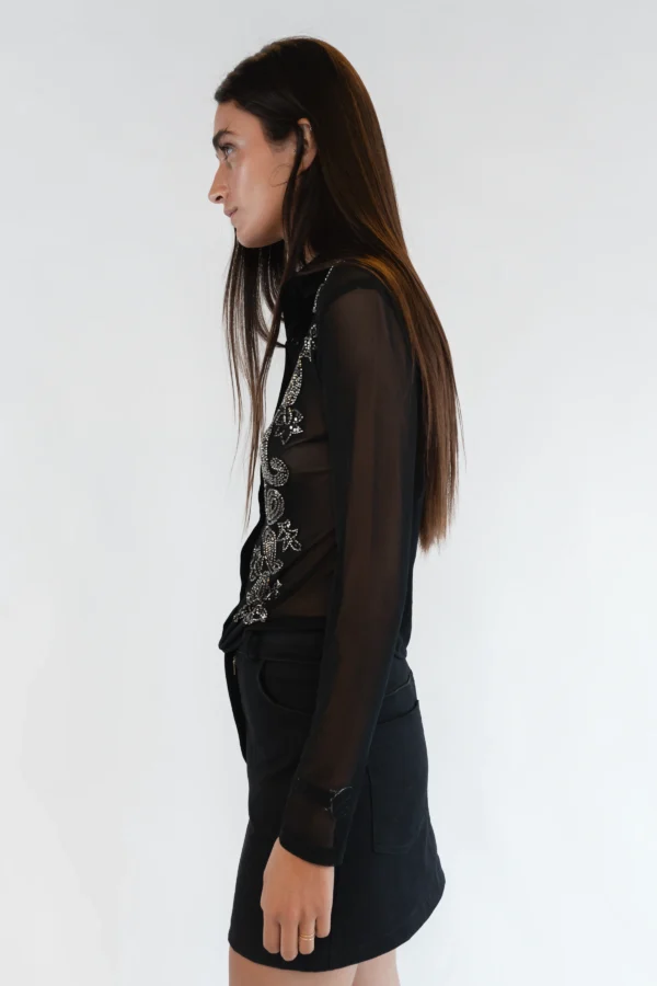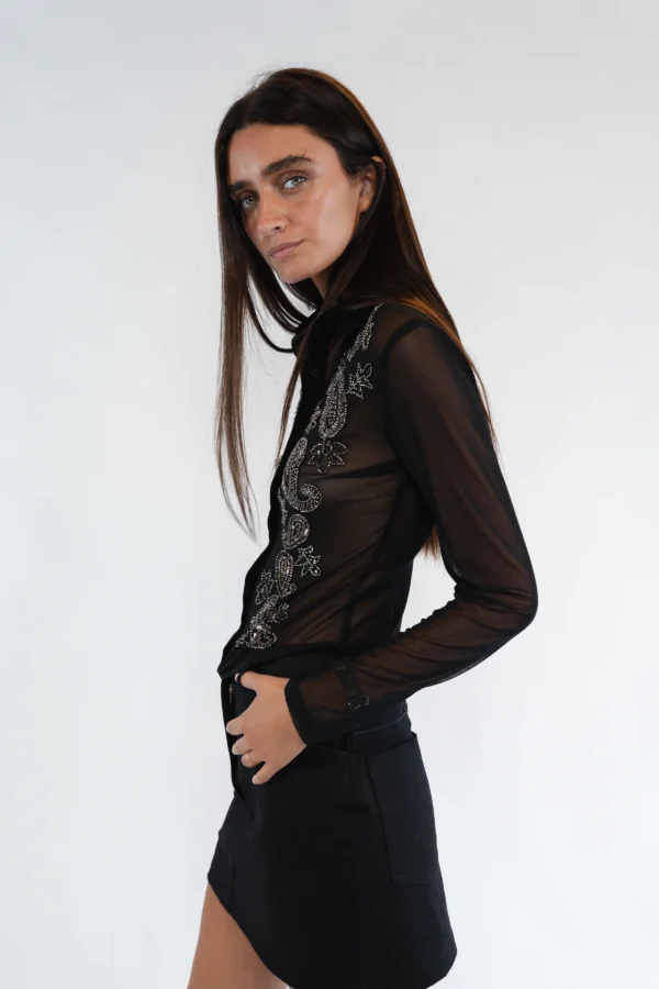 En la parte frontal, presenta un diseño bordado color peltre en forma de patrones paisley, lo que le da un toque sofisticado y llamativo.