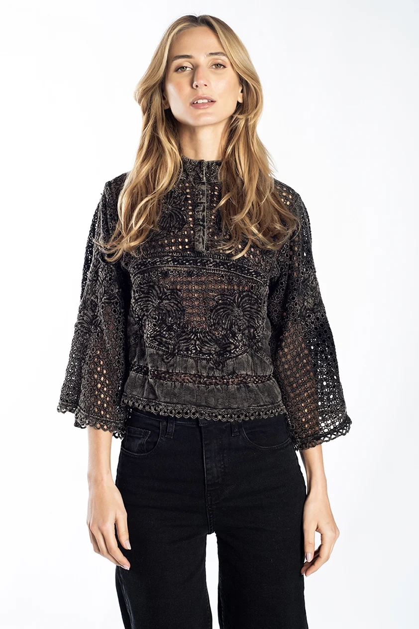 Camisola amplia con cuello alto, confeccionada en voile de algodón.