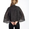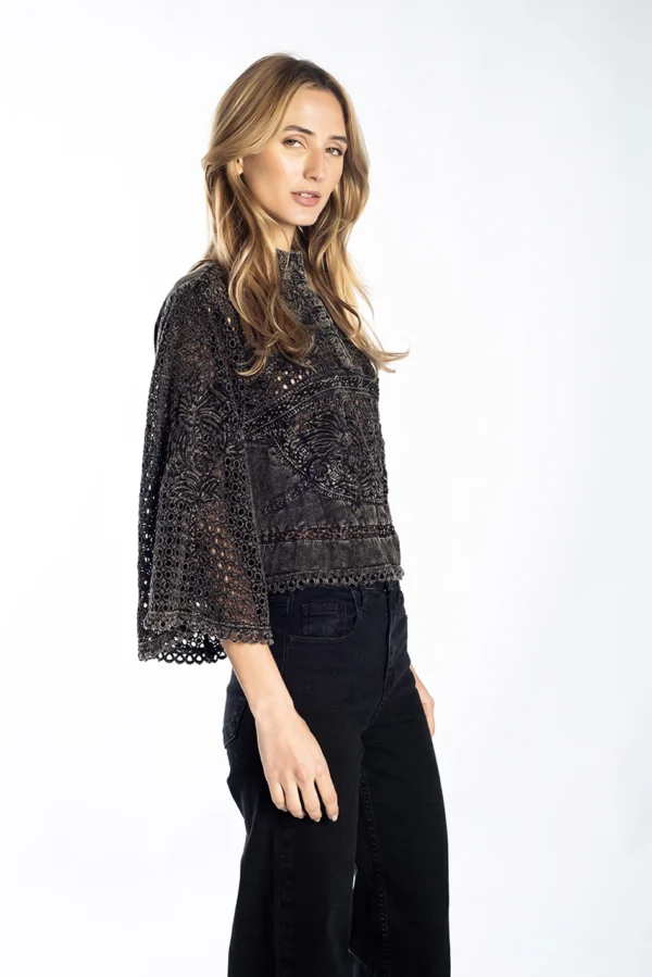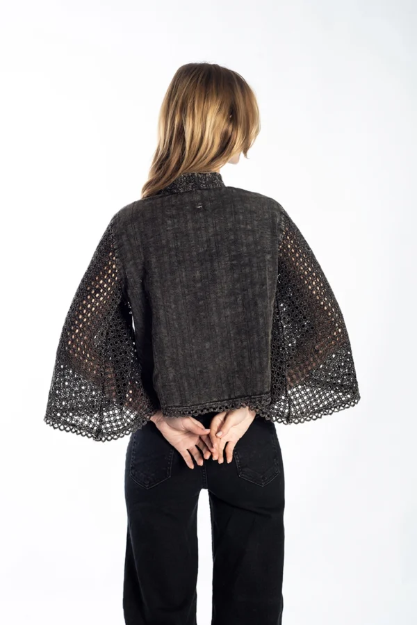 Lavado efecto vintage, con mangas amplias 3/4 y abertura con botones en el frente.