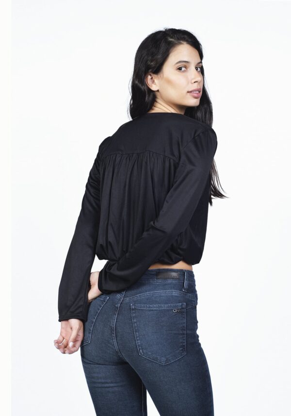 Camisola manga larga con escote en v cruzado, confeccionada en jersey de nylon con terminación brillante.