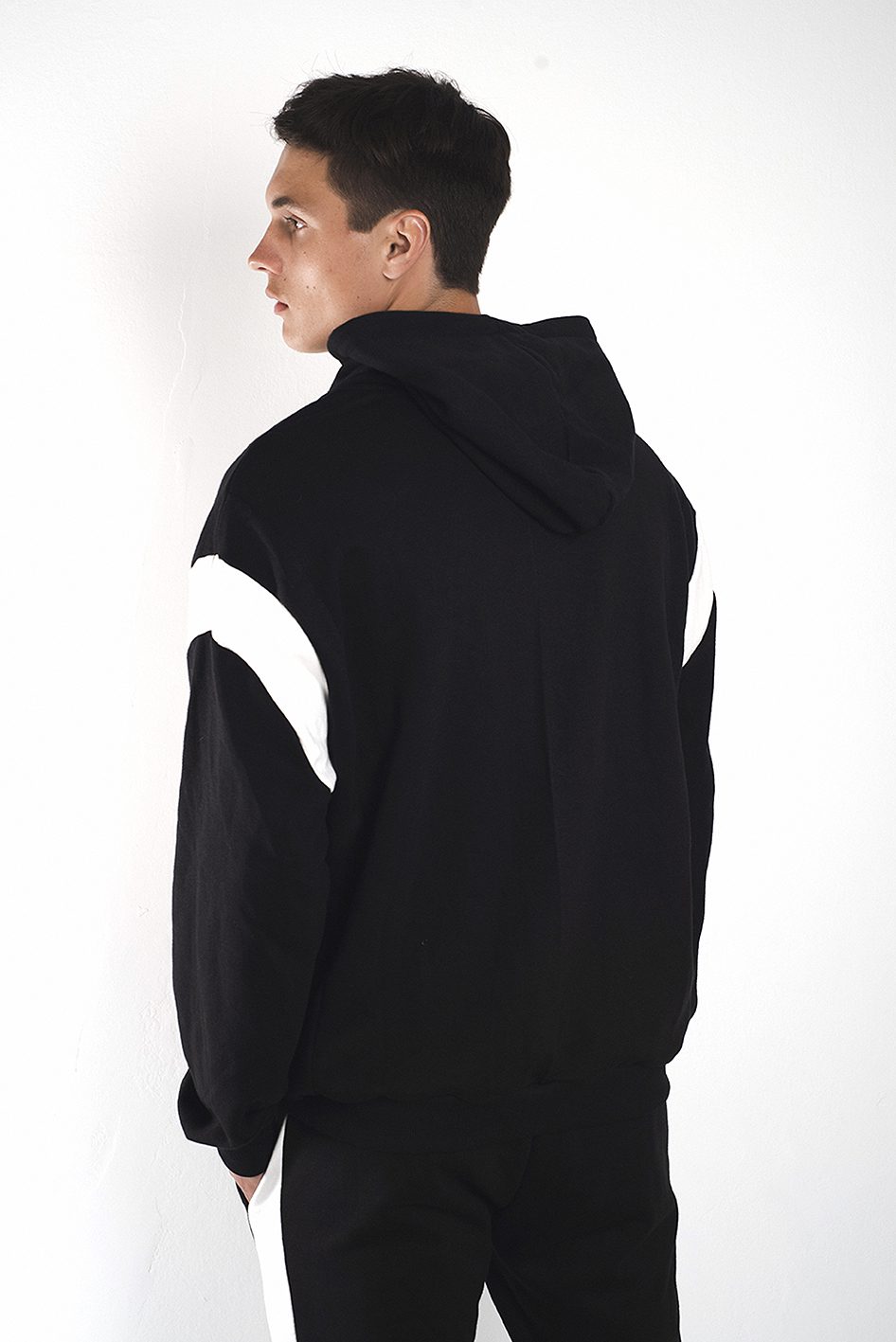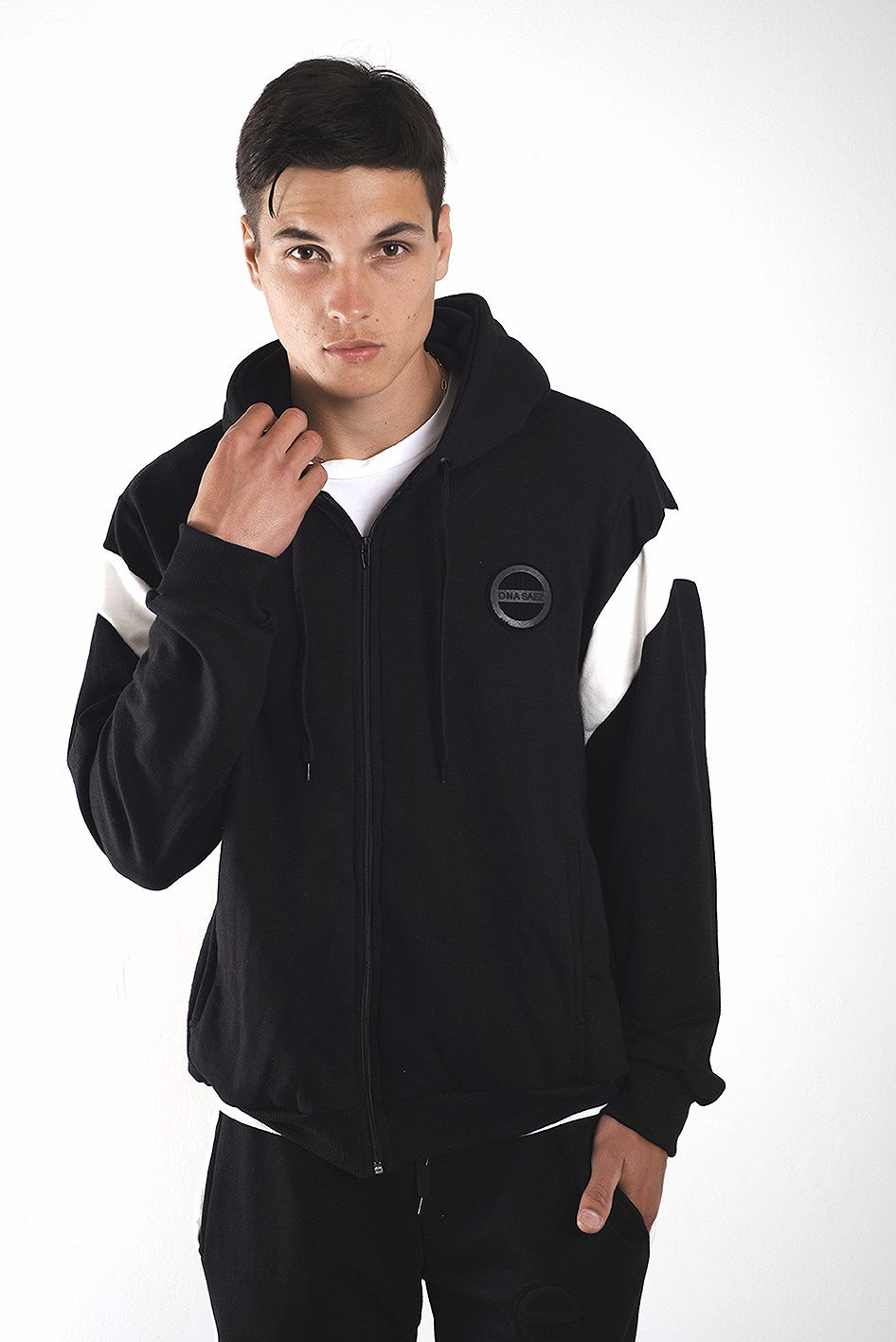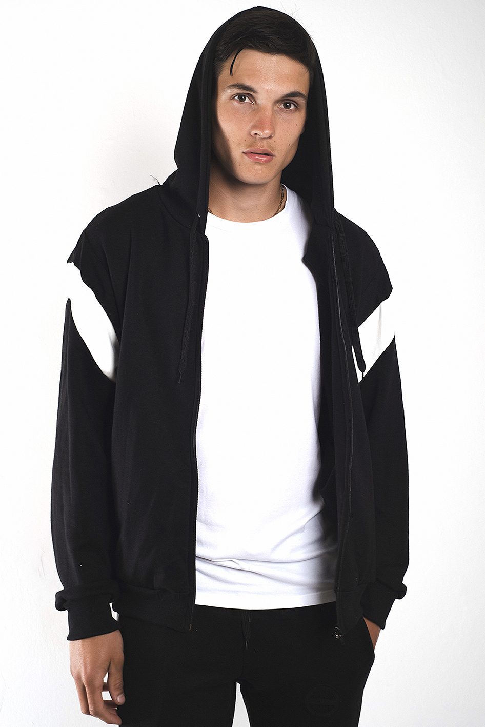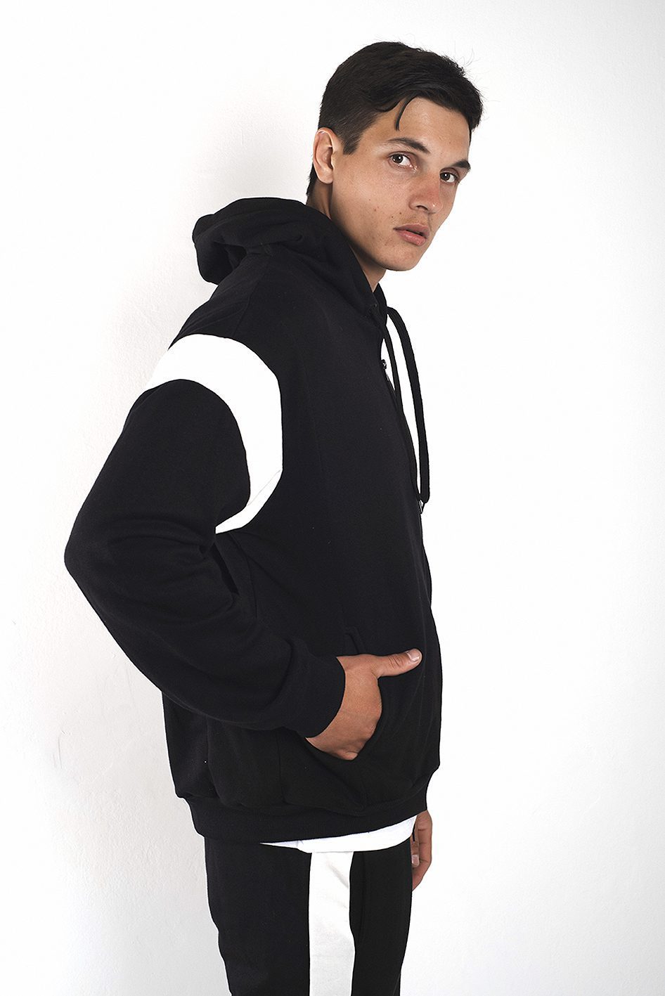 Campera de algodón rustico con capucha doble forrada, puños de morley y recortes a contra tono en las mangas.