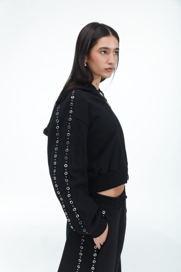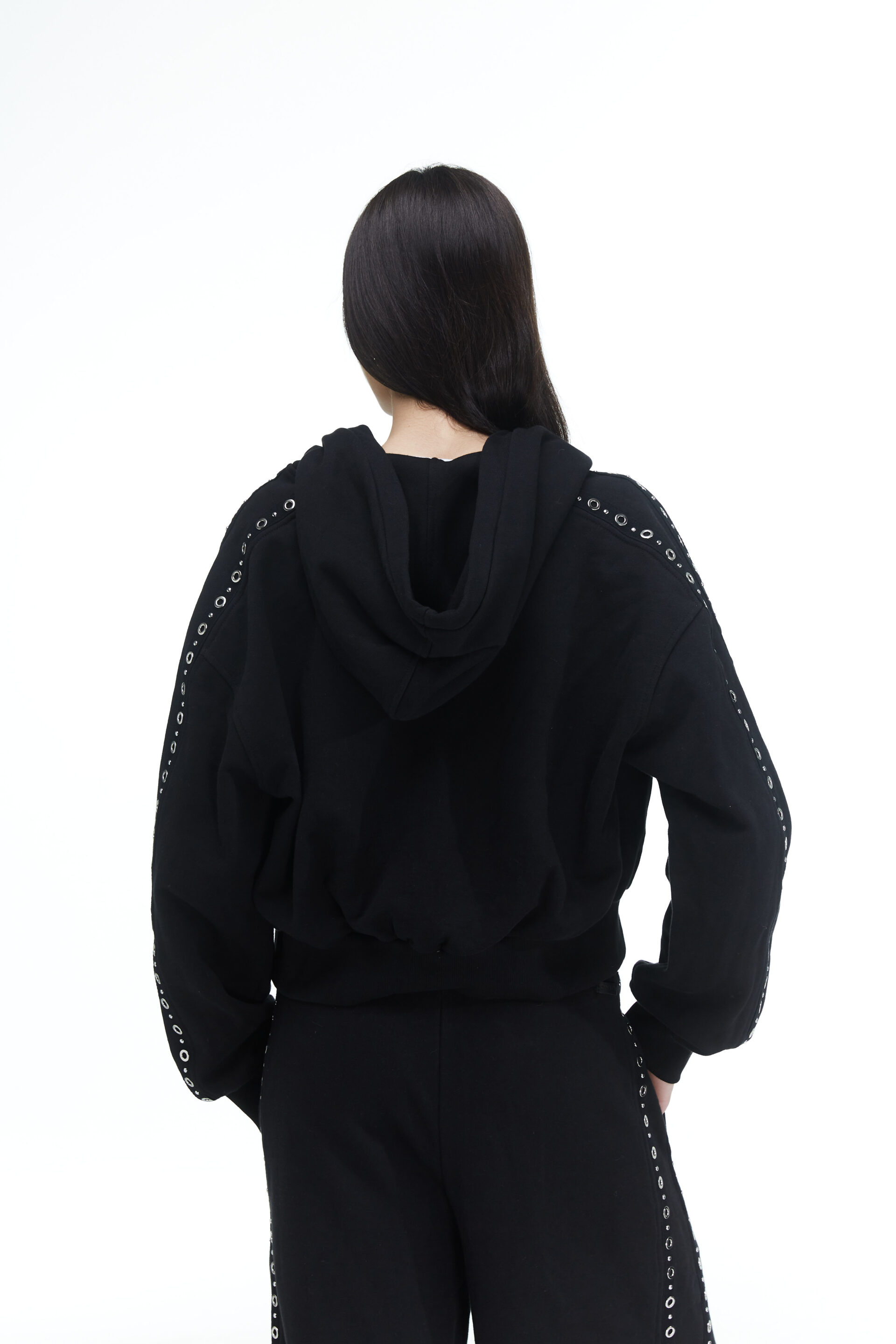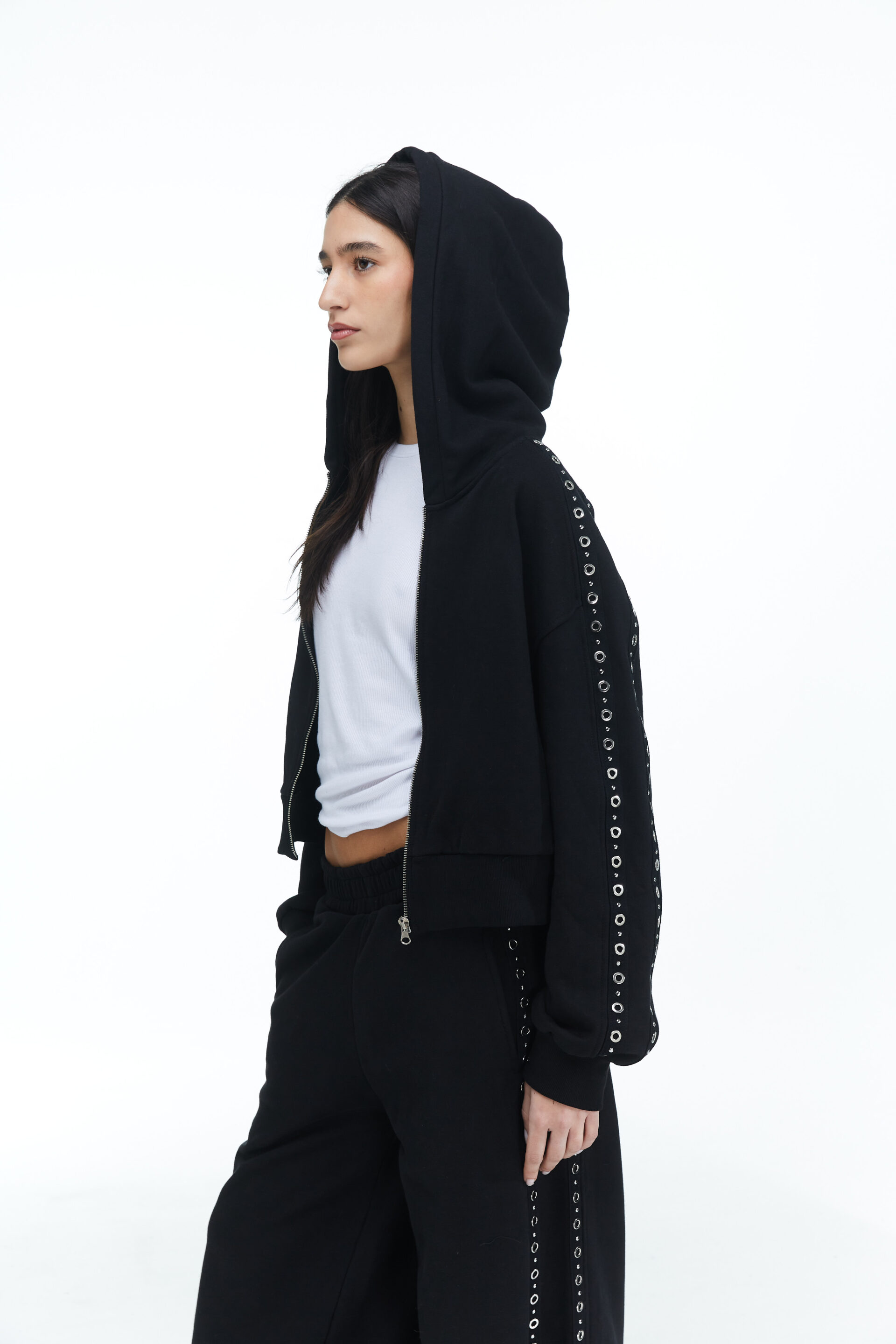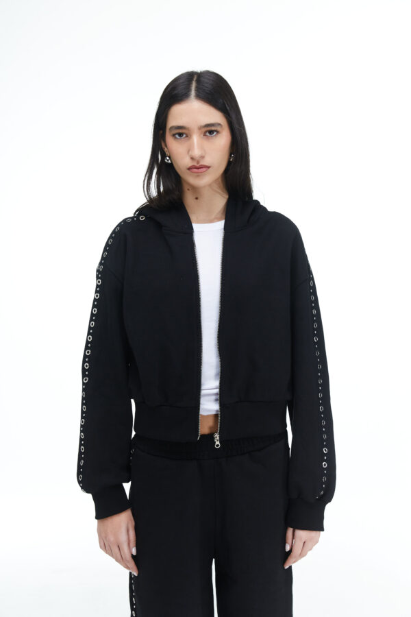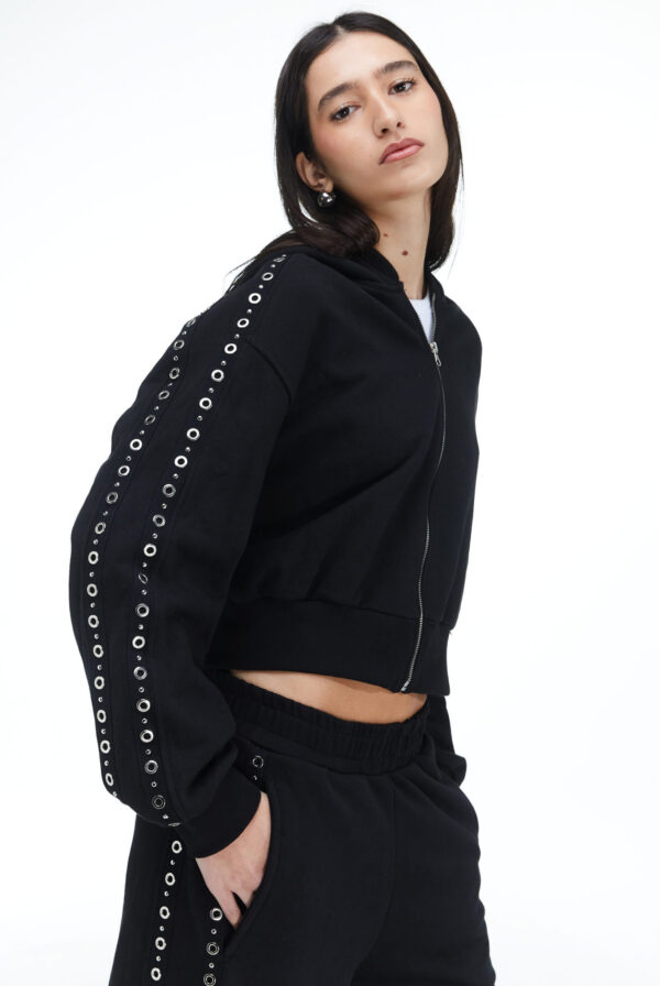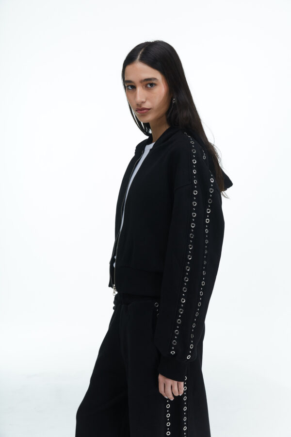 El diseño se destaca por una doble guarda lateral con apliques metálicos tipo ojal a lo largo de ambas mangas, aportando un toque canchero y moderno.