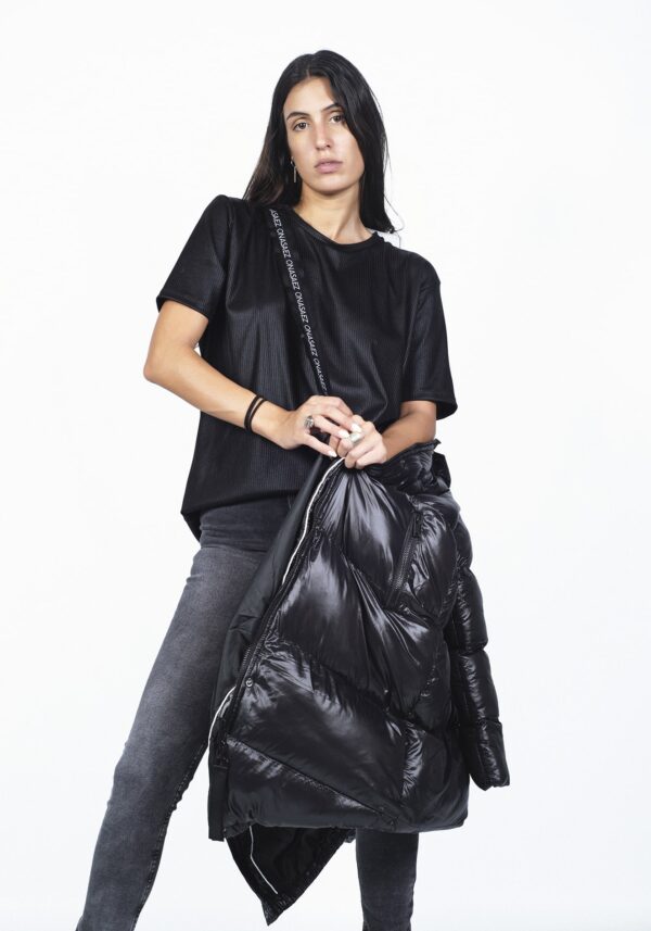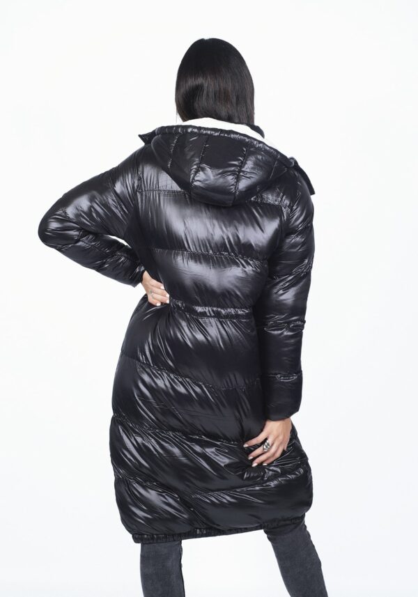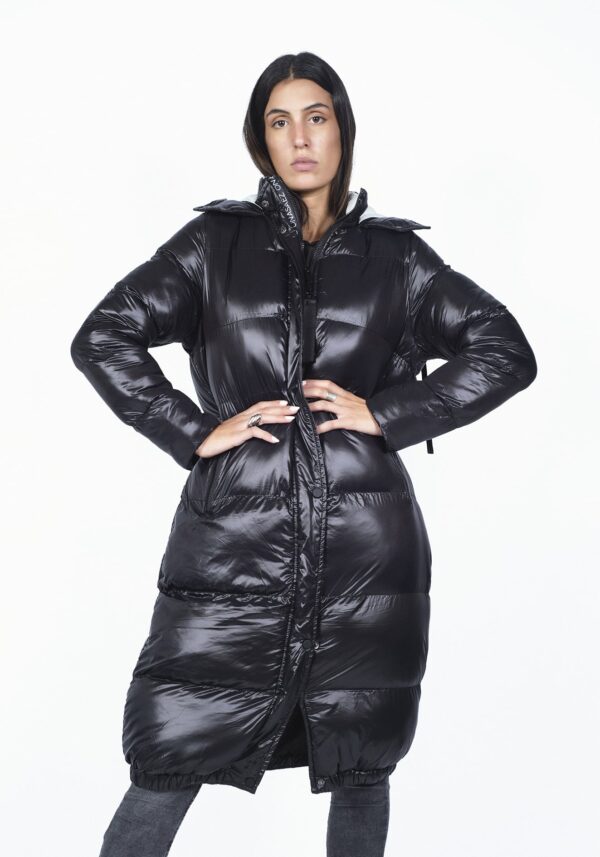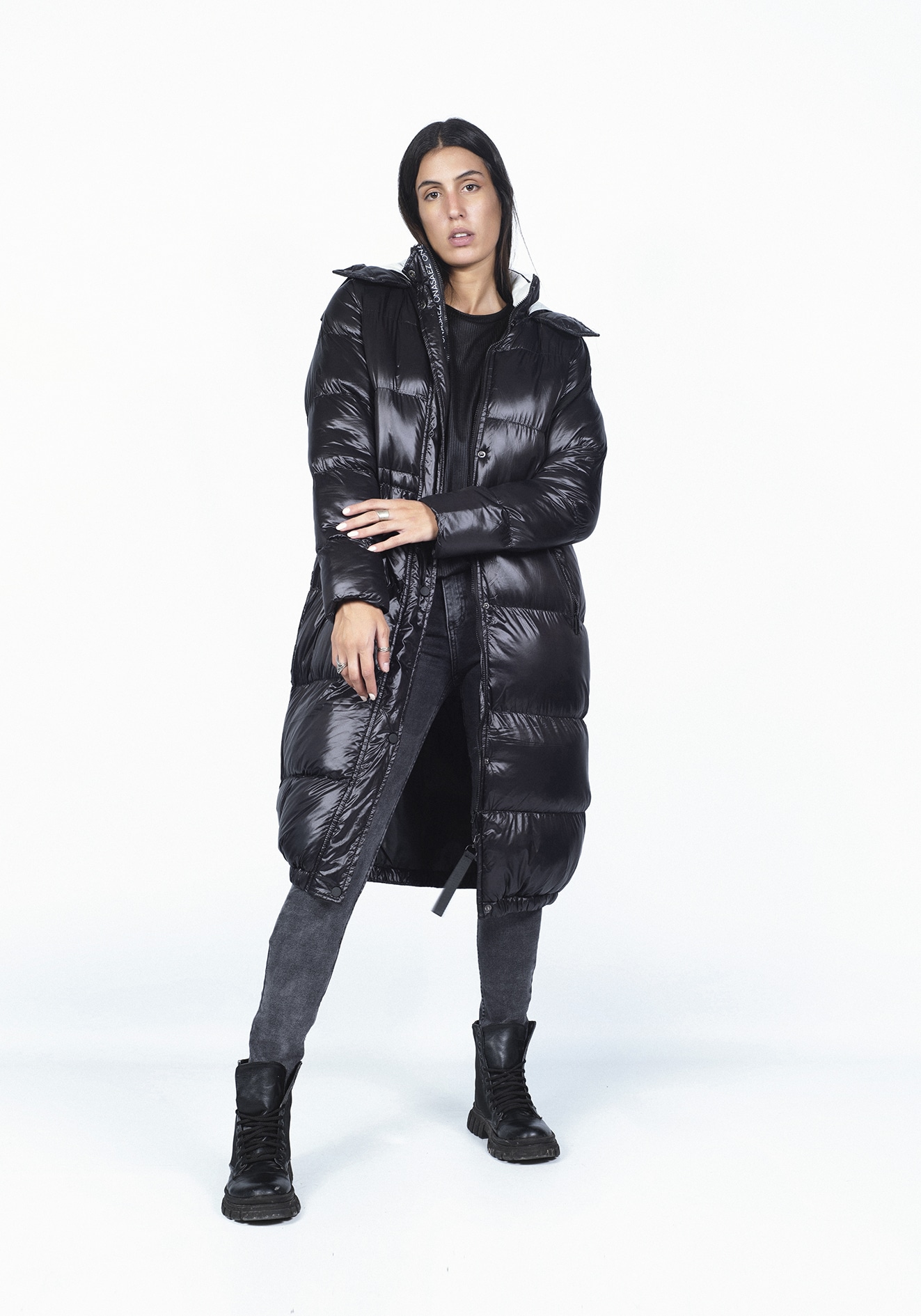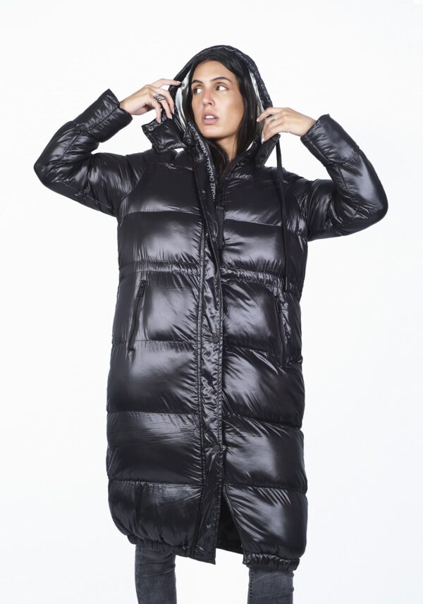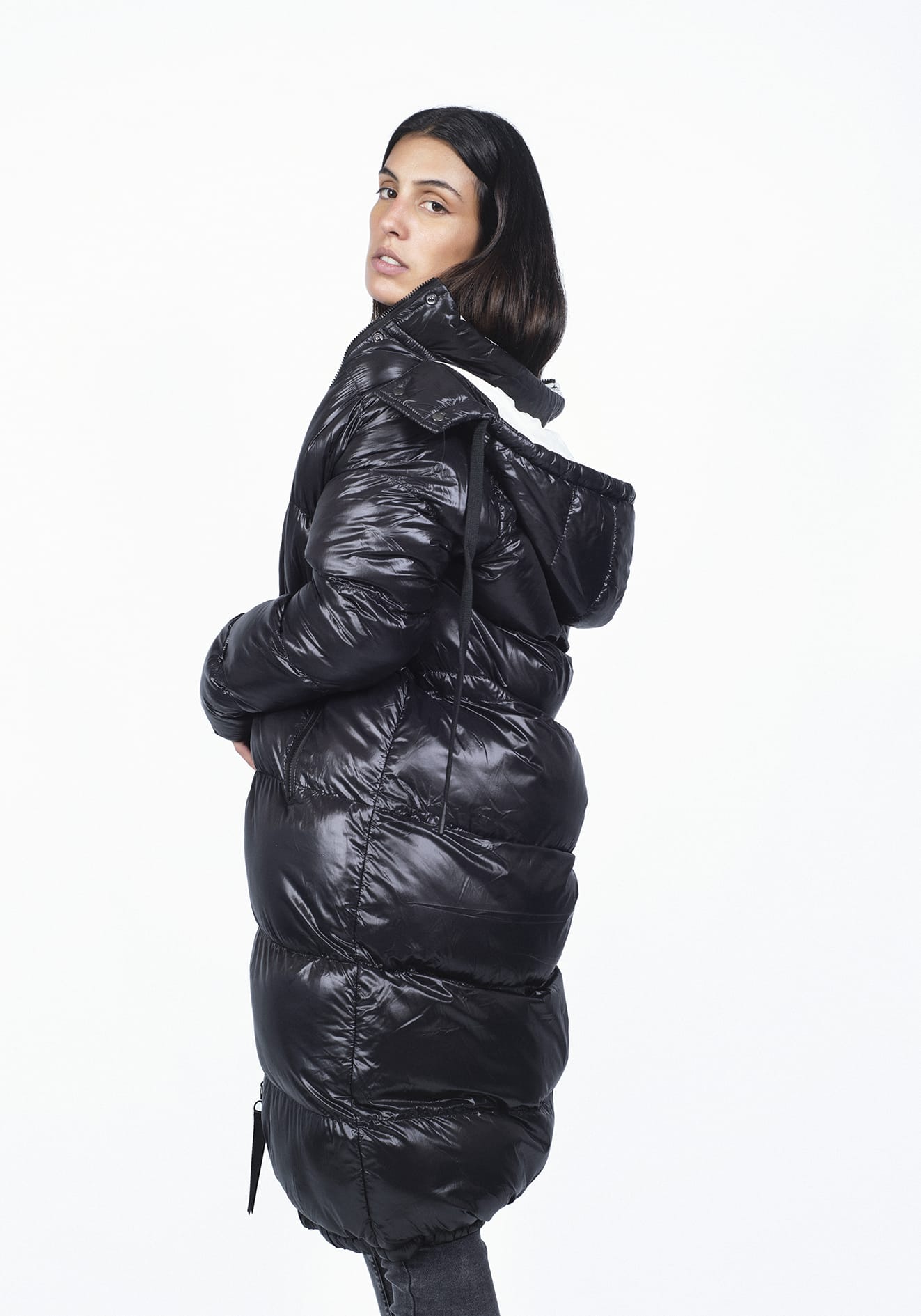 Campera larga tipo puffer, con diseño de matelasse, confeccionada en tejido de nylon brillante, con relleno de vellón siliconado color negra.