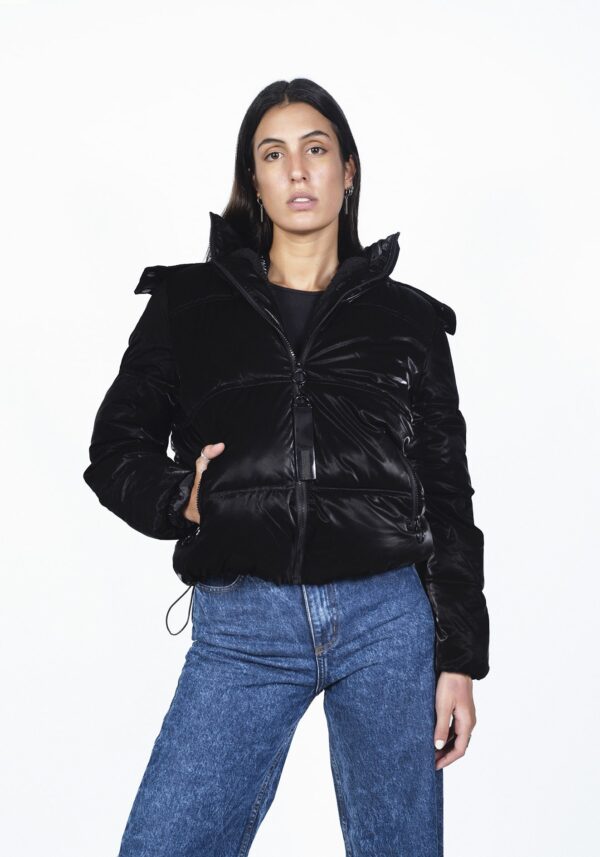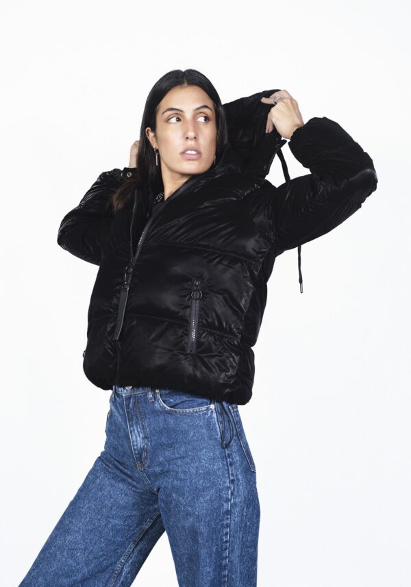Campera corta puffer con diseño de matelasse, confeccionada en tejido de nylon gamuzado, con relleno de vellón siliconado color negra.